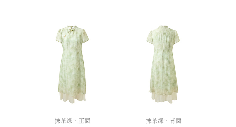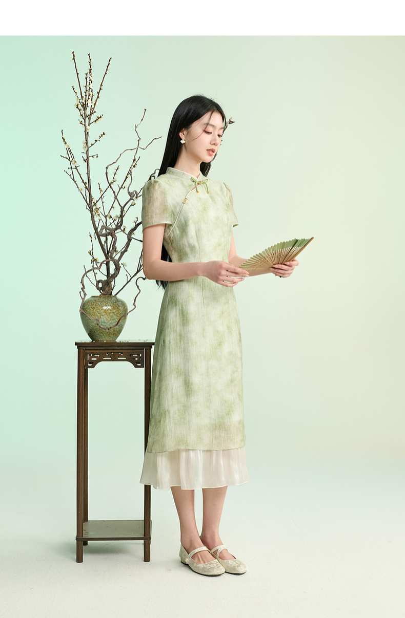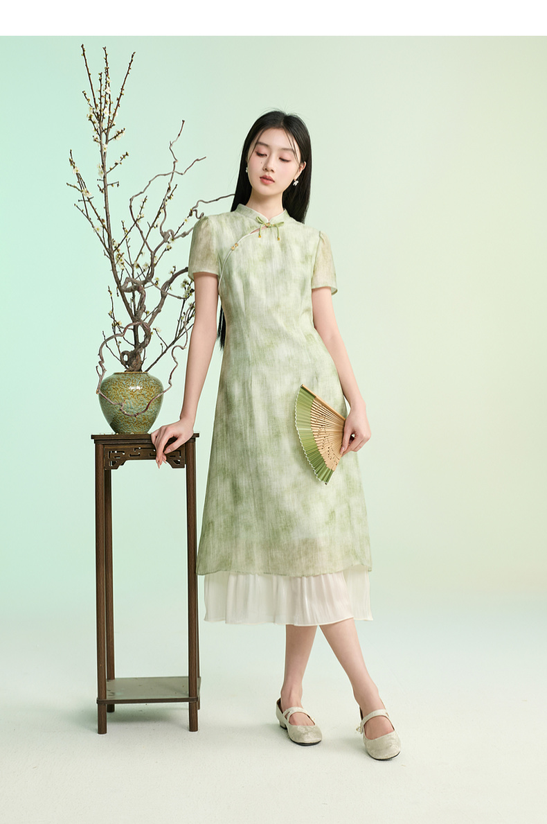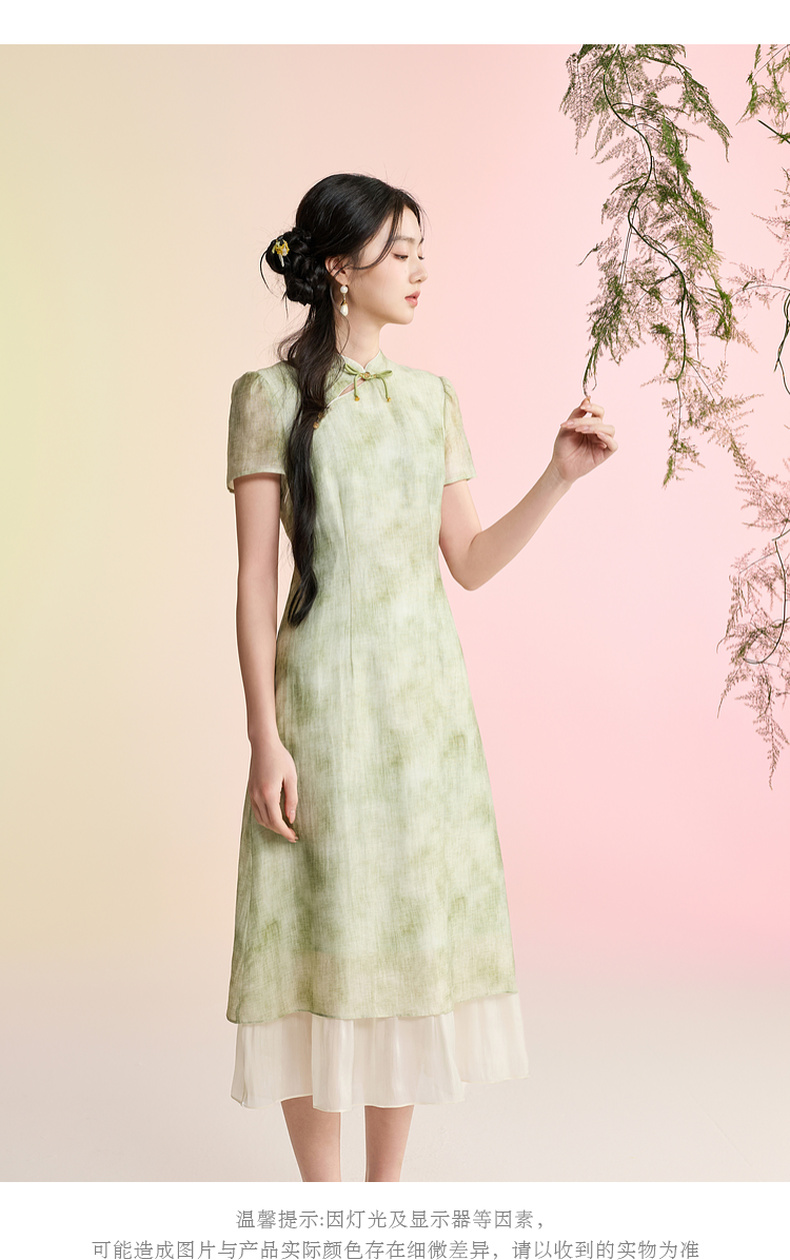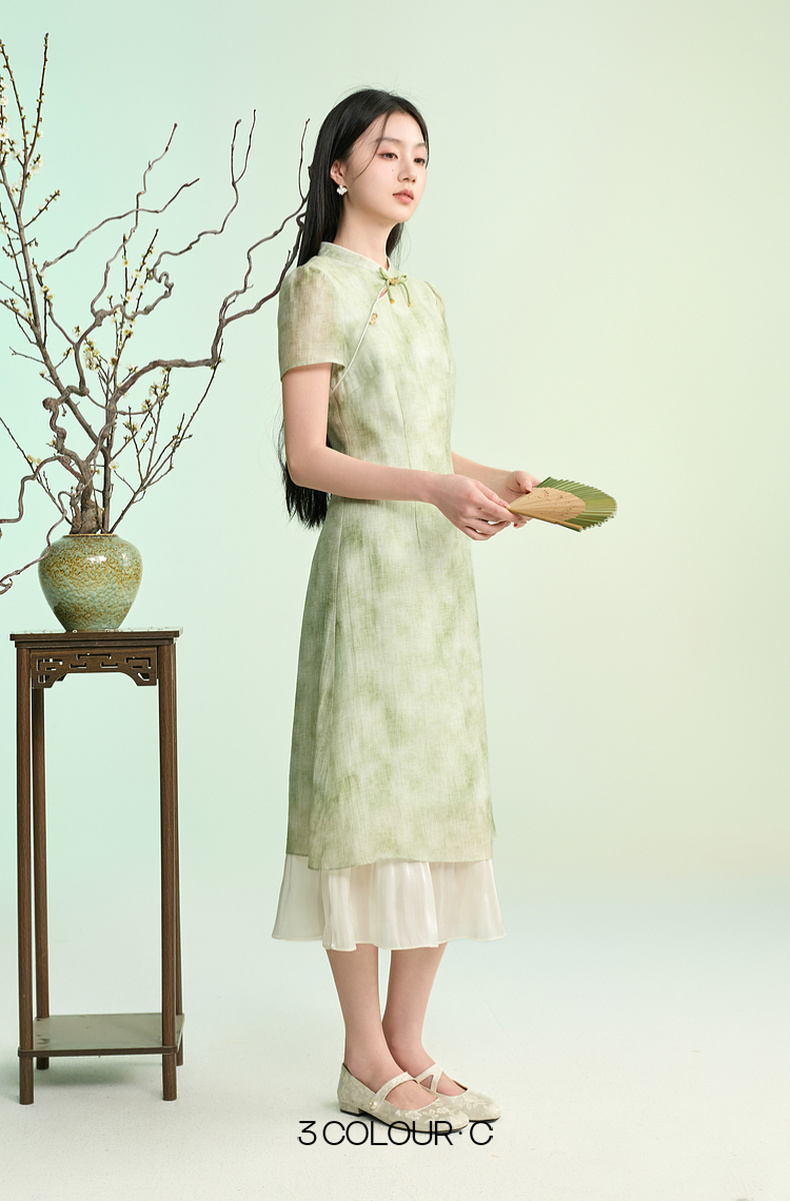三彩【柳色含烟】2026春季新款新中式连衣裙假两件拼接长裙C
