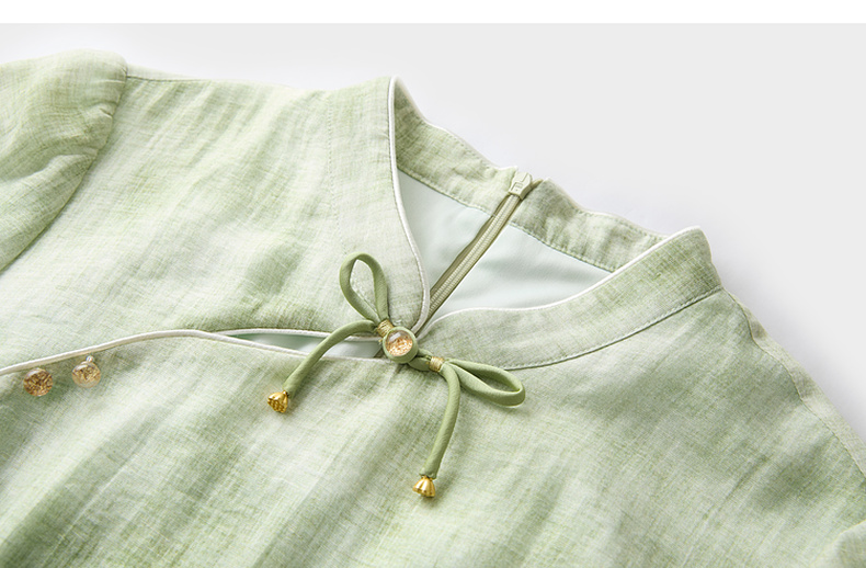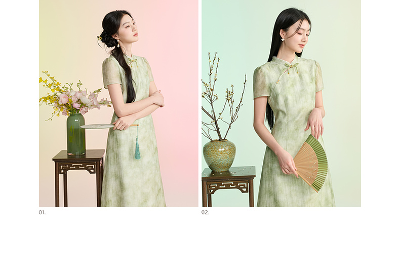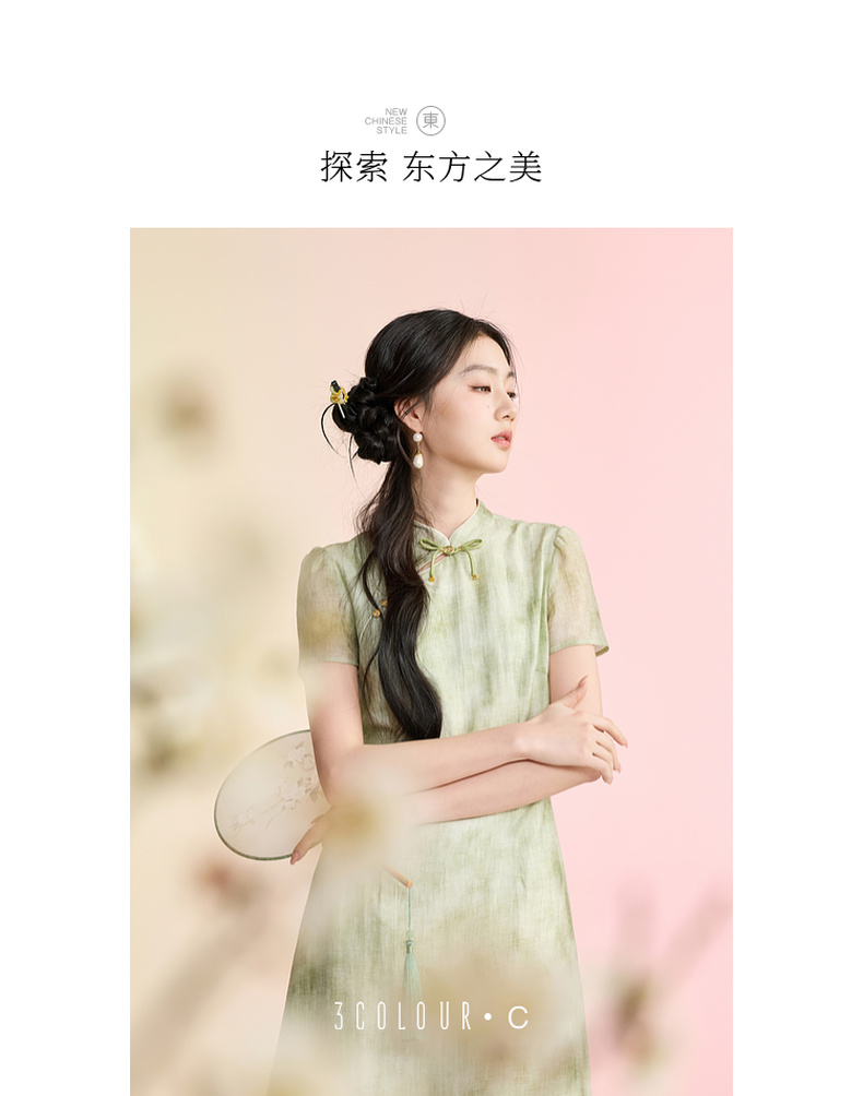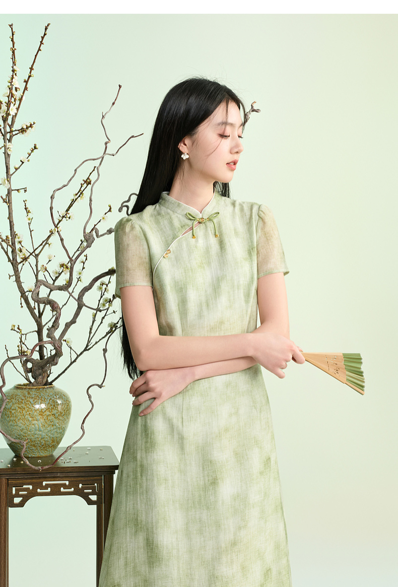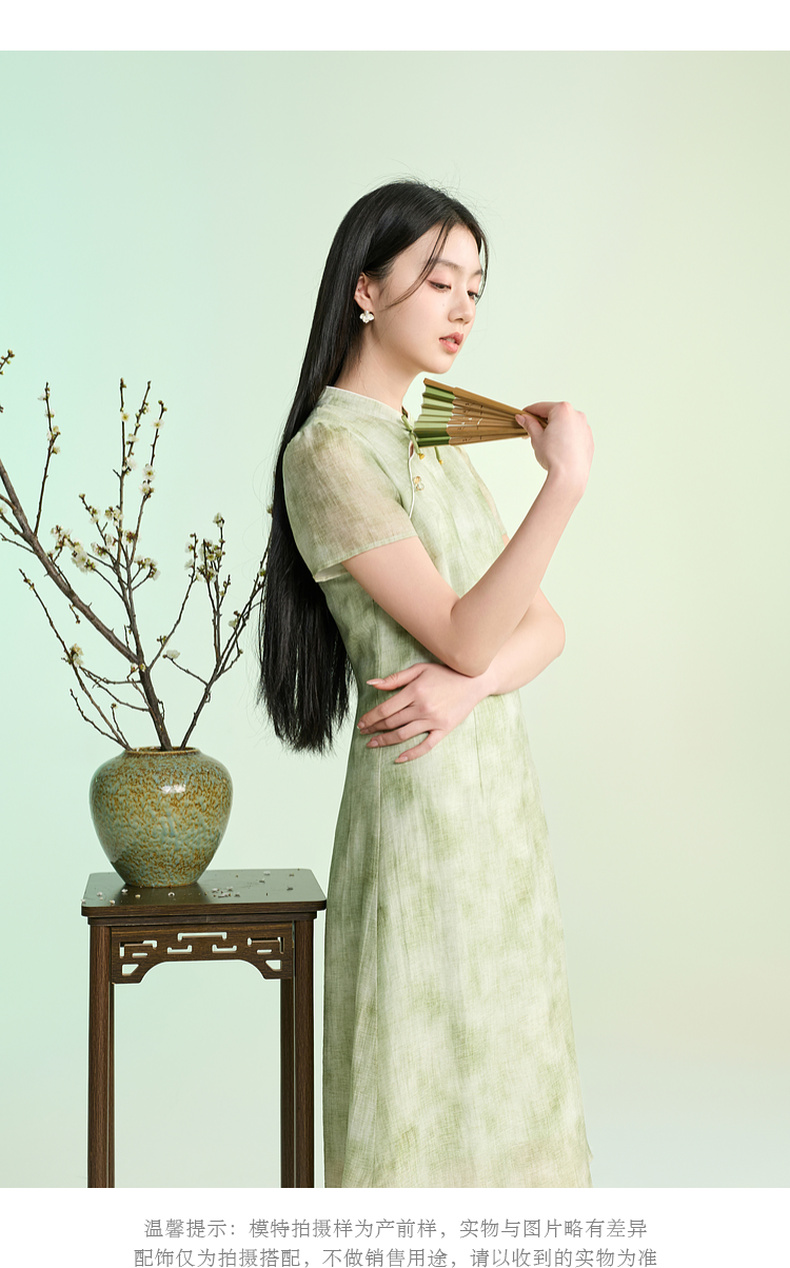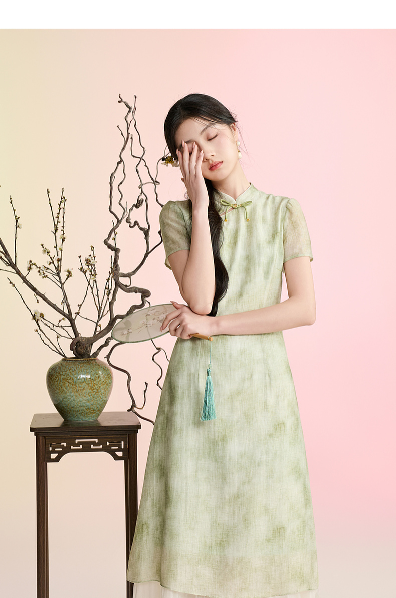 三彩【柳色含烟】2026春季新款新中式连衣裙假两件拼接长裙C
