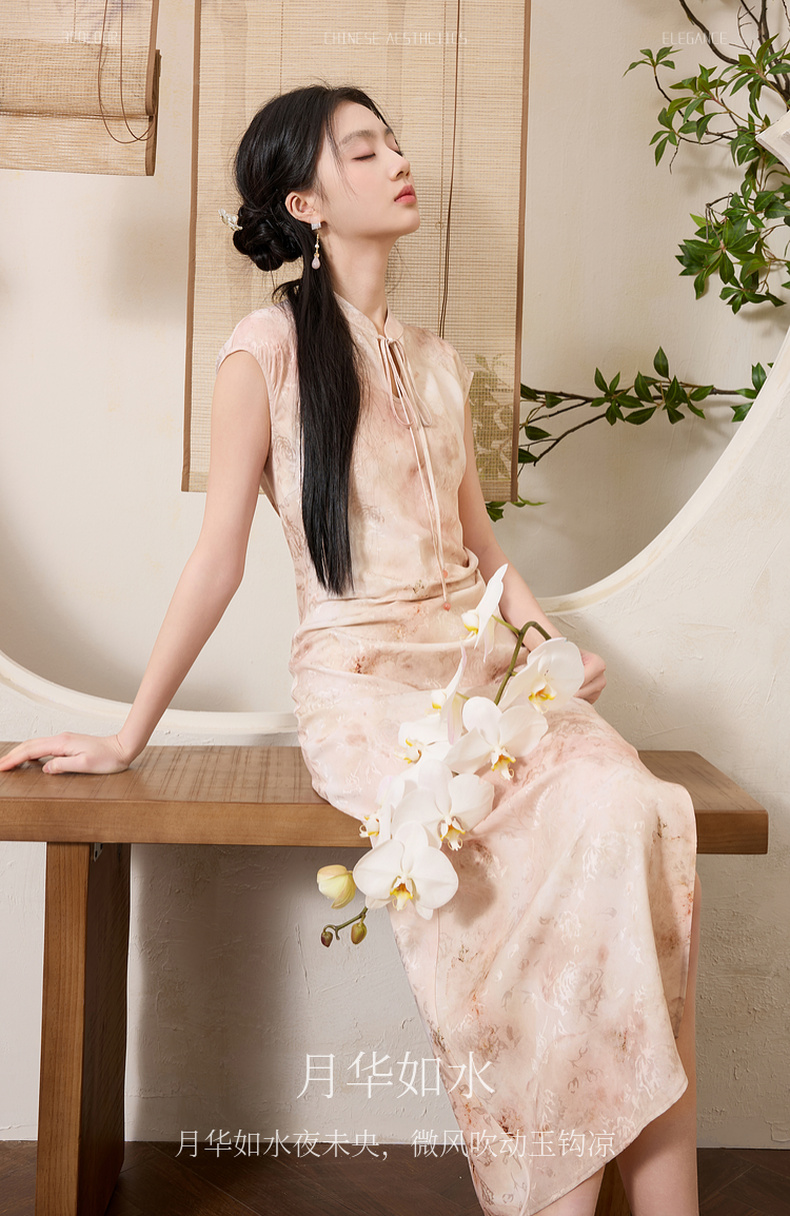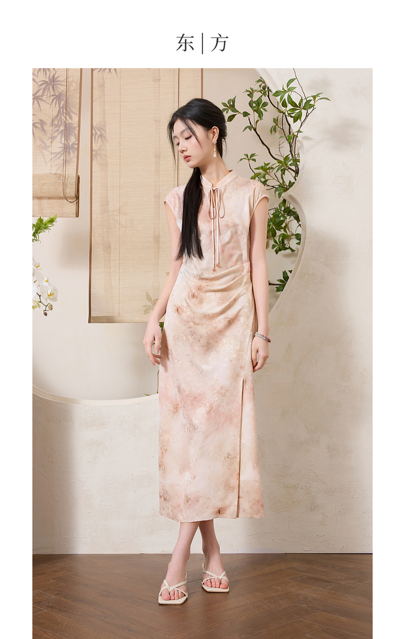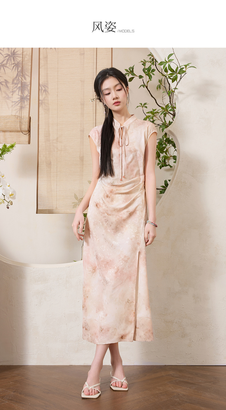 三彩【月华如水】2025夏季新款新中式旗袍连衣裙开叉长裙系带立领C