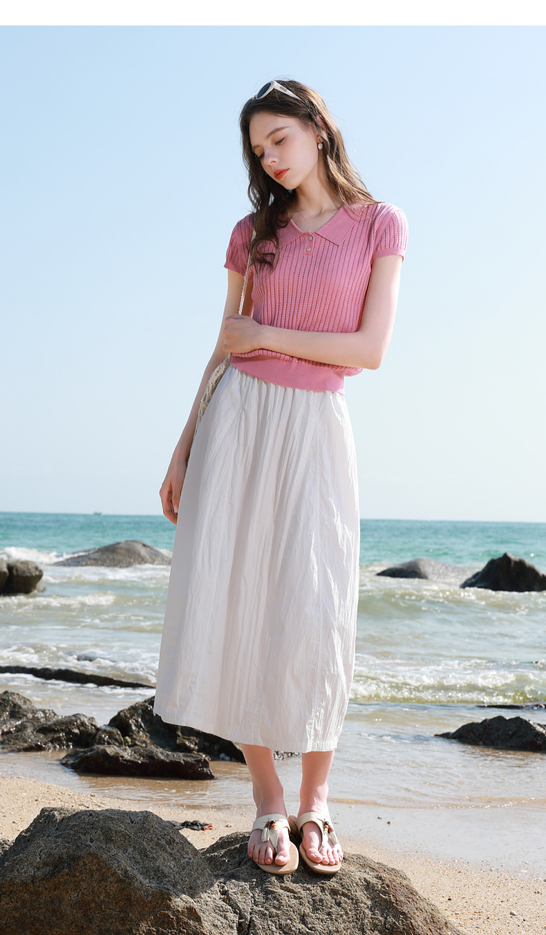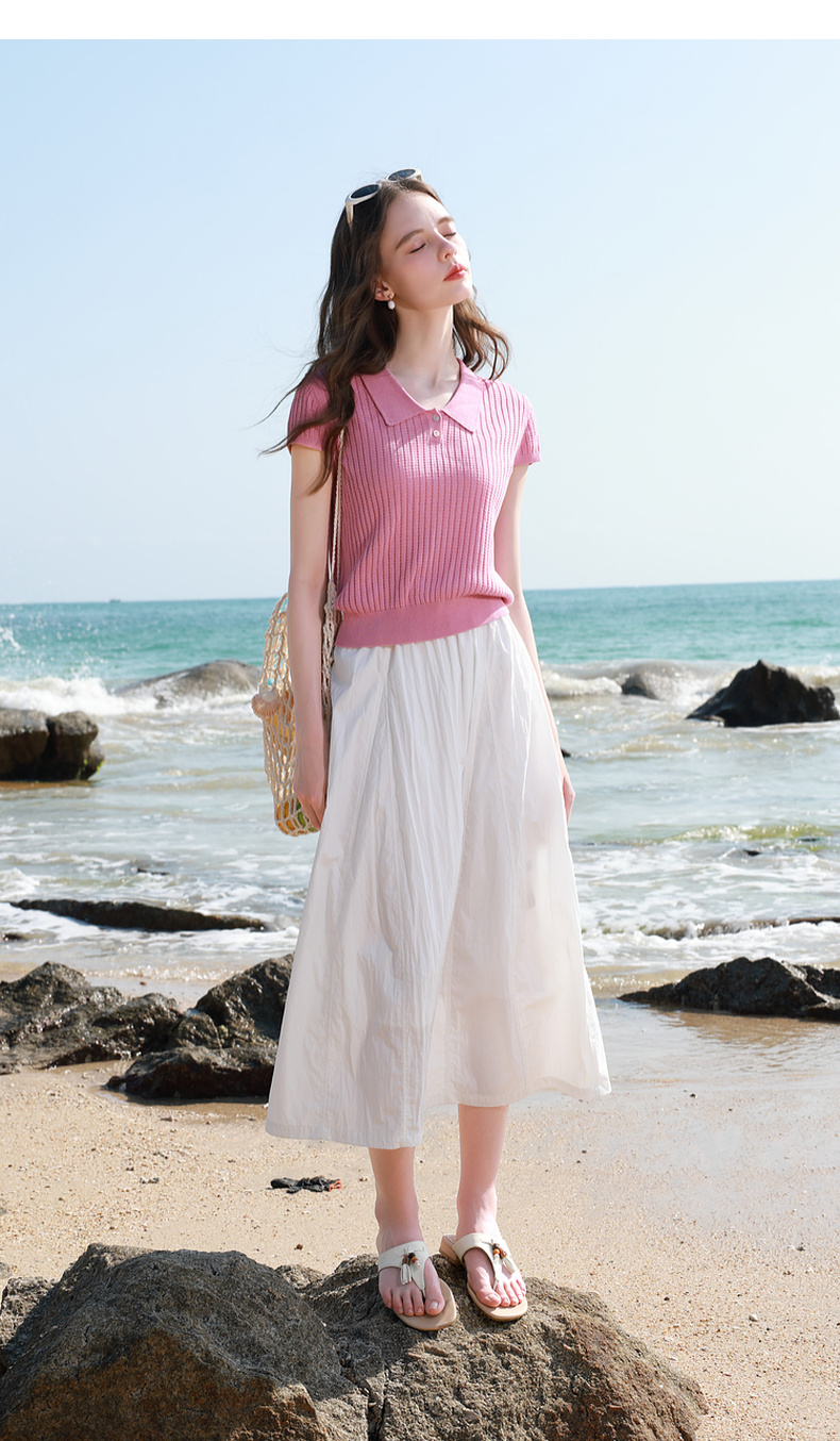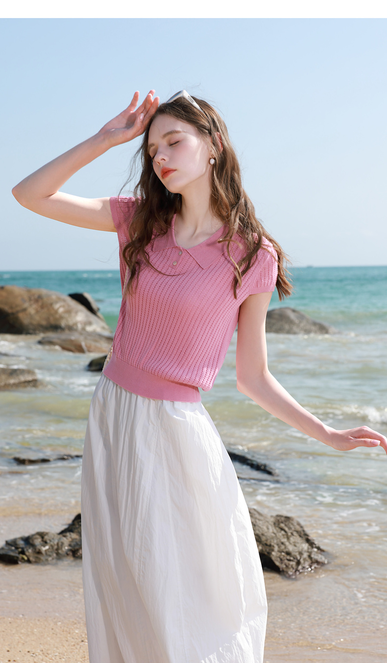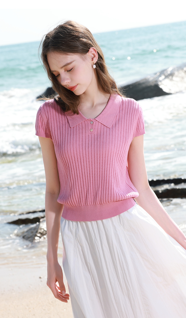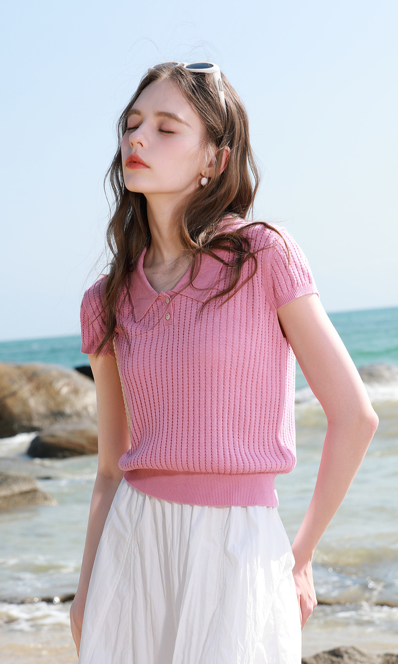 三彩2026春季新款镂空坑条针织衫套头polo衫短袖翻领上衣M