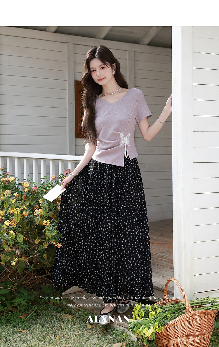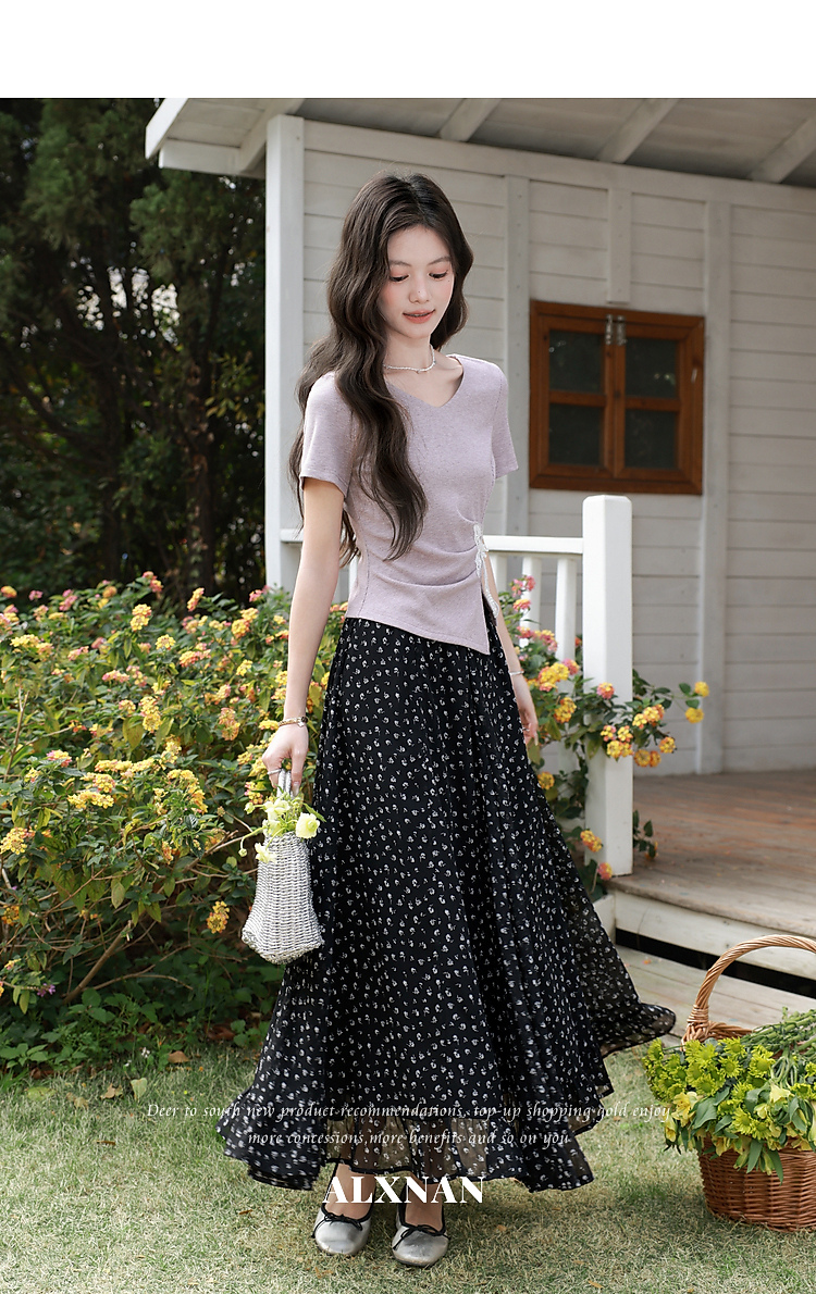 鹿向南「馥郁晚香」夏季新款黑色碎花半身裙女优雅气质A字中长裙