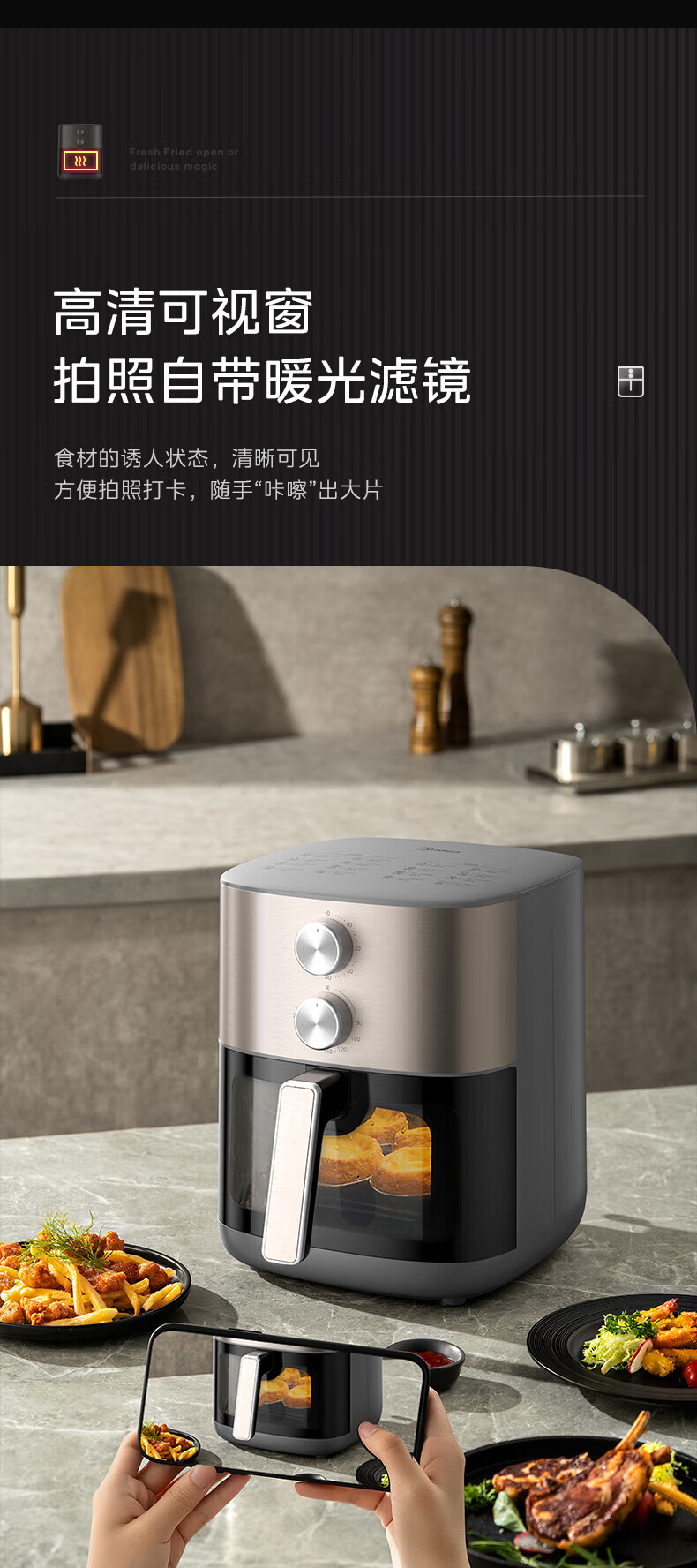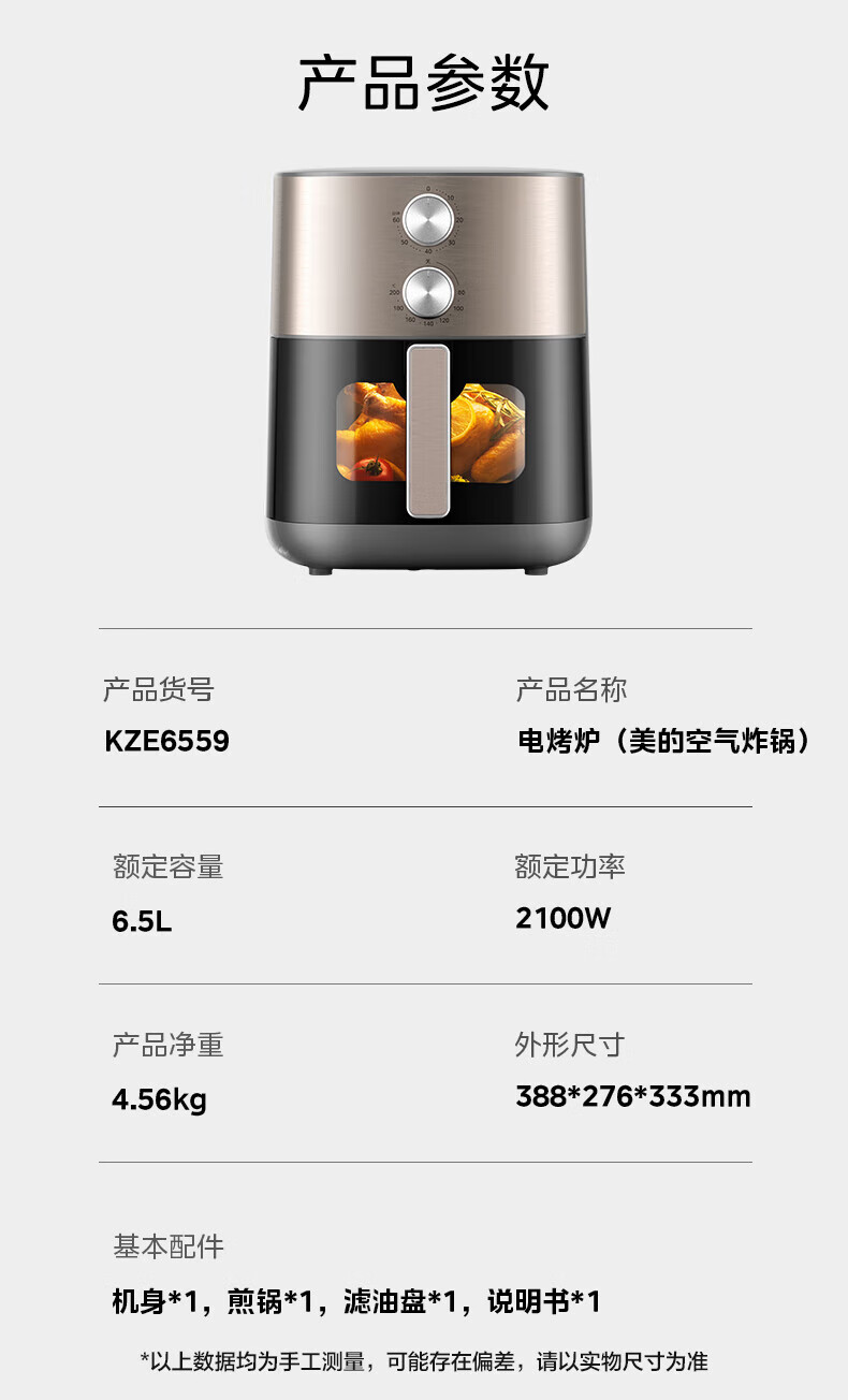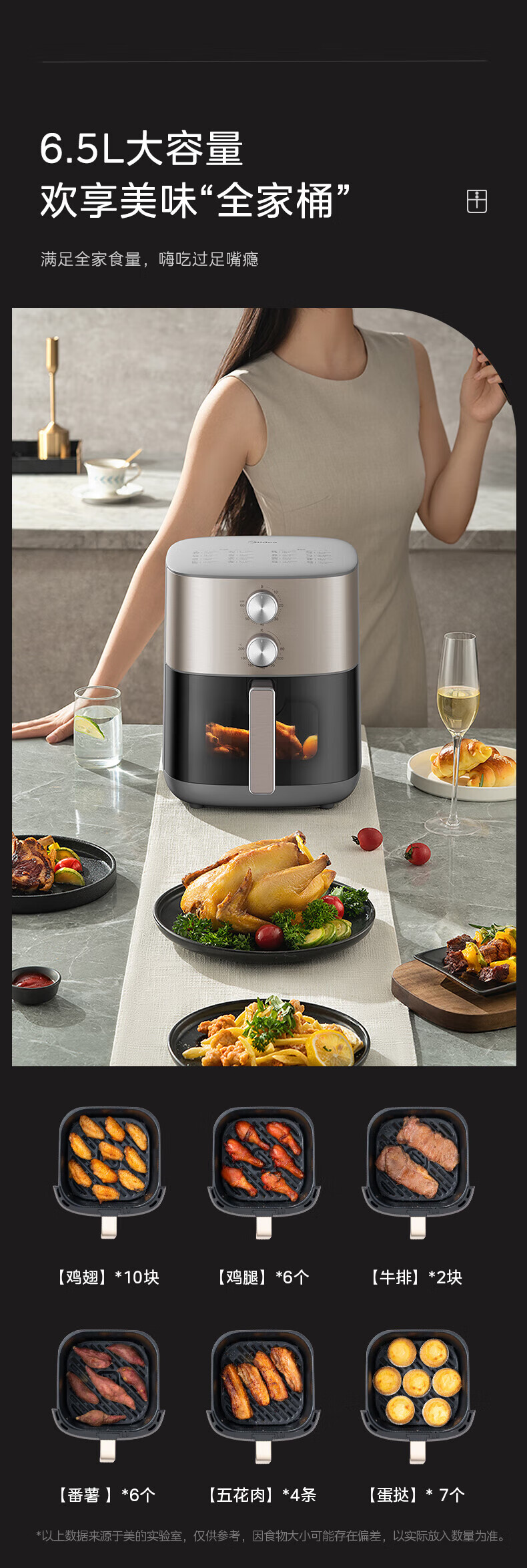 美的(Midea)空气炸锅不用翻面大容量透明可视家用智能电炸锅烤箱一体机 全金属内腔双旋控温不沾易清洗 MF-KZE6559【双热源匀烤】 6.5L
