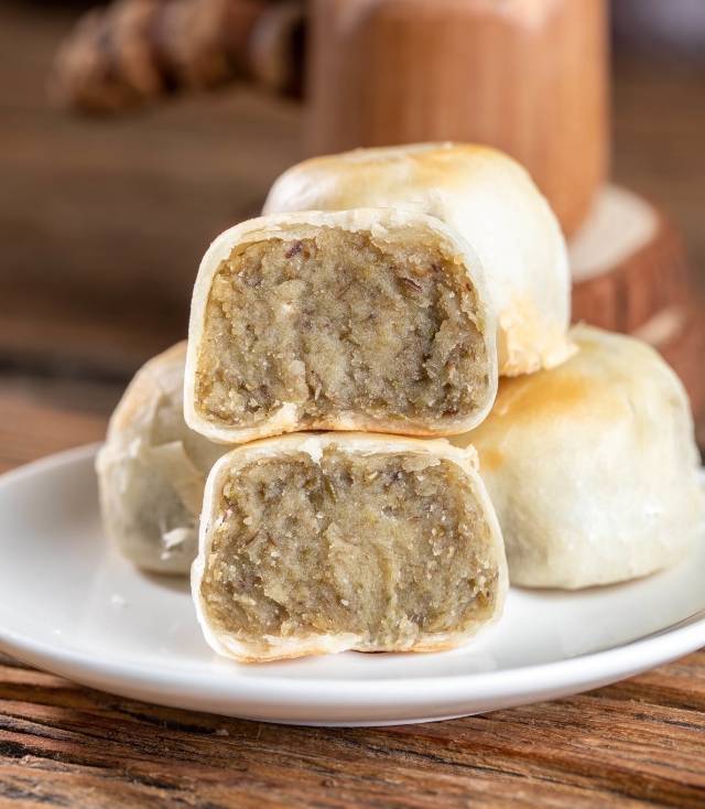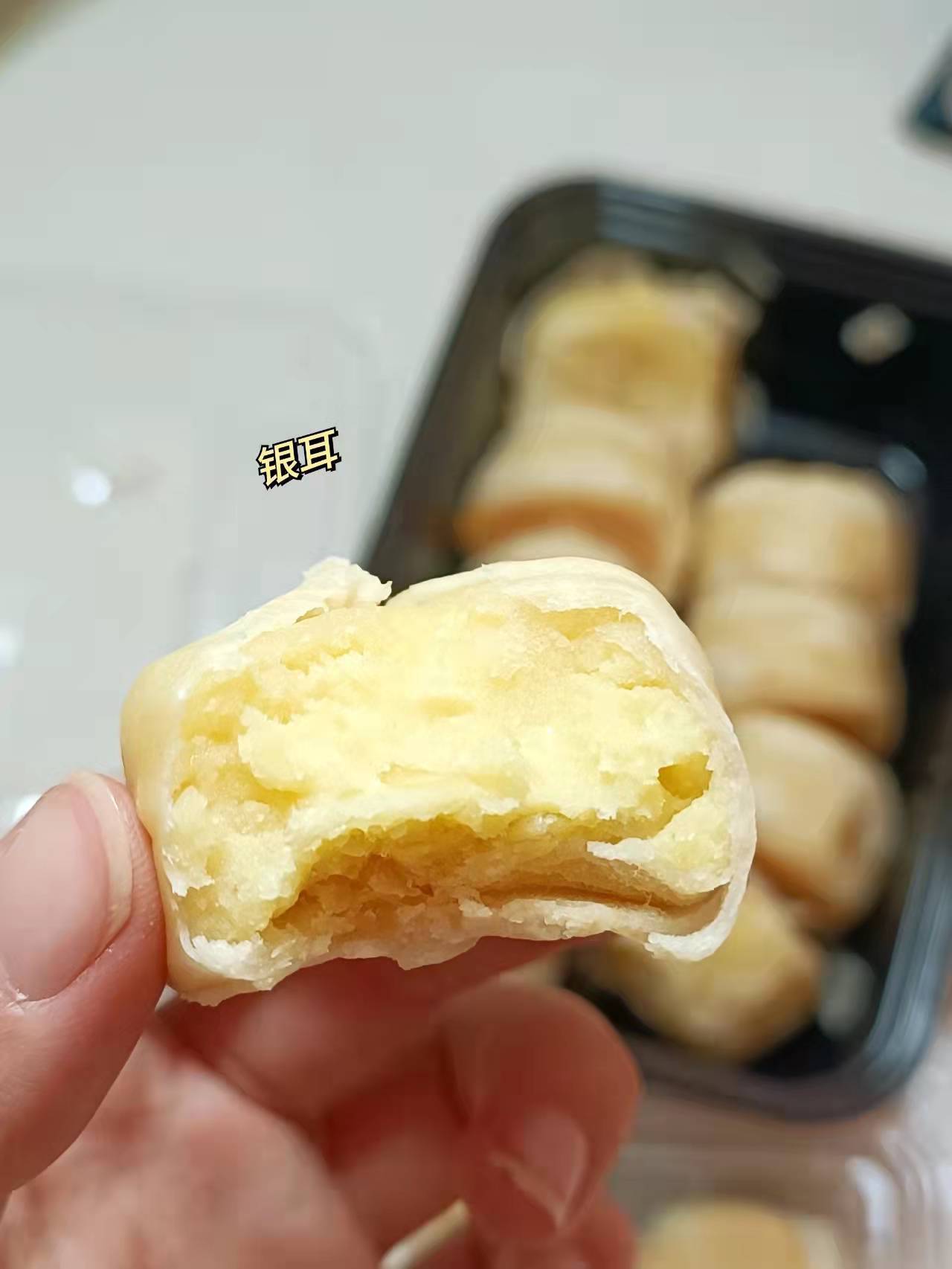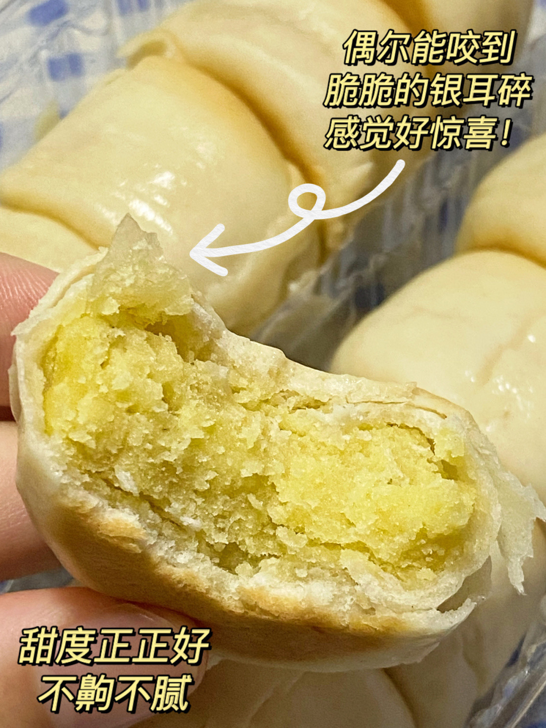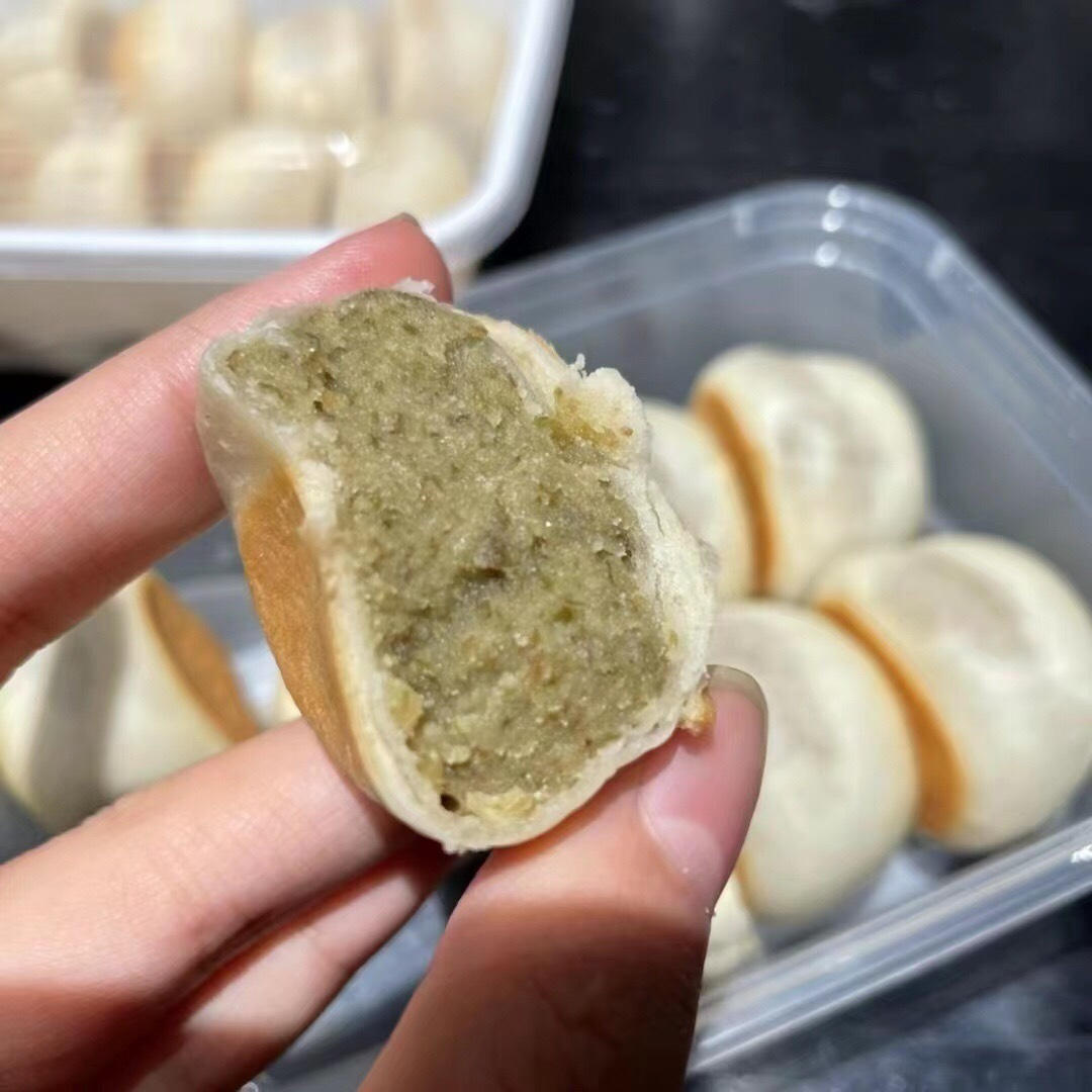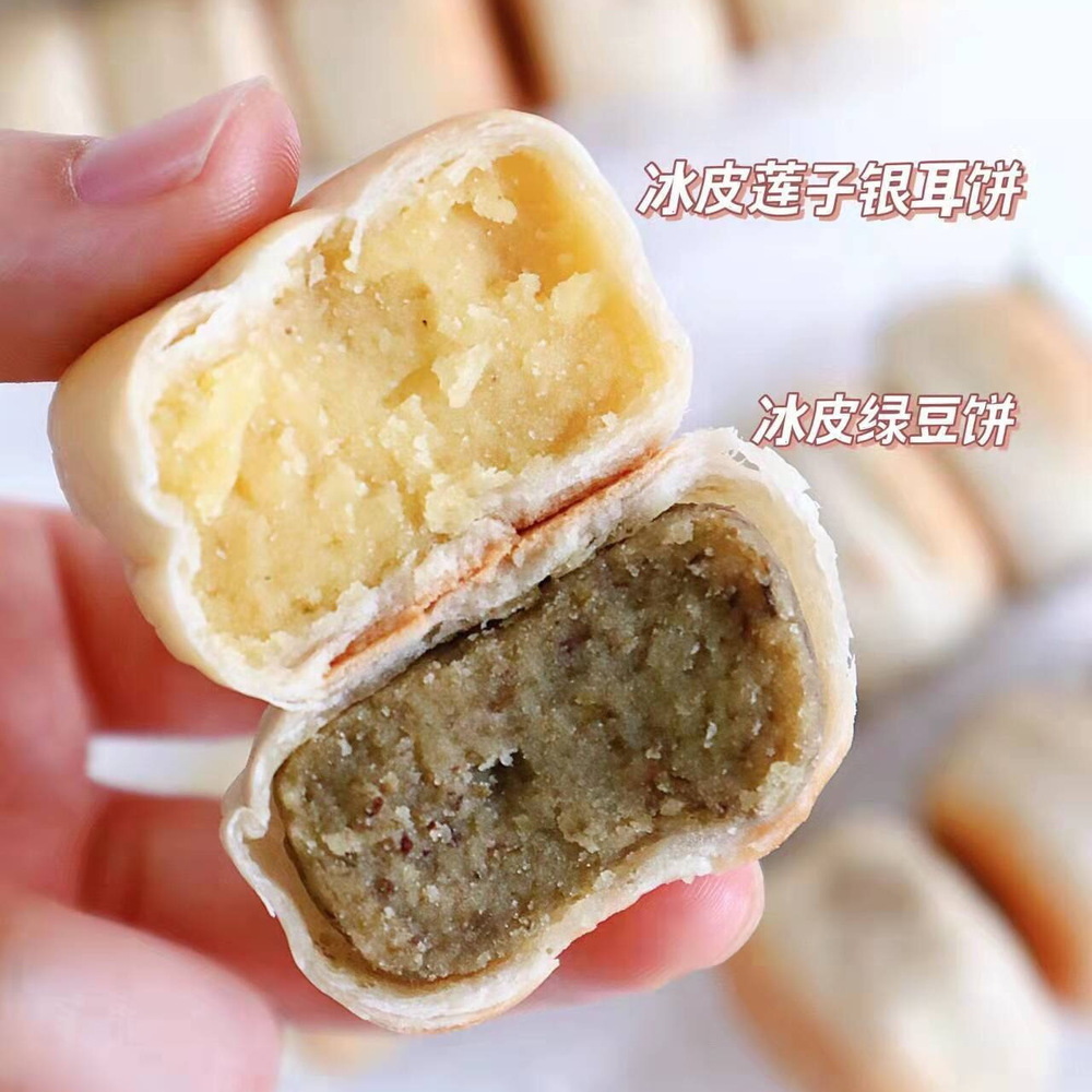💛莲子银耳饼:这个口味市面上比较少见,绿豆馅里中间掺杂些许银耳~一口下去,糯糯的、脆脆的,很微妙~