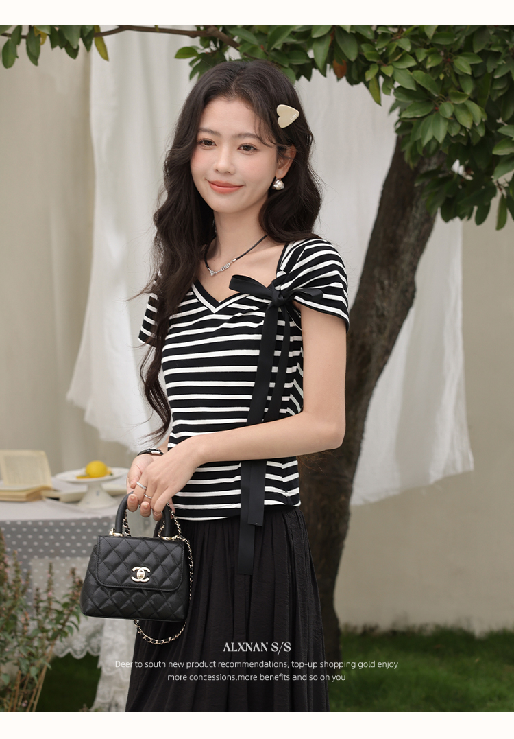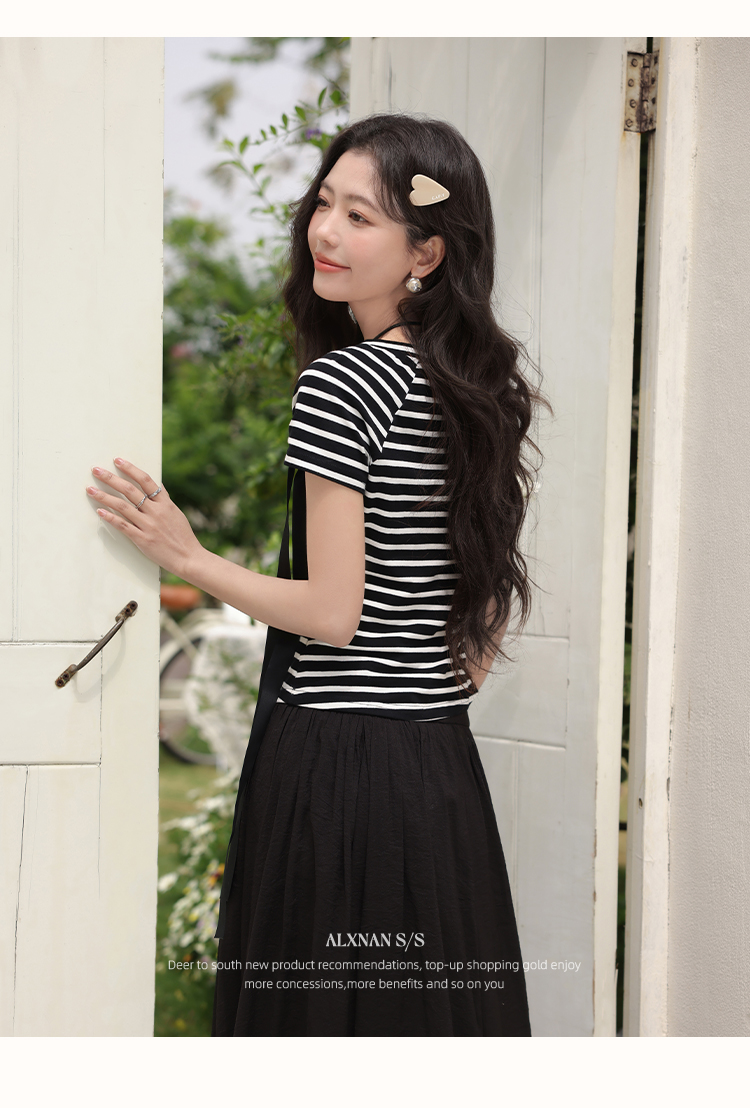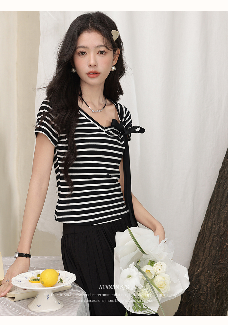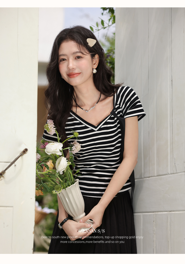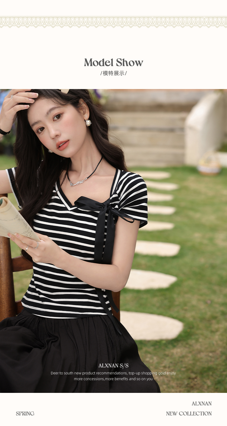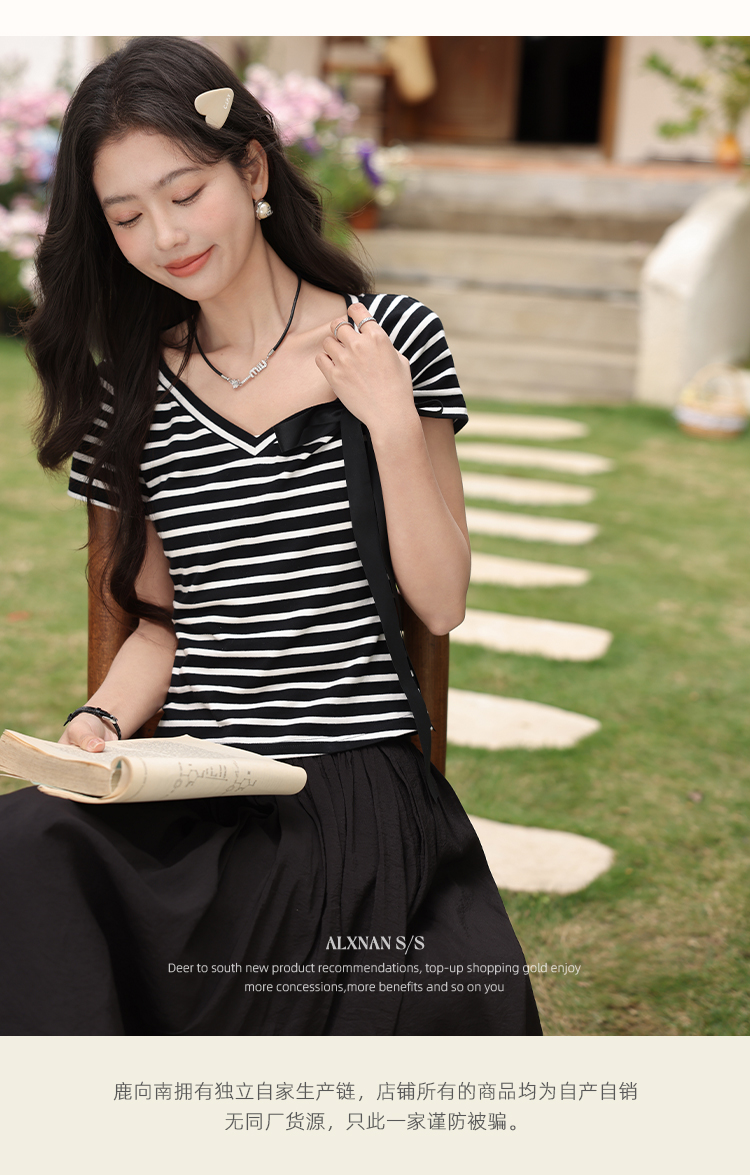 鹿向南「甜柔夏调」黑色条纹短袖T恤2025夏装新款时尚宽松上衣女L53925