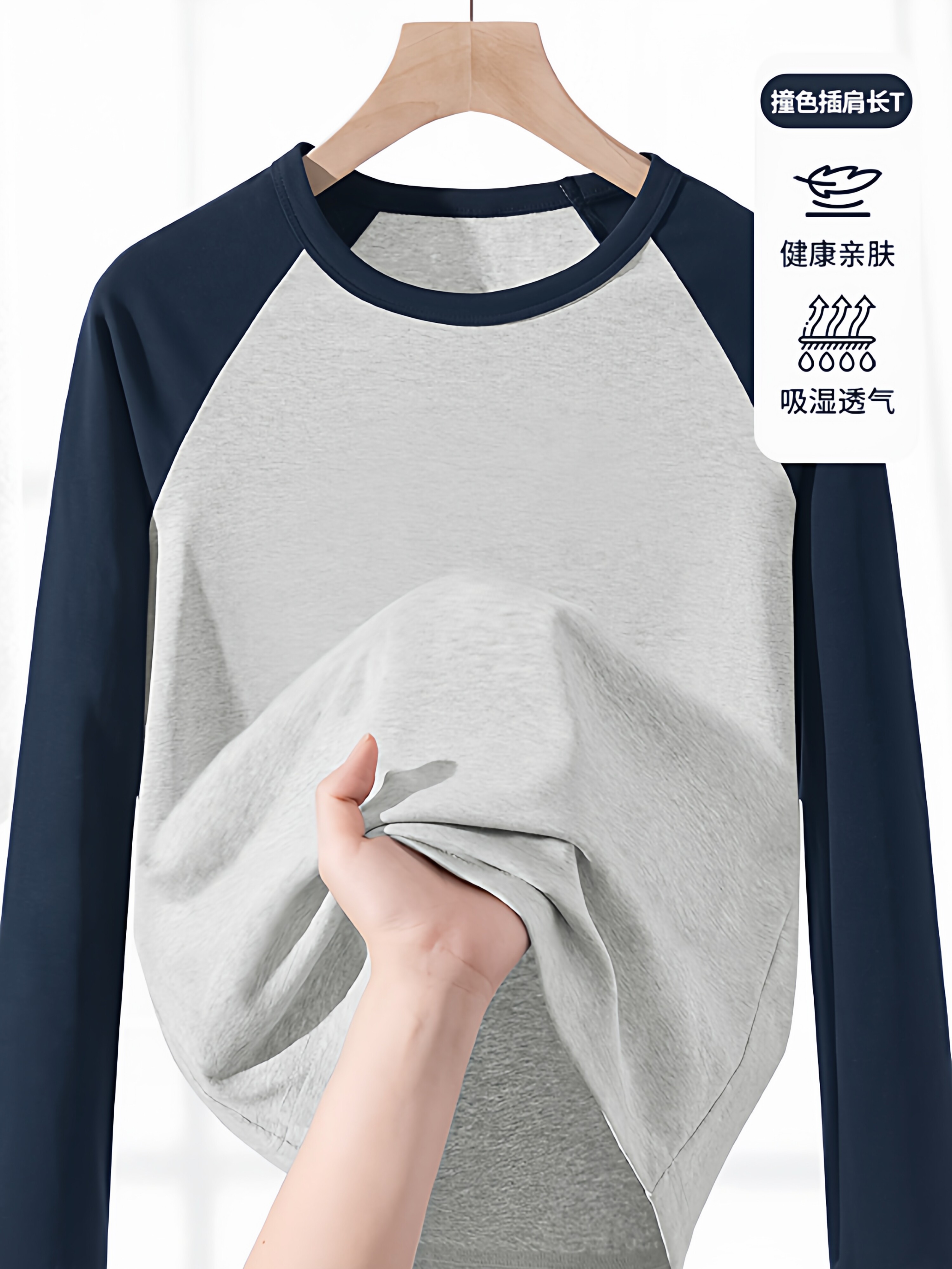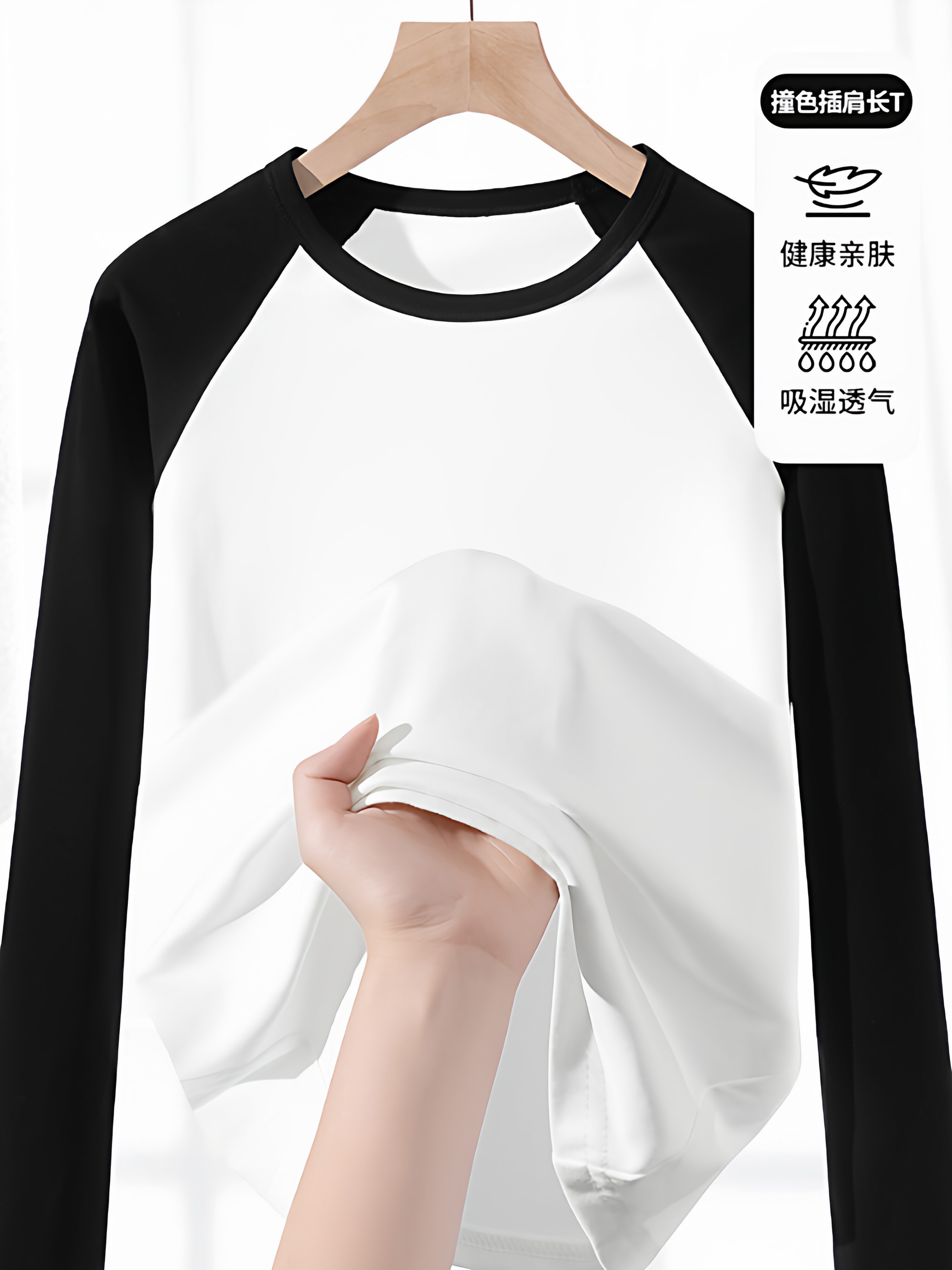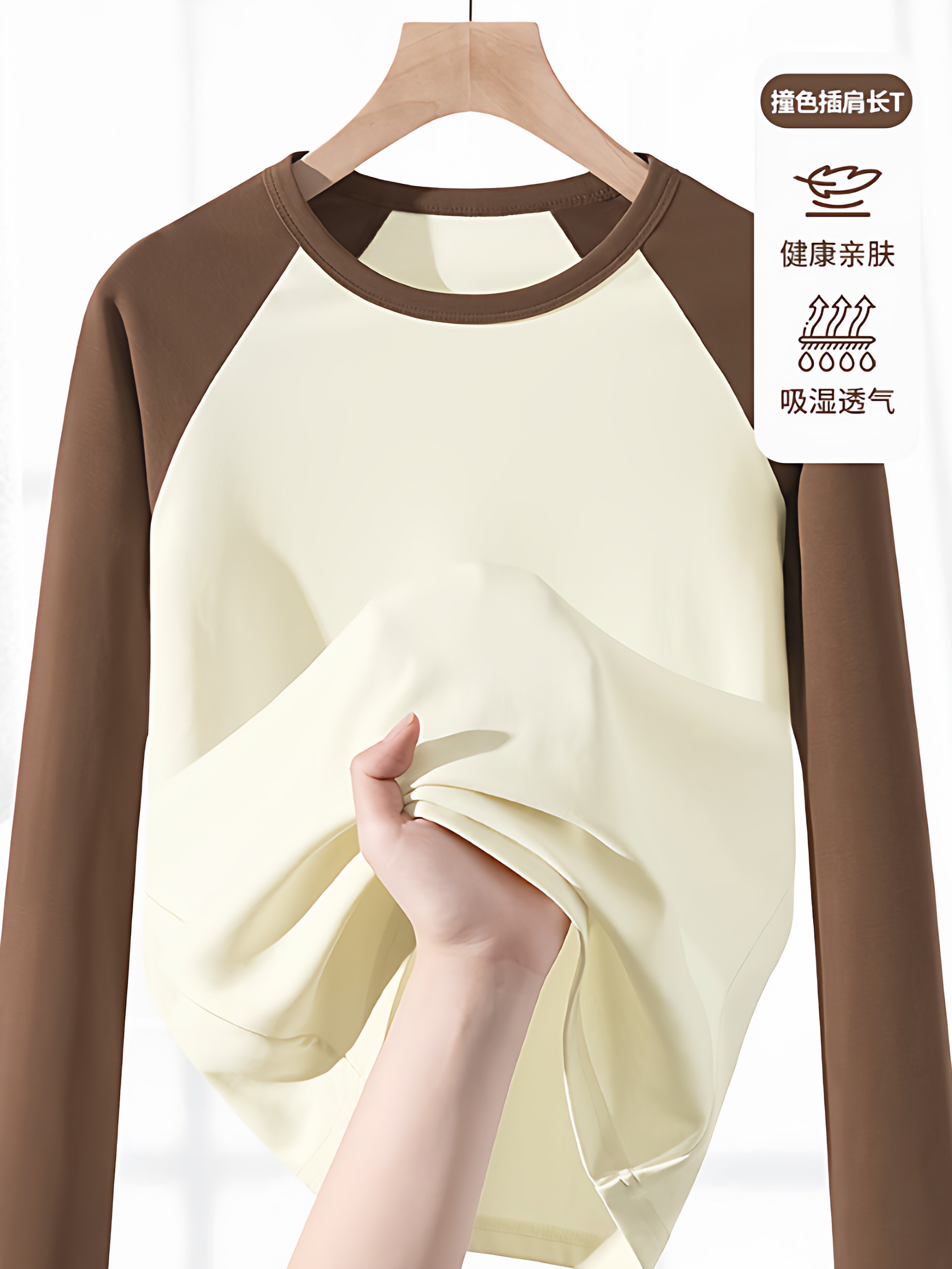 【门店同款】撞色插肩袖40支精棉女圆领百搭舒适长袖T恤1Q1222206