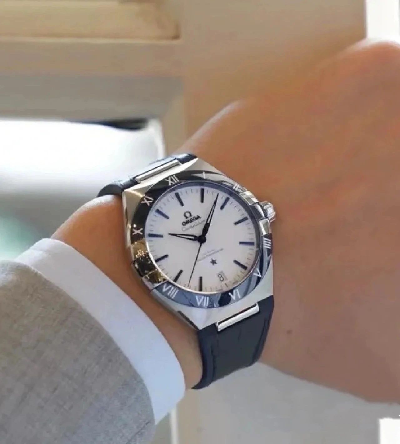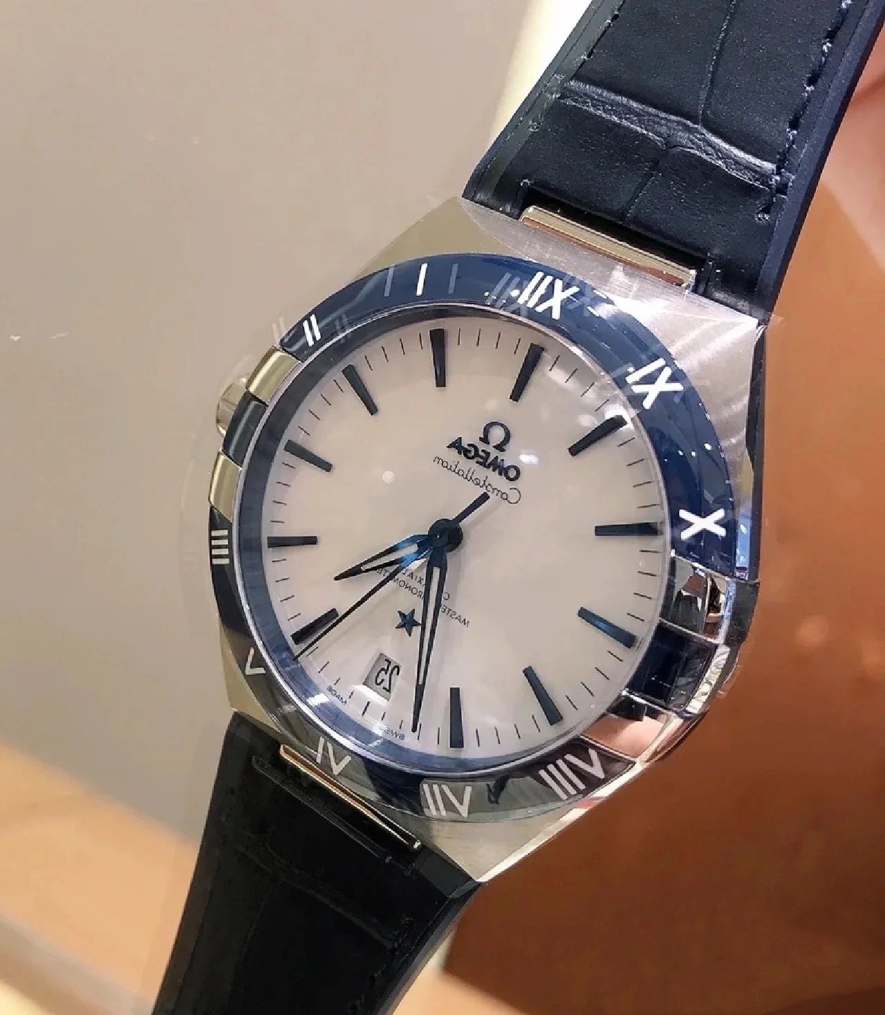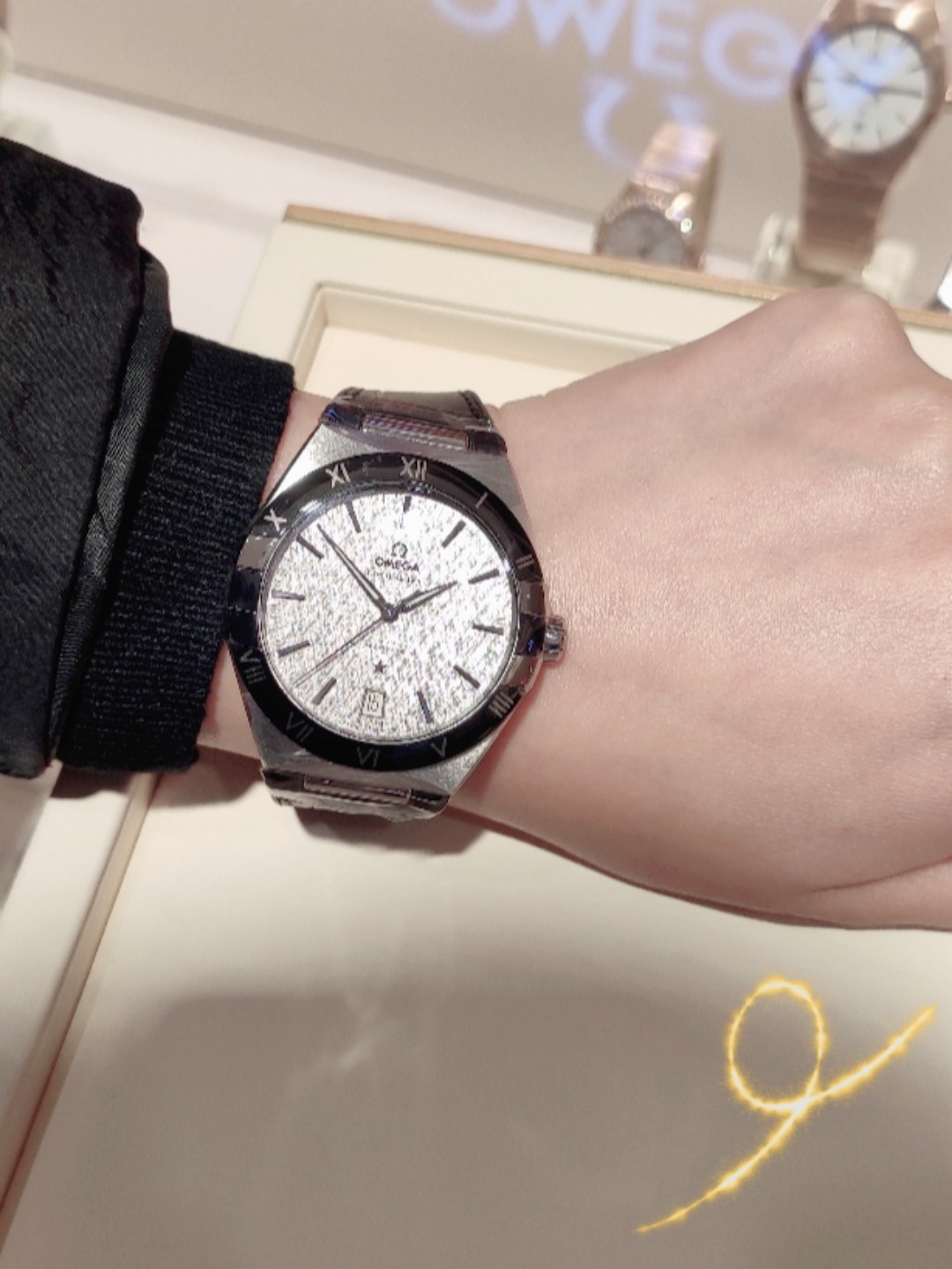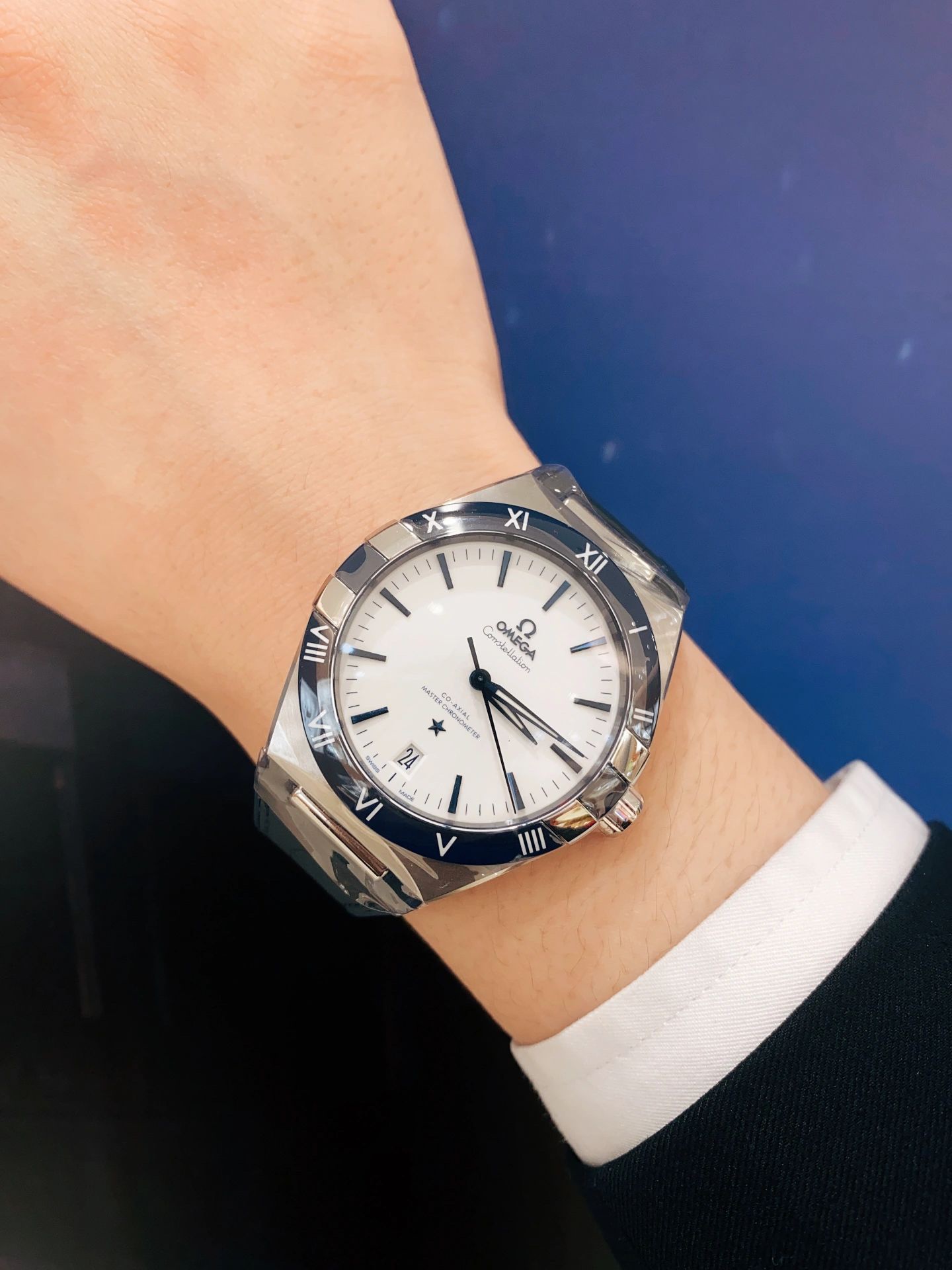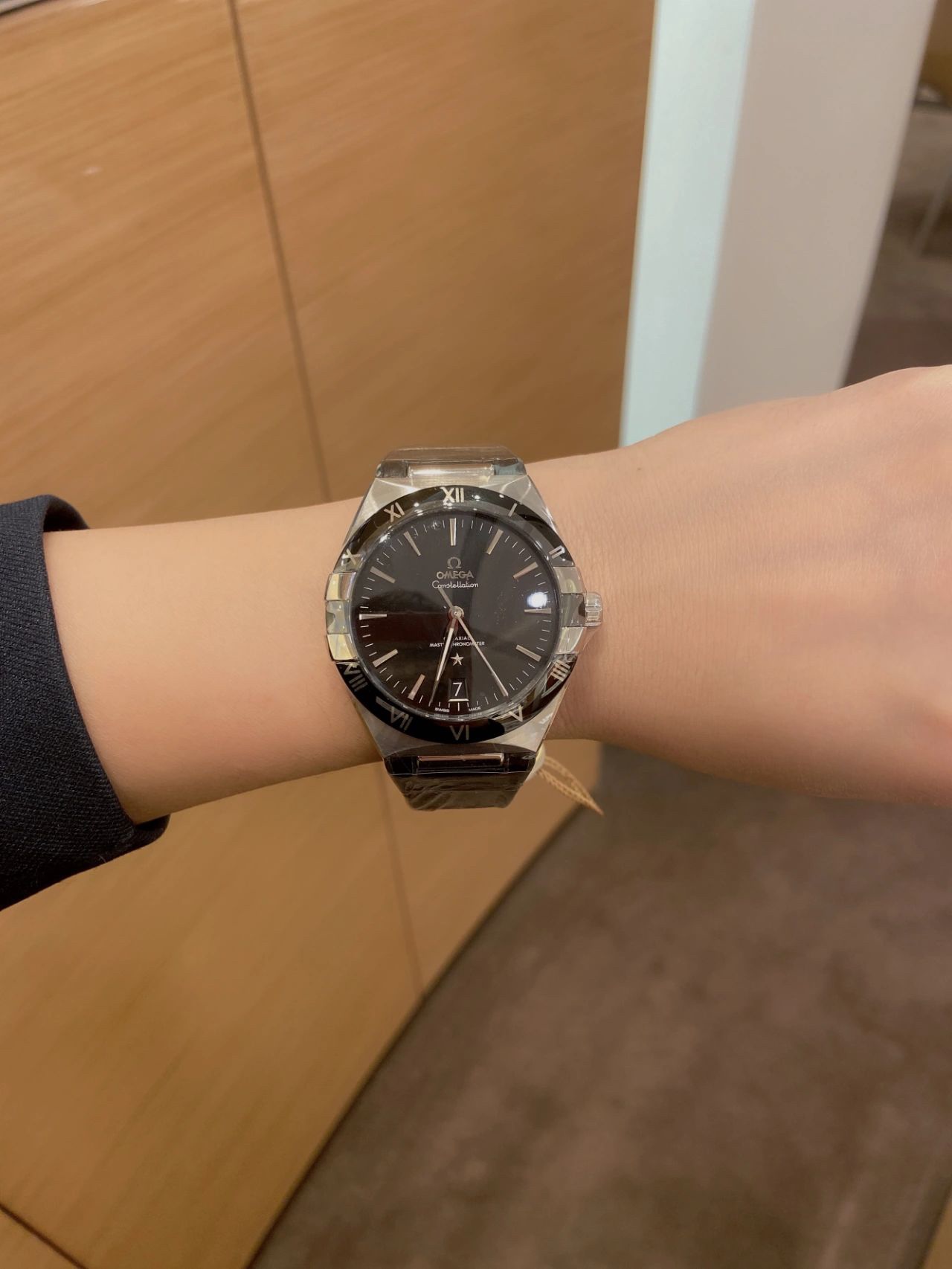 欧米茄星座,造型迷人,黑色陶瓷表圈和罗马数字时标科技感满满。戴上去感觉非常时尚,内部机芯,一切都尽显品质和美感