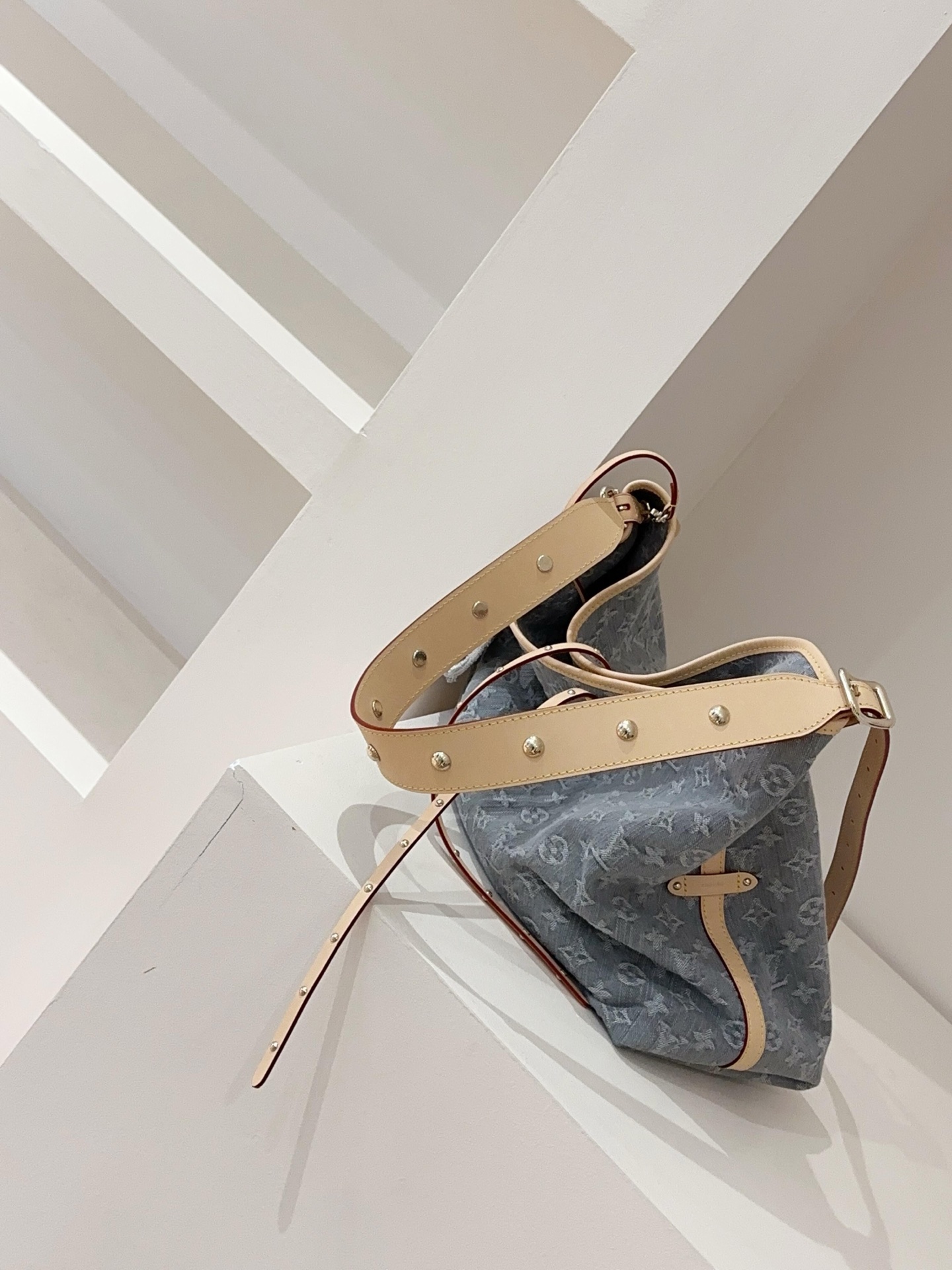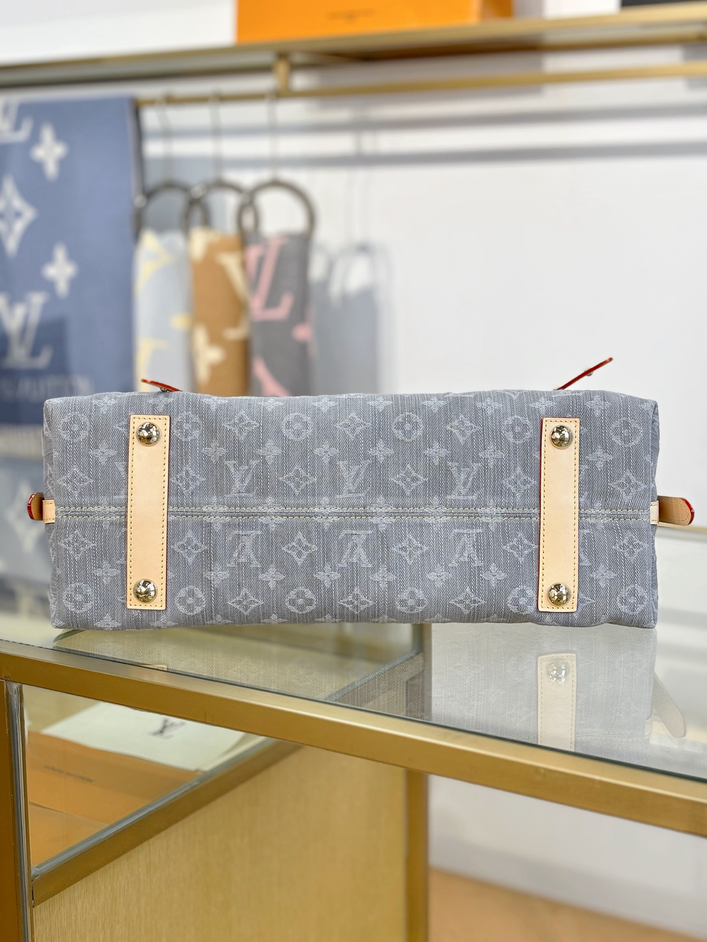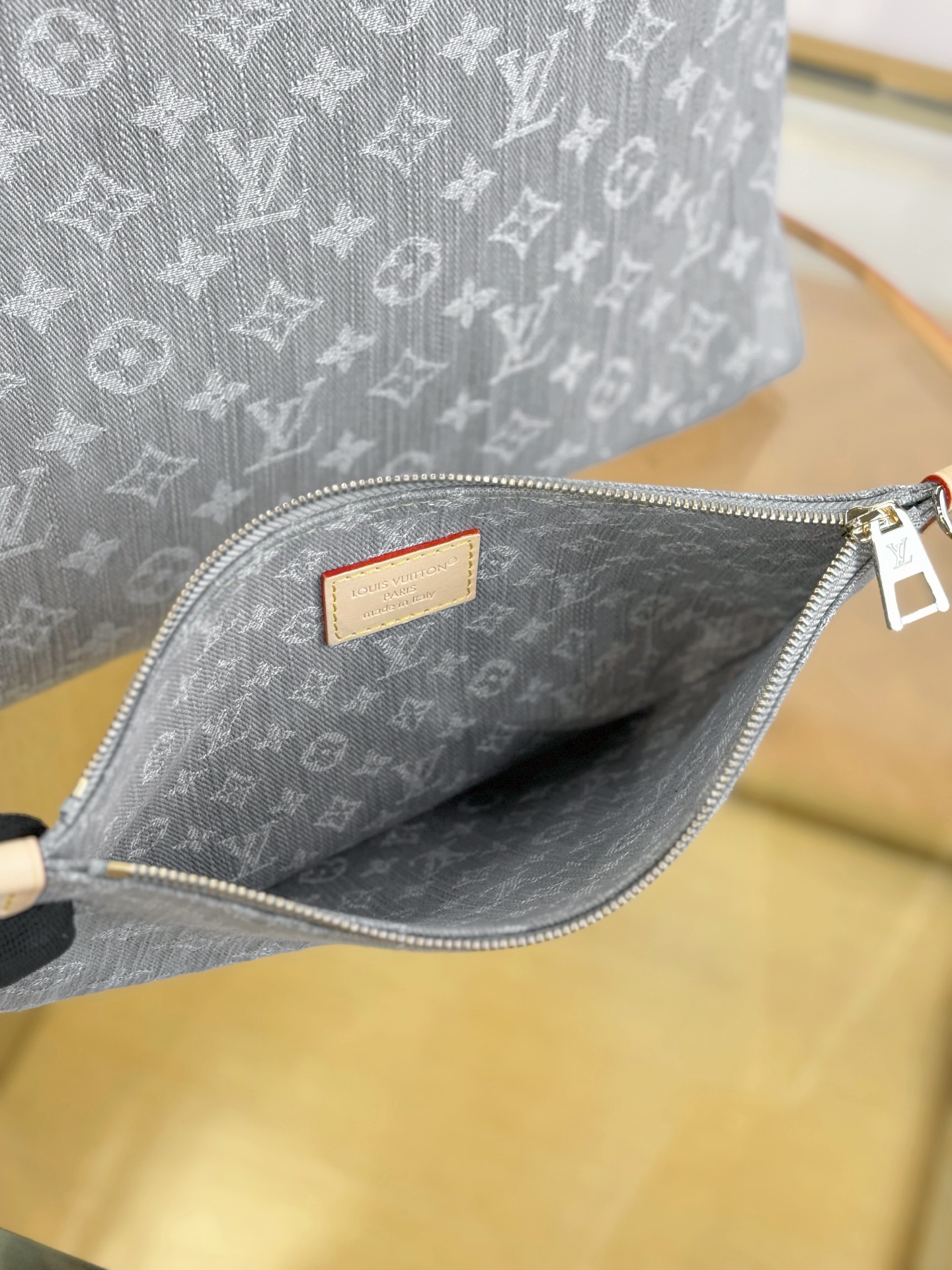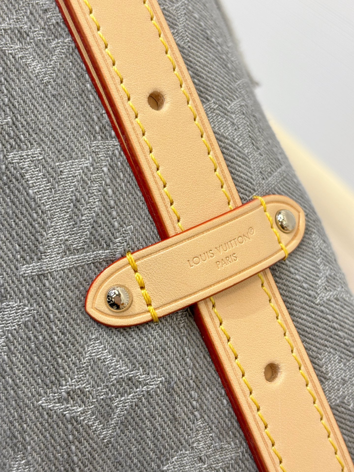 驴家 Carryall MM Monogram 灰丹宁满身徽标印花可拆卸调节肩带牛皮饰边棉单肩手提包 (JPH)