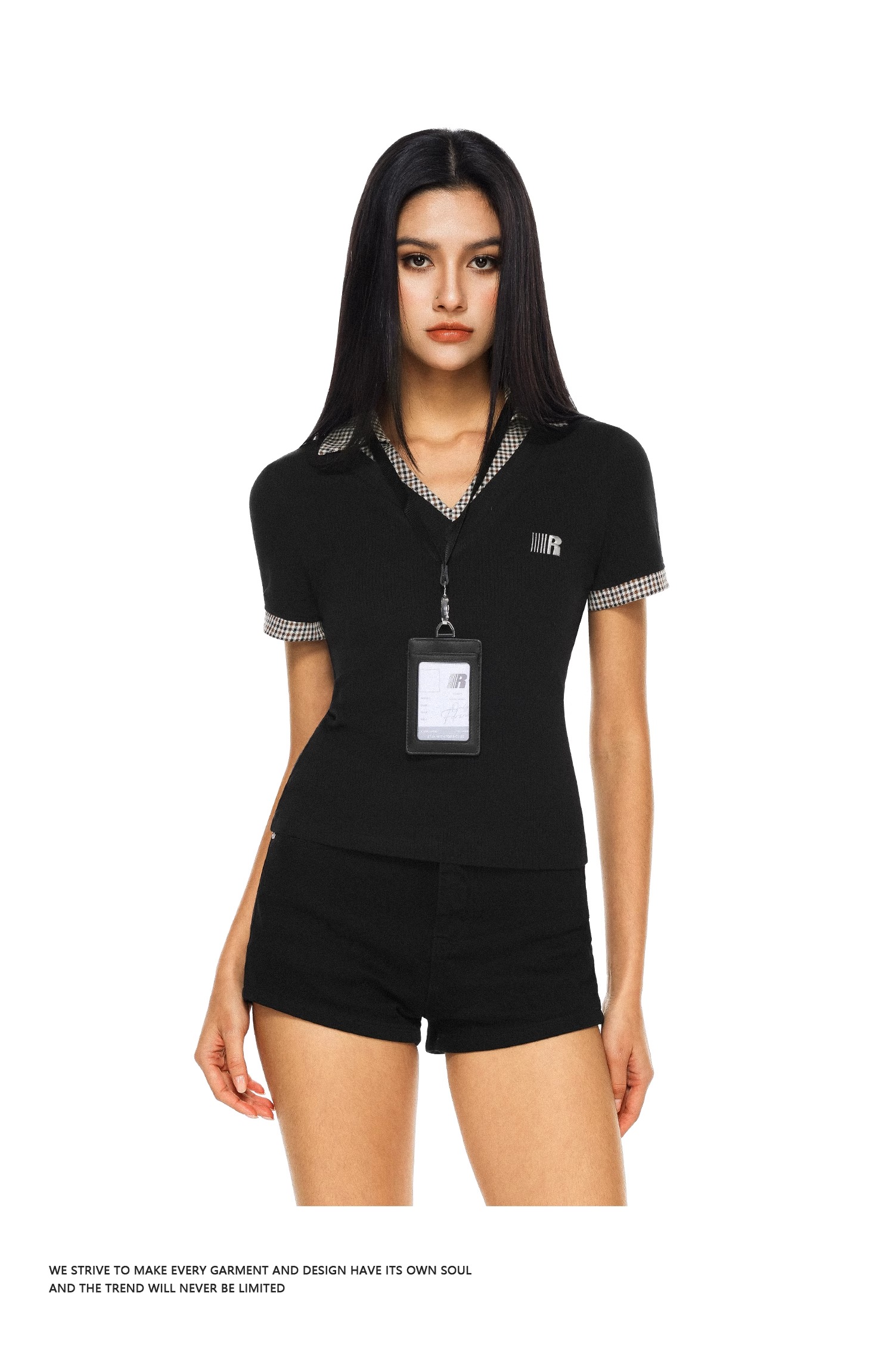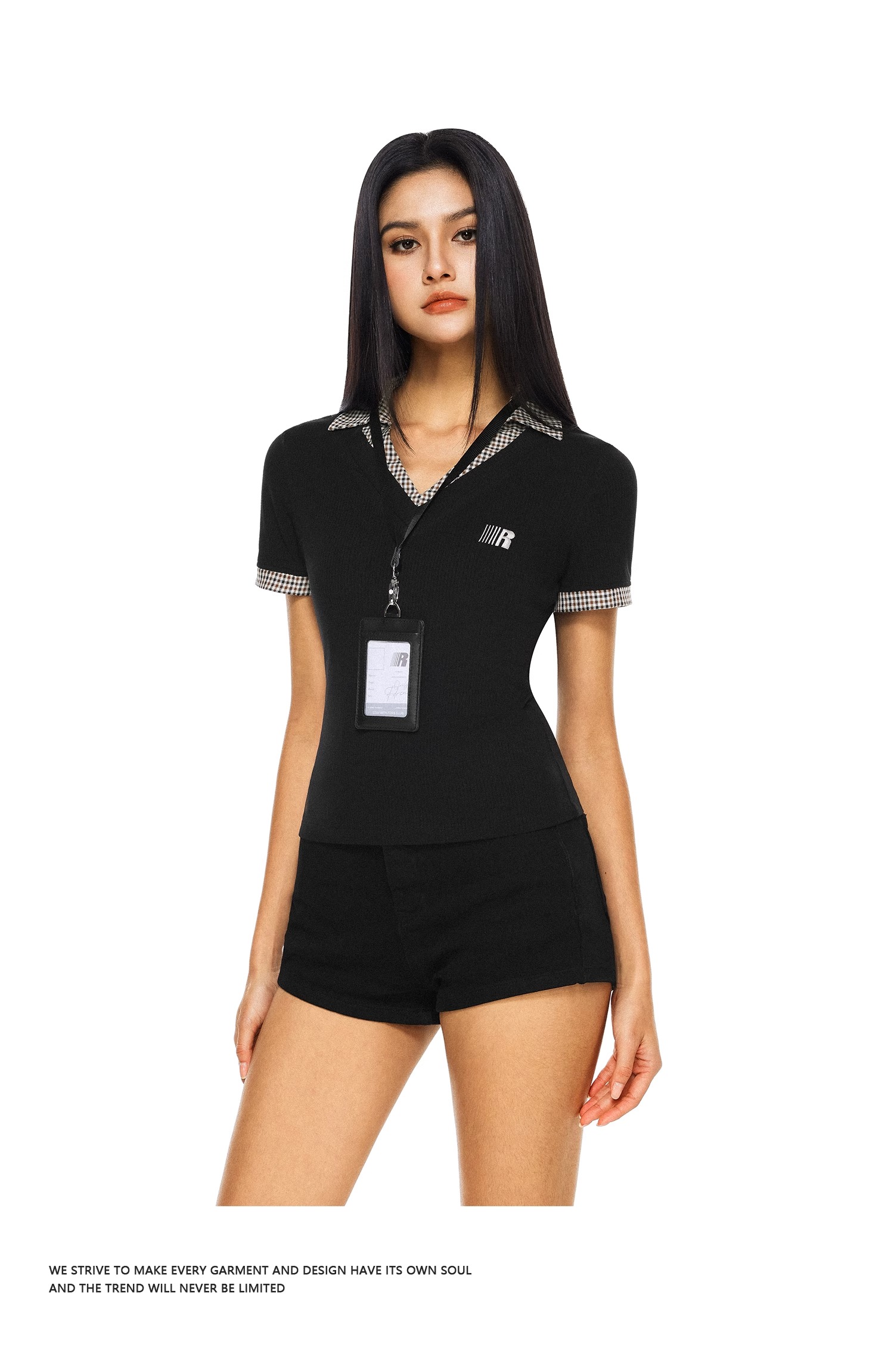 FDR官方店 V领拼接格纹辣妹短袖t恤女夏季修身显瘦体恤上衣送工牌
