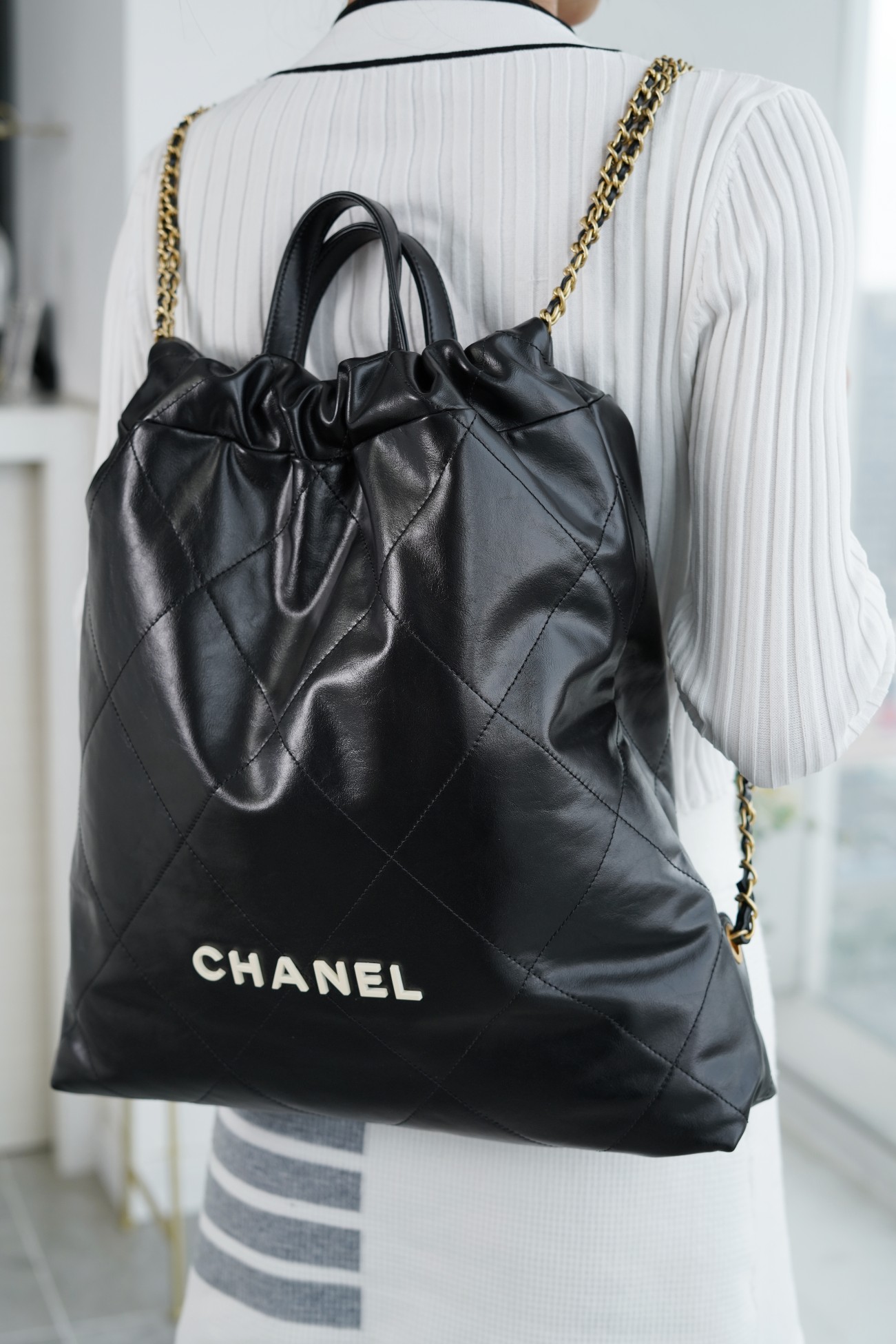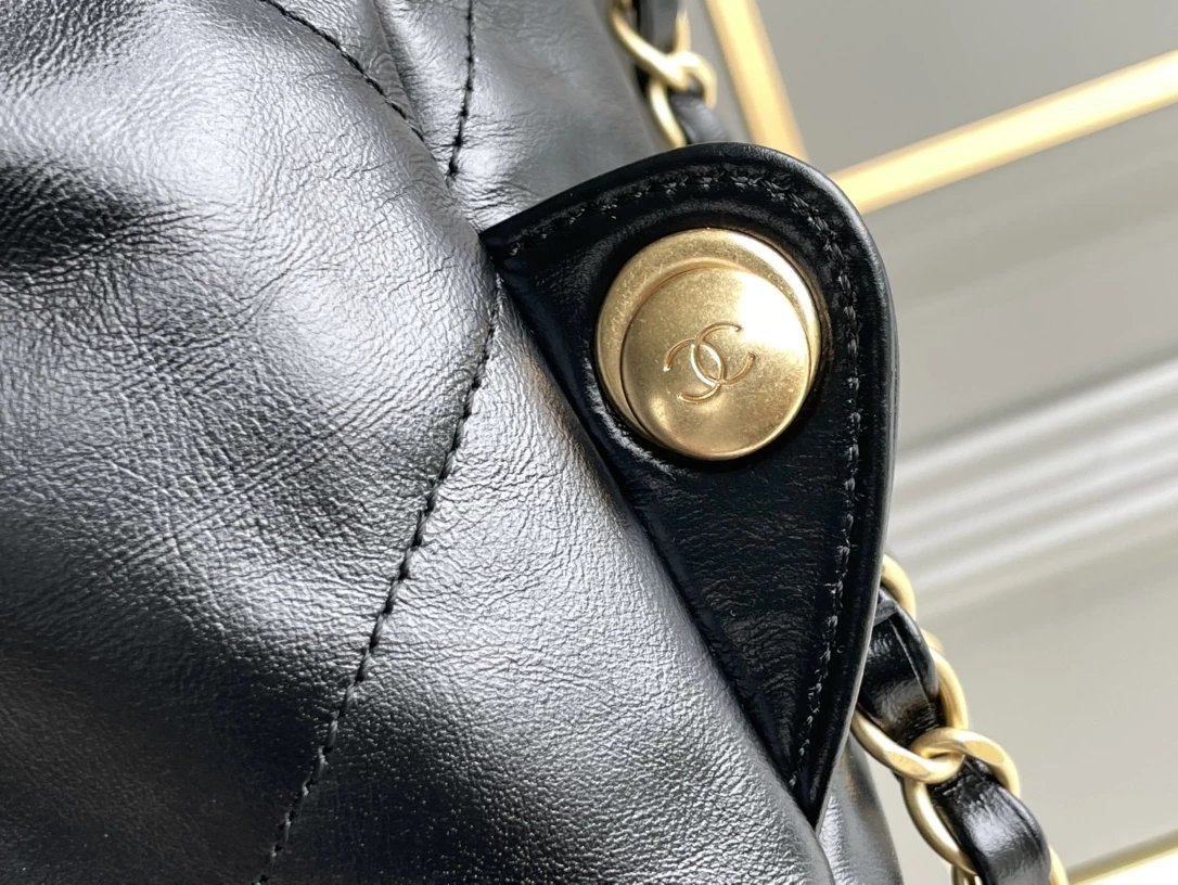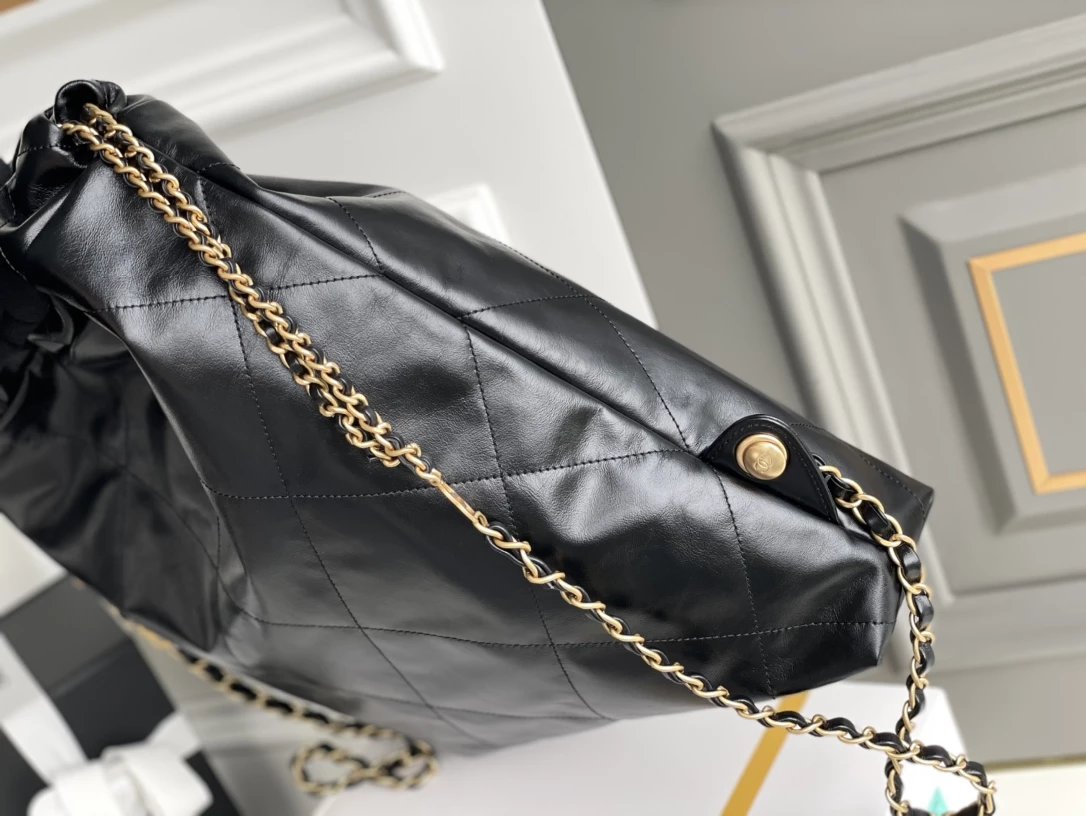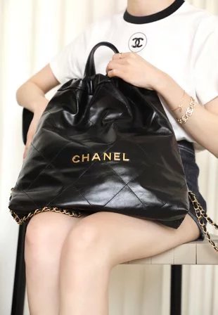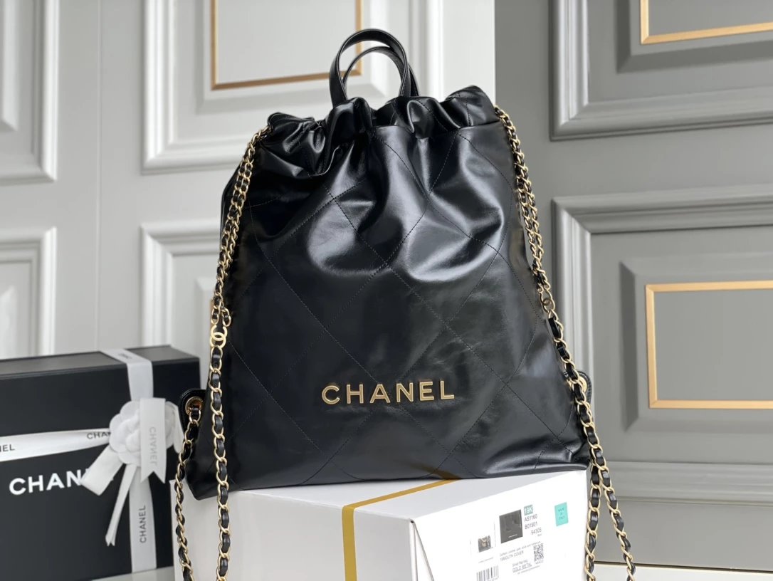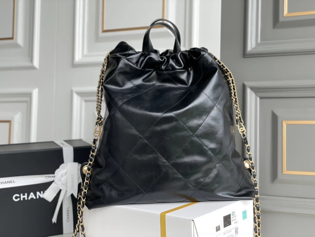 ??????????* ??????春夏新款 ??????垃圾袋 双肩背包? 亮面牛皮上手顺滑 有清晰的皮质褶皱纹理 做旧金属 、立体 Logo ,顶部抽绳双链设计用双 C Logo 连接下半段单链,底部左右各一个小耳朵用 Logo “铆钉”固定单链尾端,内里有 一个拉链隔层 一条钥匙链 方便挂钥匙等小物件…将简约舒适融为一体,为你打包整个春日??