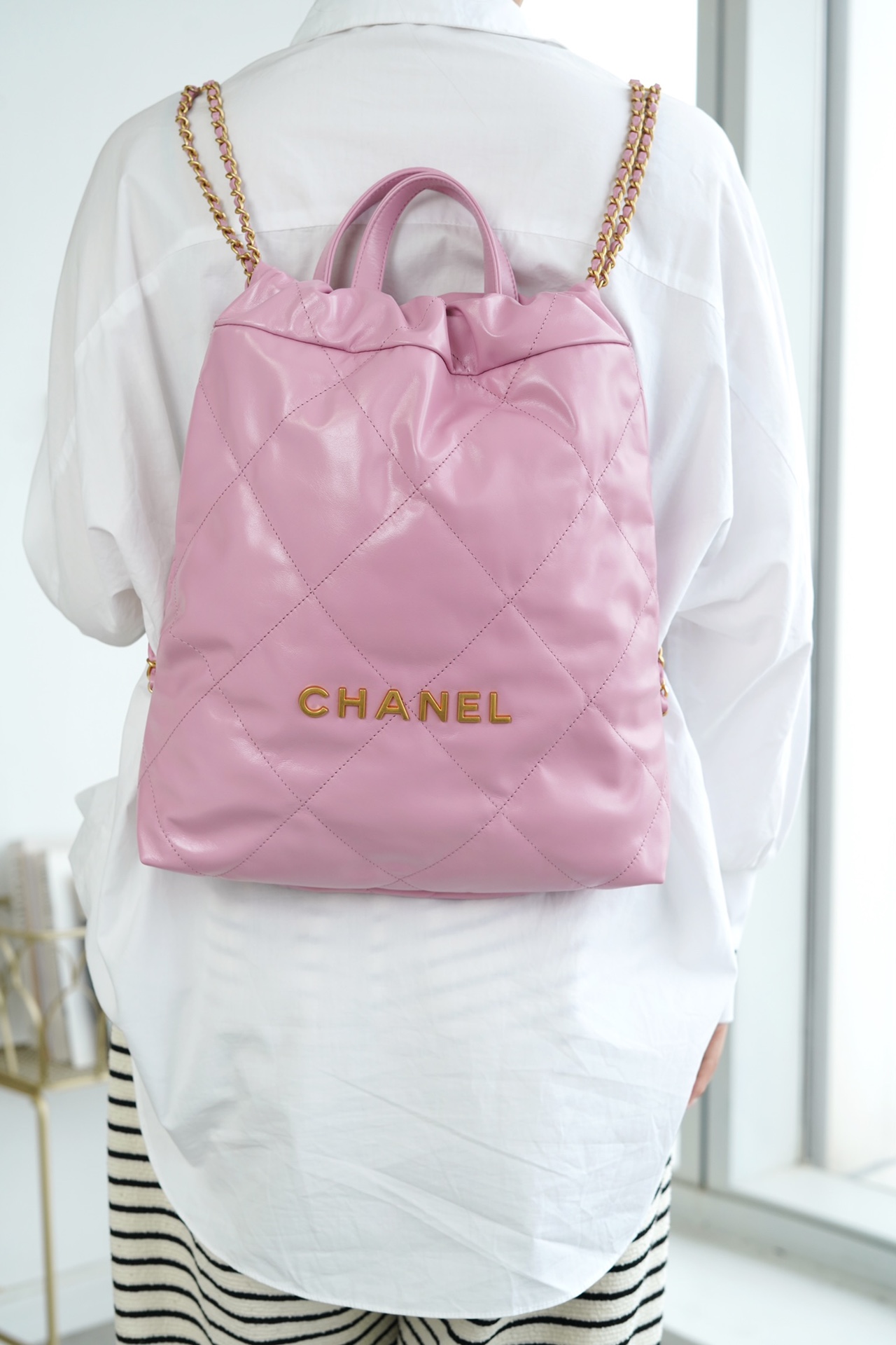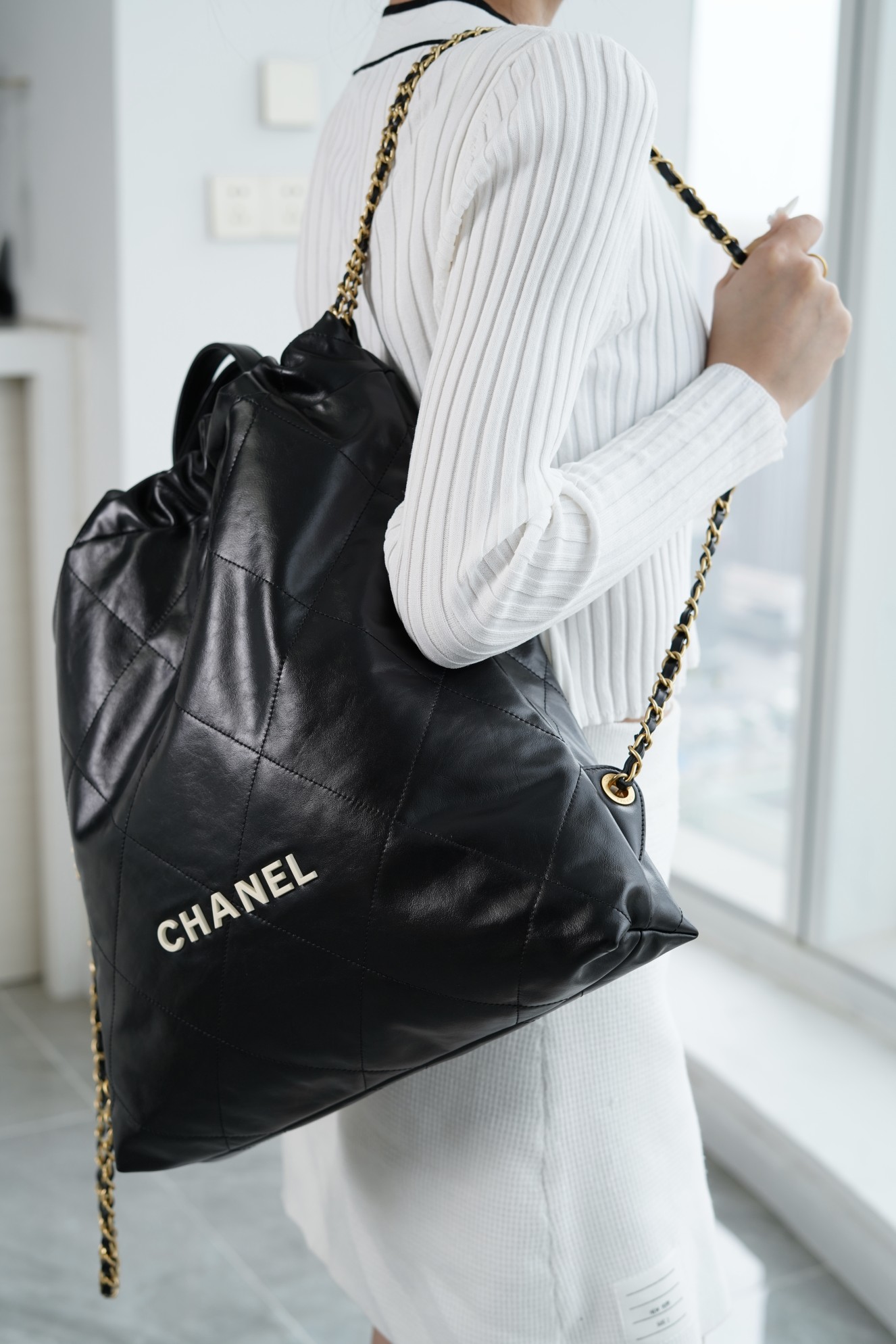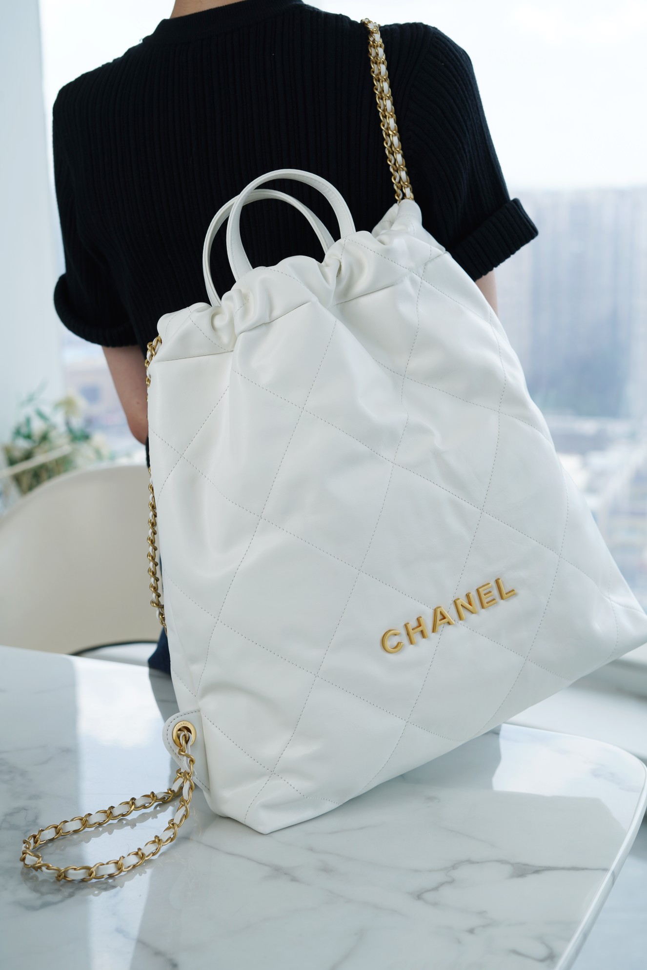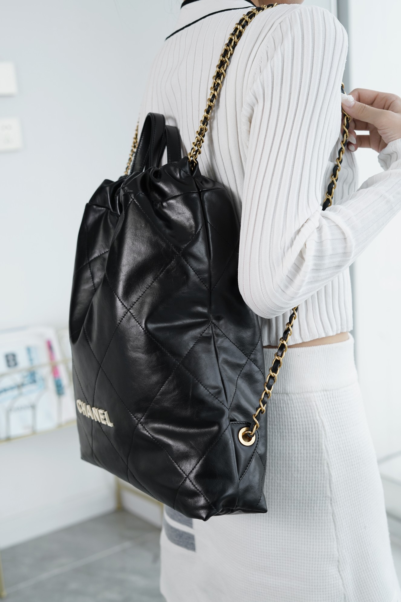 ??????????* ??????春夏新款 ??????垃圾袋 双肩背包? 亮面牛皮上手顺滑 有清晰的皮质褶皱纹理 做旧金属 、立体 Logo ,顶部抽绳双链设计用双 C Logo 连接下半段单链,底部左右各一个小耳朵用 Logo “铆钉”固定单链尾端,内里有 一个拉链隔层 一条钥匙链 方便挂钥匙等小物件…将简约舒适融为一体,为你打包整个春日??