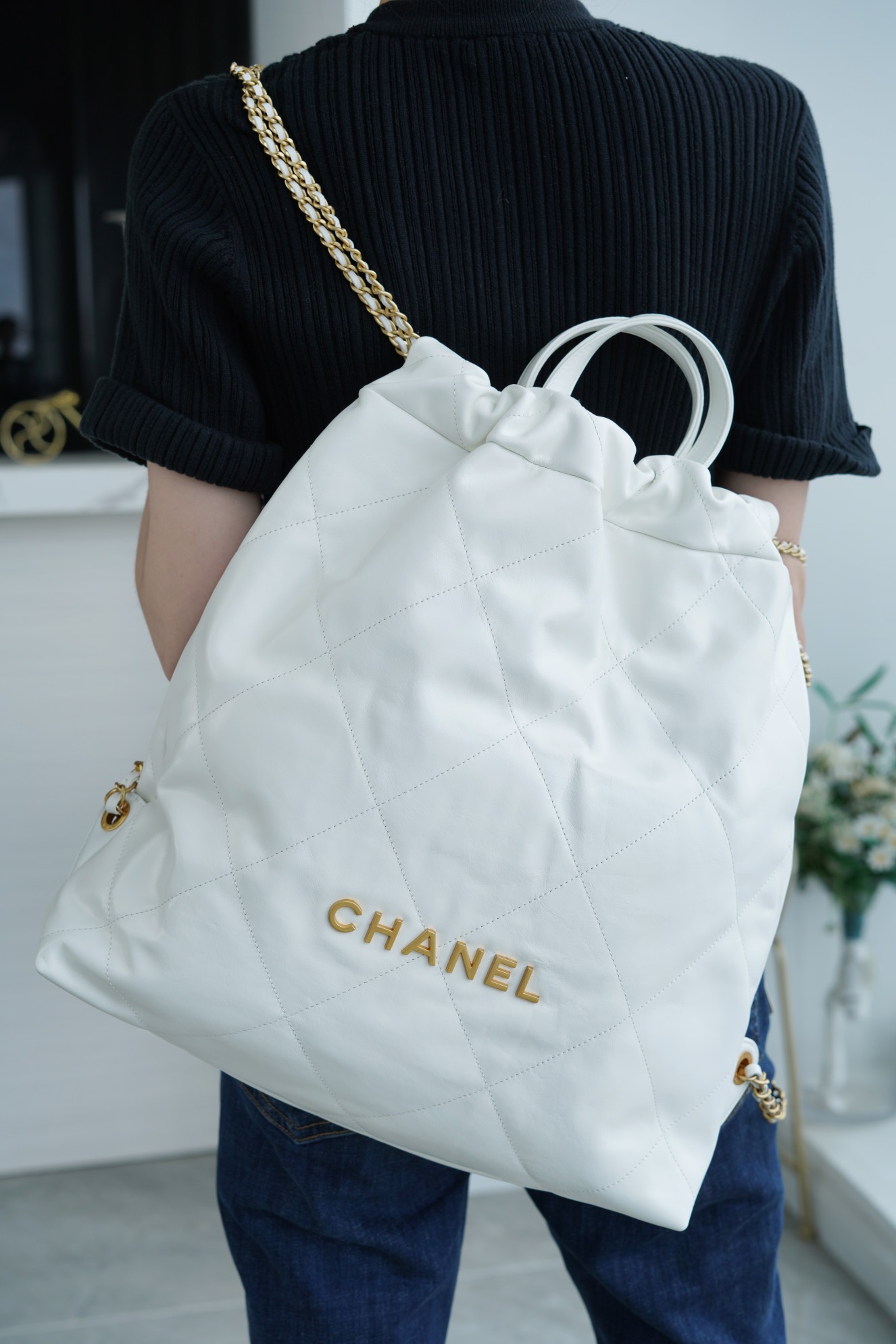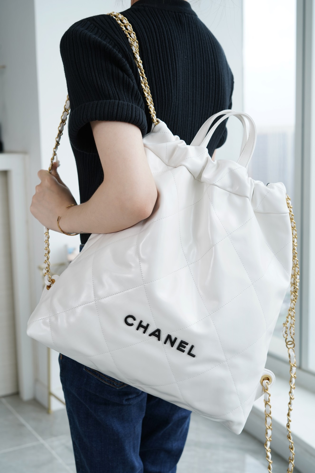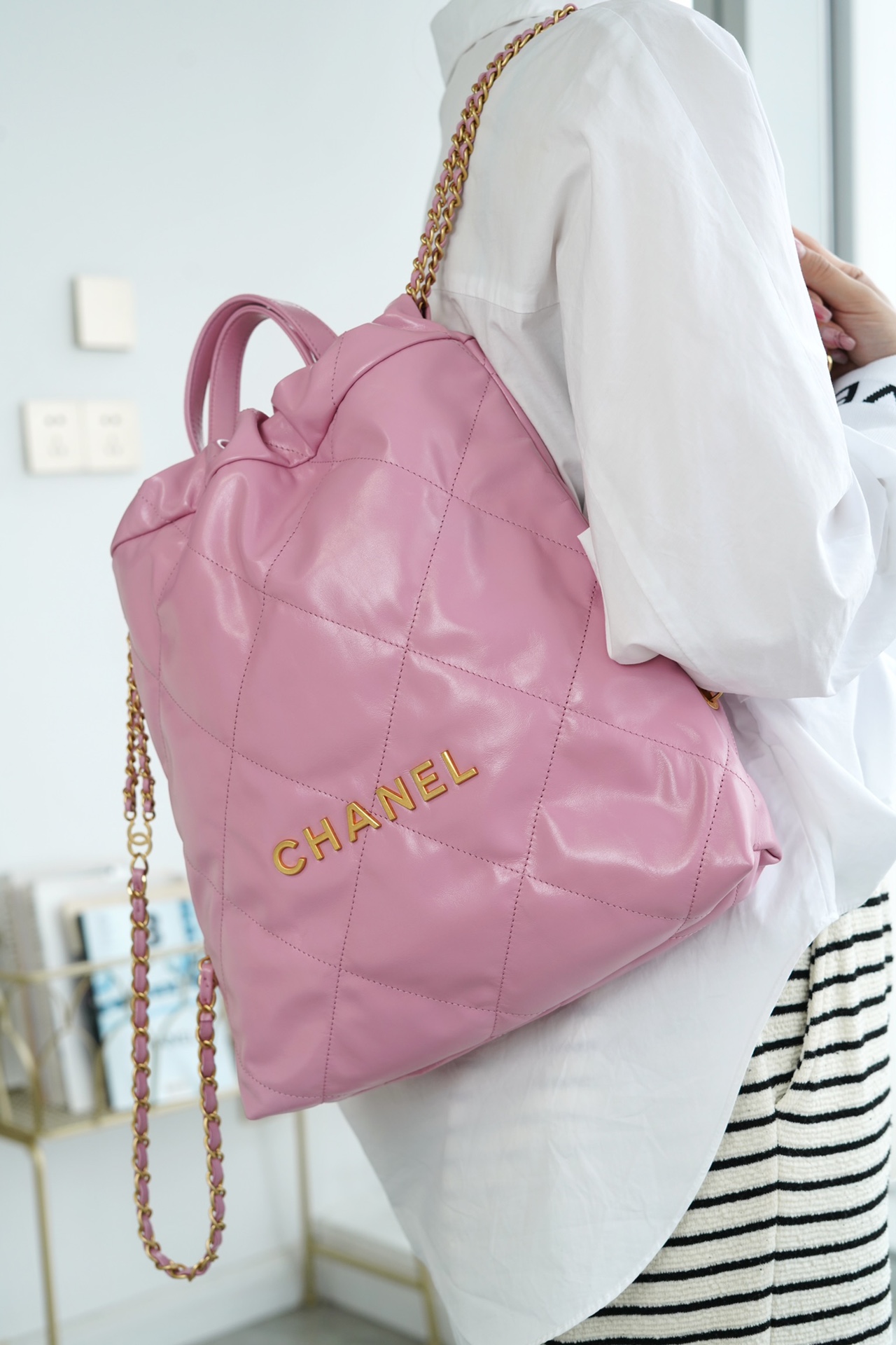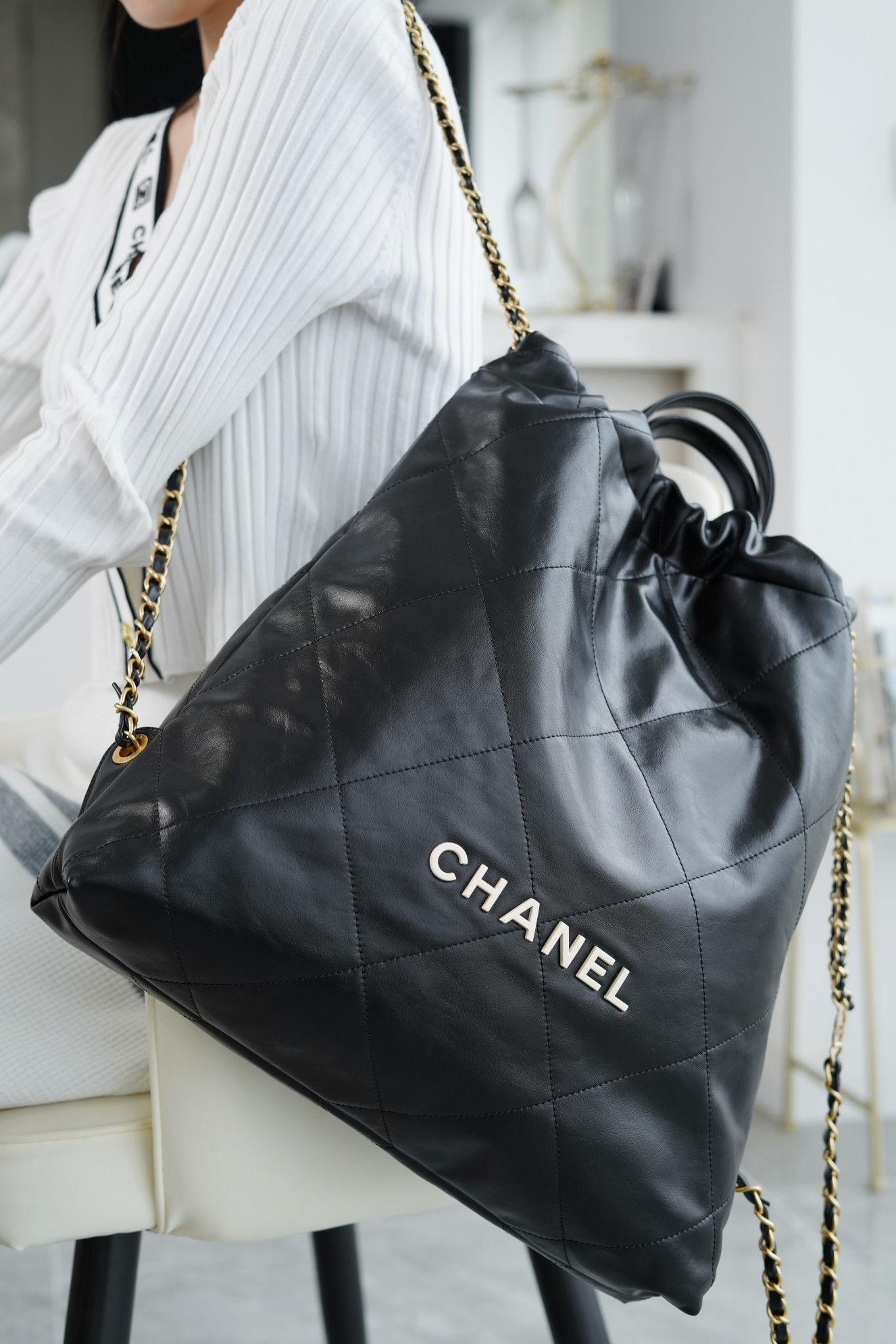 ??????????* ??????春夏新款 ??????垃圾袋 双肩背包? 亮面牛皮上手顺滑 有清晰的皮质褶皱纹理 做旧金属 、立体 Logo ,顶部抽绳双链设计用双 C Logo 连接下半段单链,底部左右各一个小耳朵用 Logo “铆钉”固定单链尾端,内里有 一个拉链隔层 一条钥匙链 方便挂钥匙等小物件…将简约舒适融为一体,为你打包整个春日??