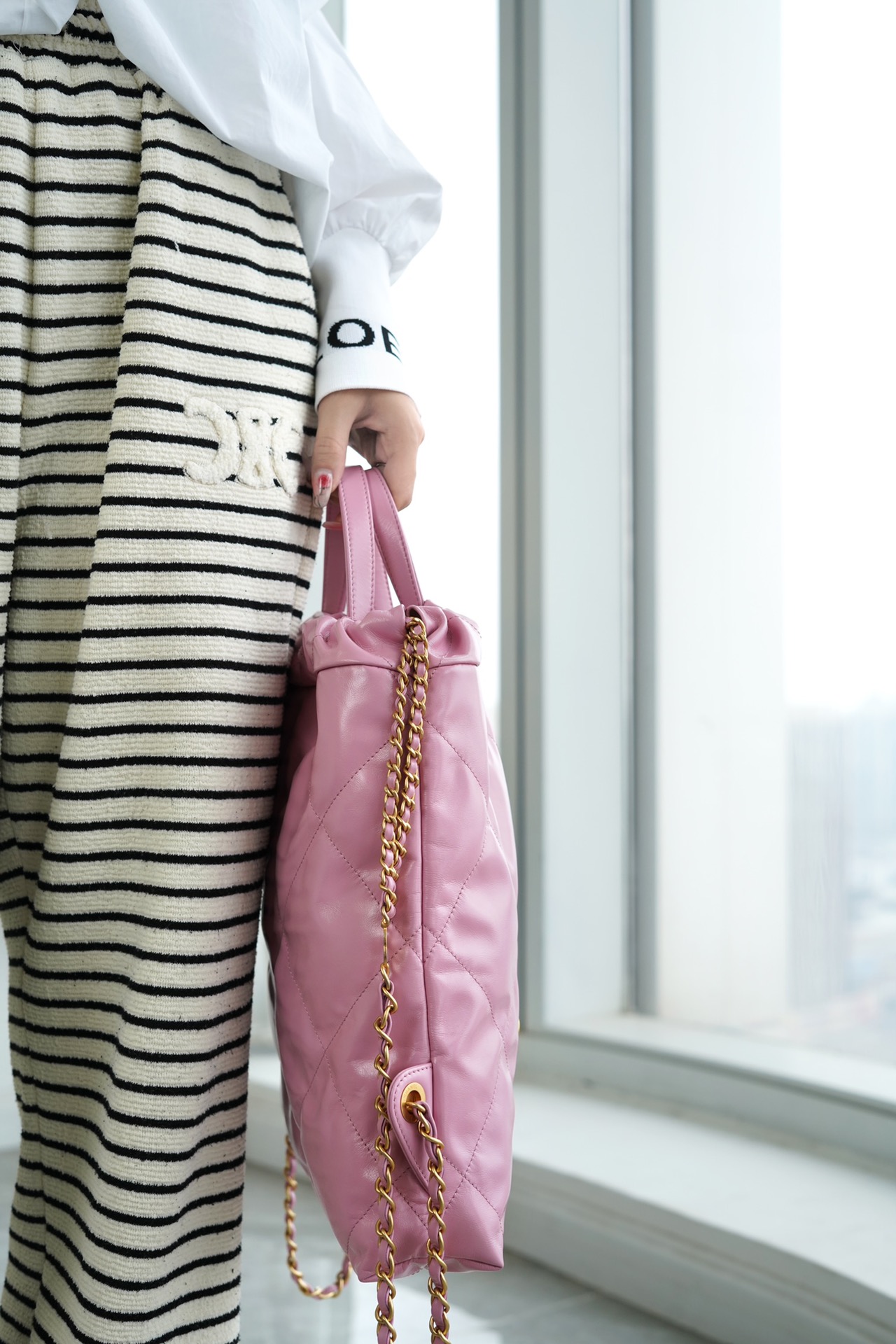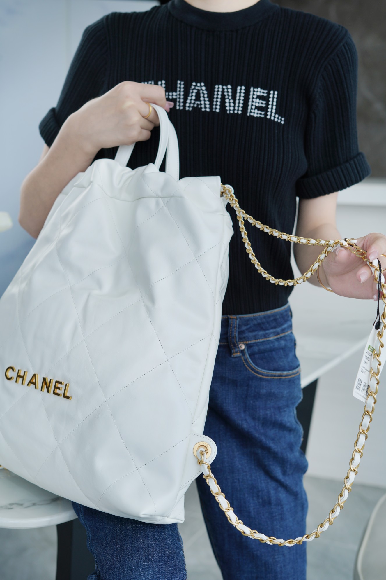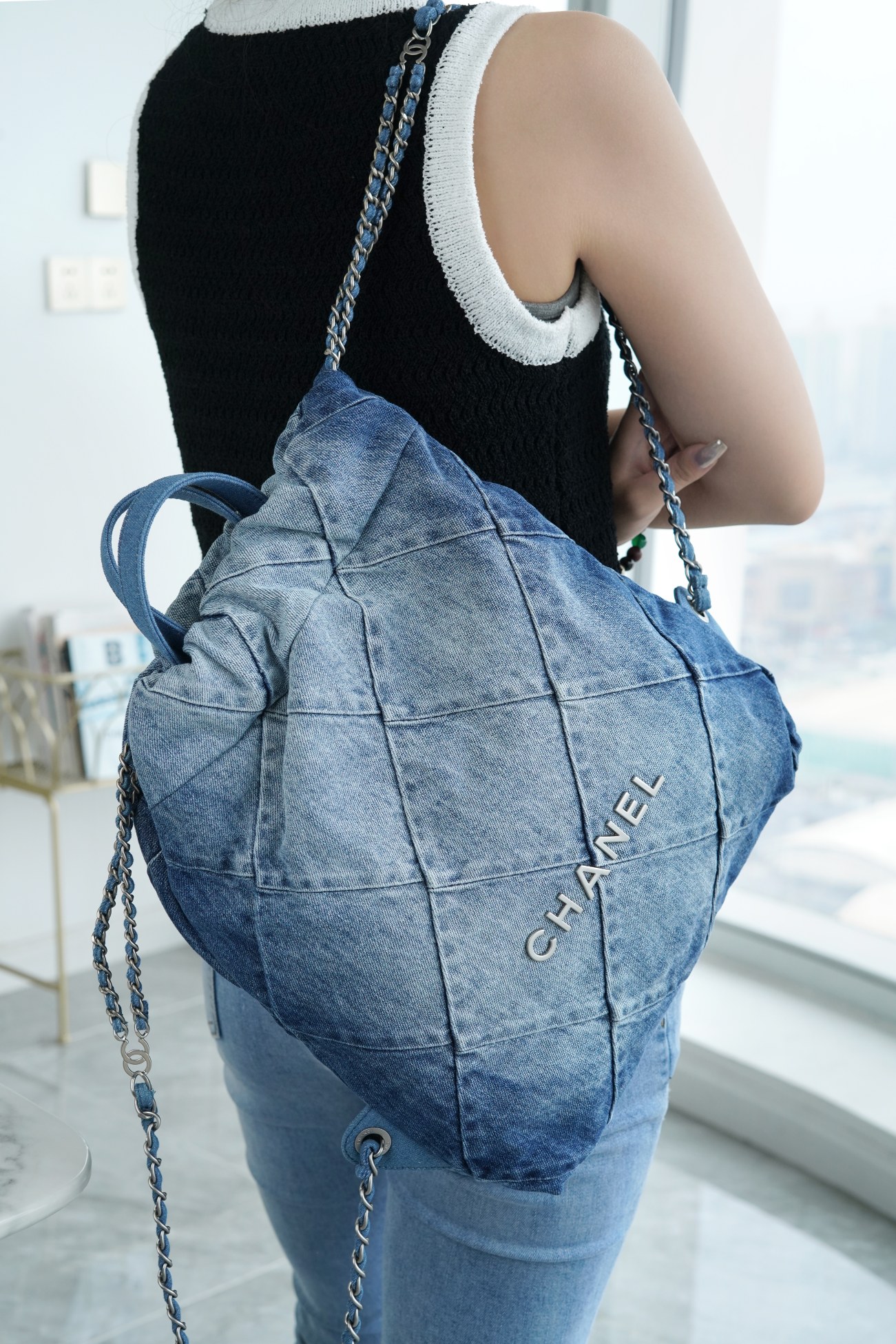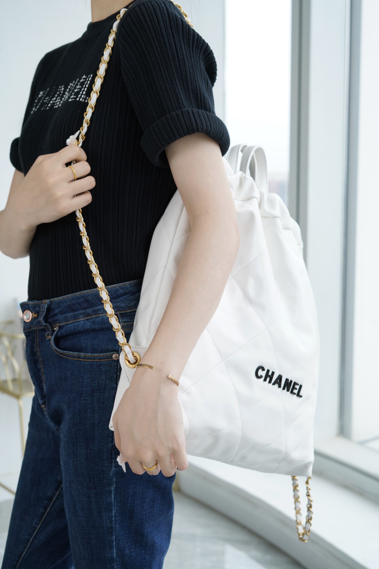 ??????????* ??????春夏新款 ??????垃圾袋 双肩背包? 亮面牛皮上手顺滑 有清晰的皮质褶皱纹理 做旧金属 、立体 Logo ,顶部抽绳双链设计用双 C Logo 连接下半段单链,底部左右各一个小耳朵用 Logo “铆钉”固定单链尾端,内里有 一个拉链隔层 一条钥匙链 方便挂钥匙等小物件…将简约舒适融为一体,为你打包整个春日??