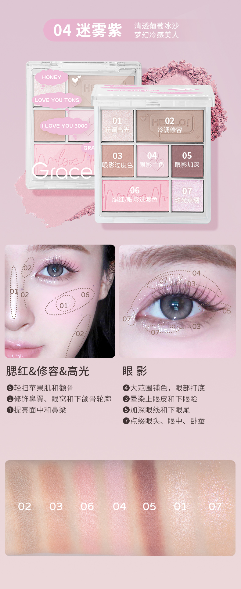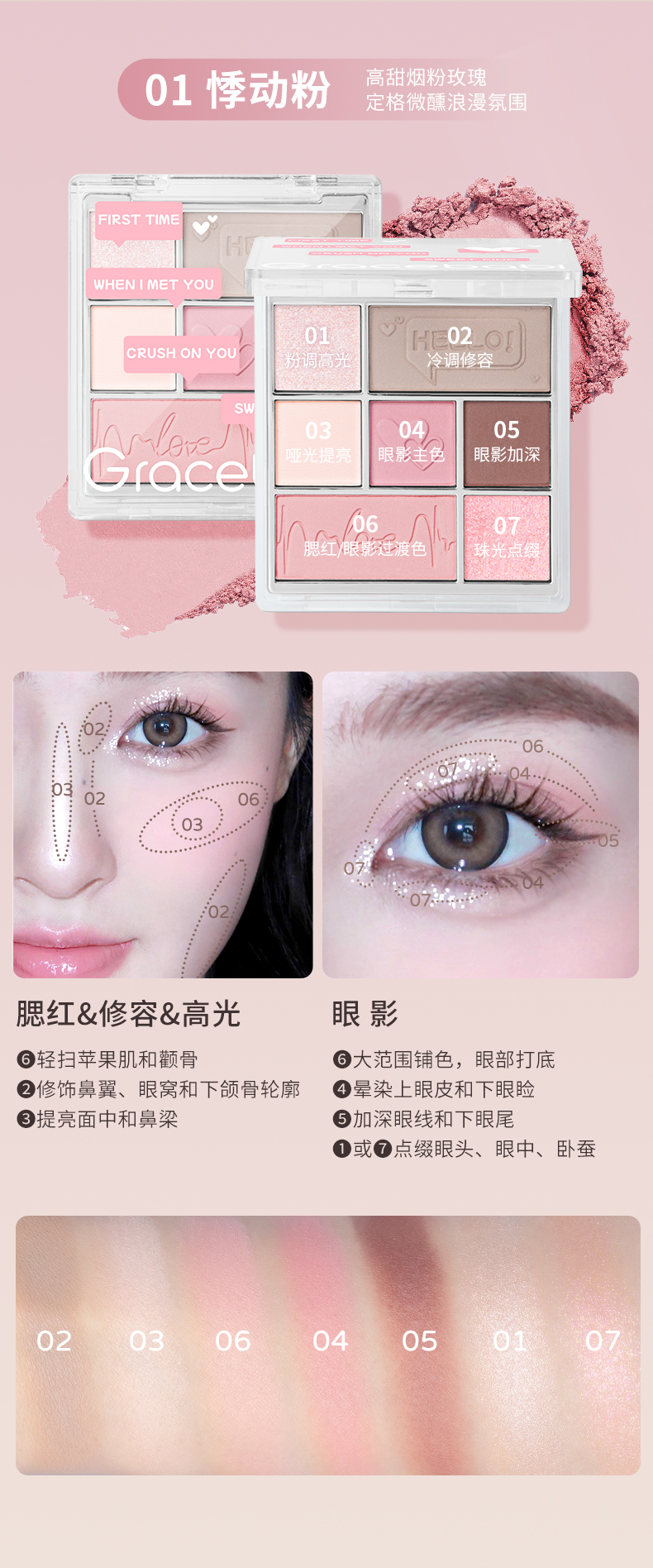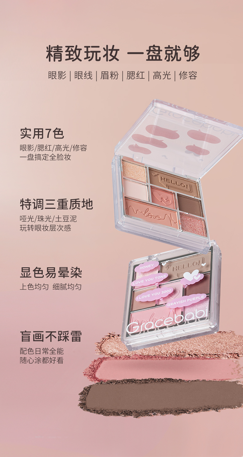 gracebabi丝绒光感七色高光修容眼影综合一体盘爆闪珠光