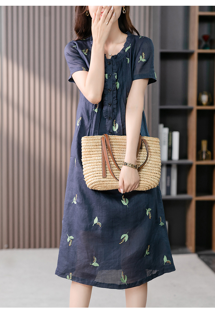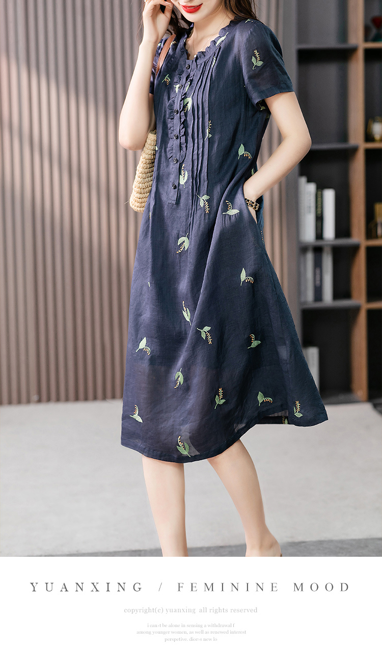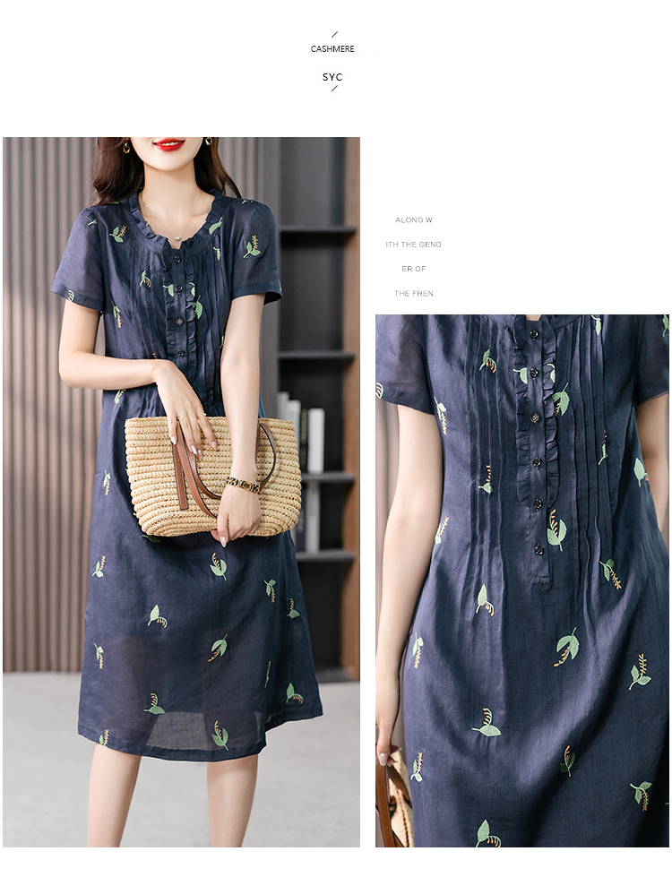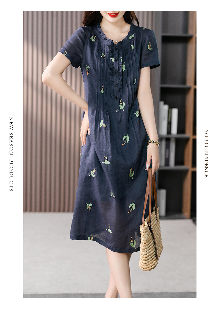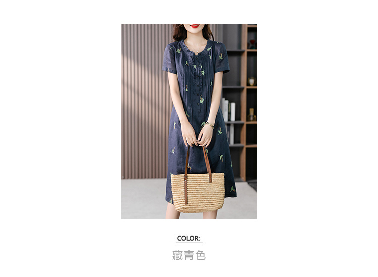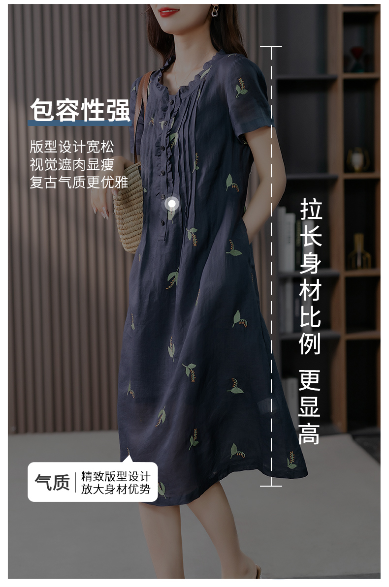 UG【定制10天】时尚碎花苎麻连衣裙女2023夏季新款韩版气质显瘦中长款裙子