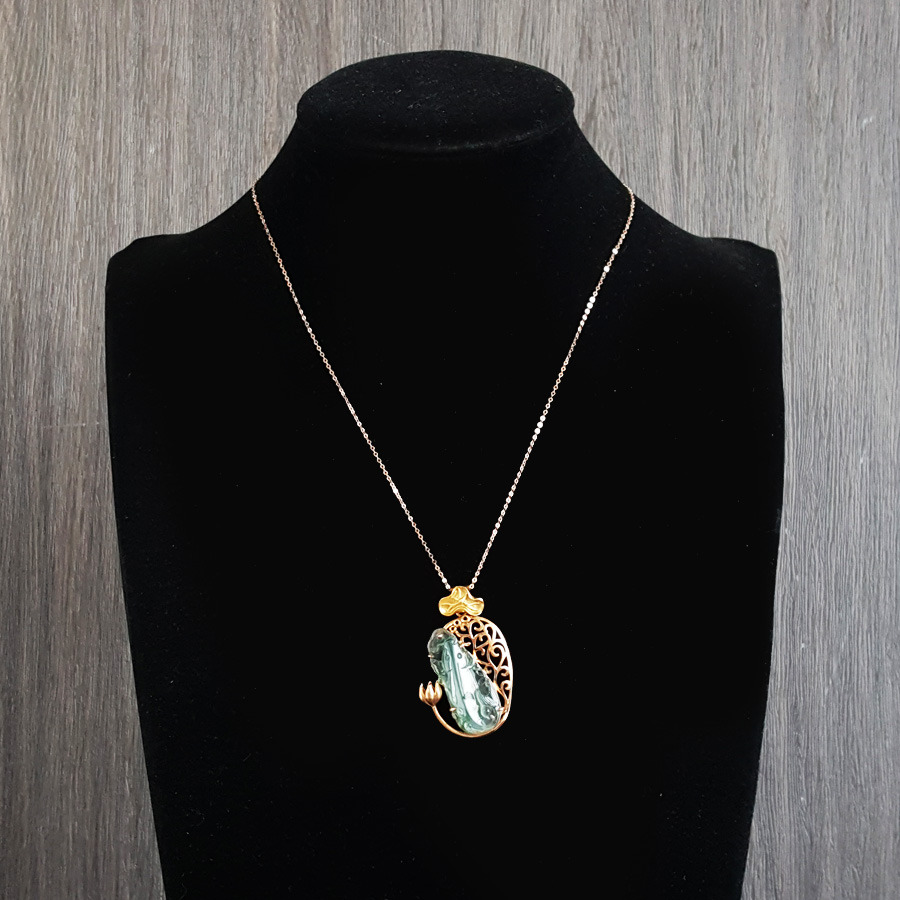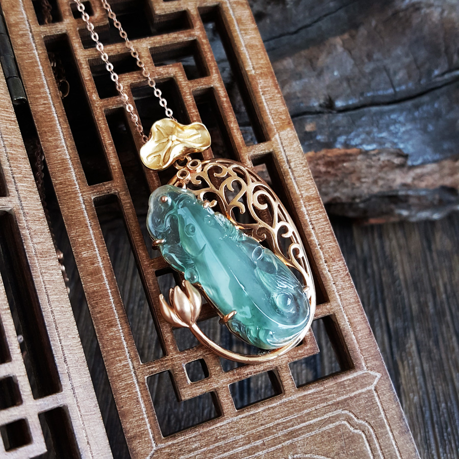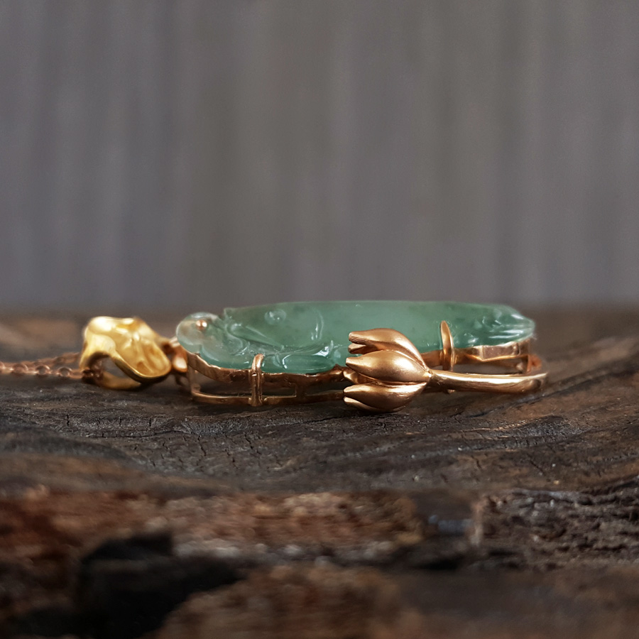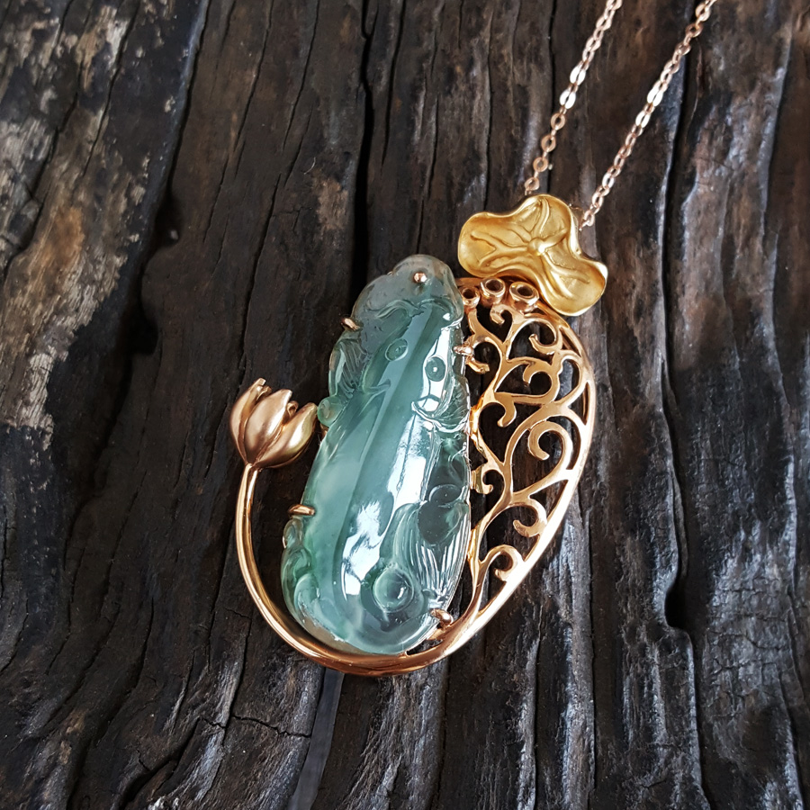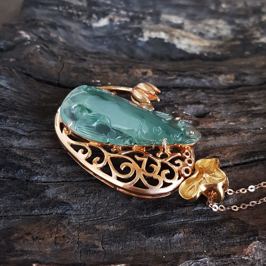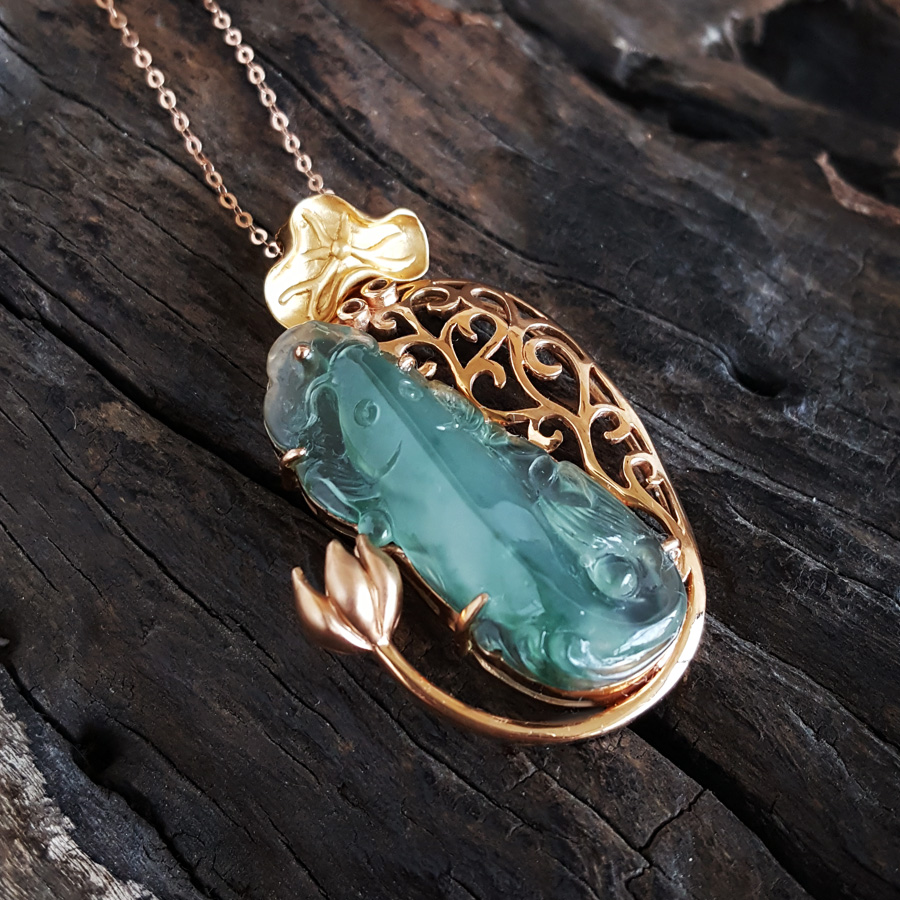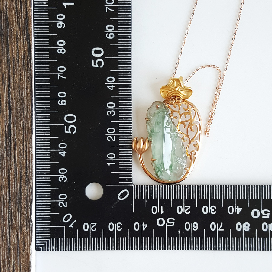 【天然正品】AU750玫瑰金镶天然细腻冰种锦鲤戏莲翡翠吊坠项链280425XY03 现售价:9380