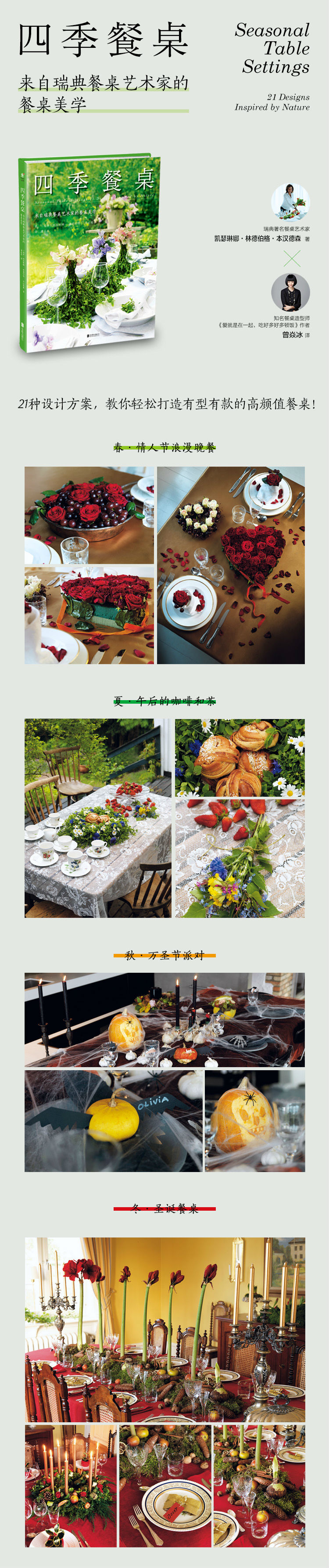本书为瑞典餐桌艺术家凯瑟琳娜的餐桌艺术专集,以一年四季的流转为指引,带领读者发现身边之物的美感进而亲手布置出绝妙的餐桌,为美食添香增色,为家人和宾客留下美好生活的印记,轻松应对一日三餐和所有聚会场合。