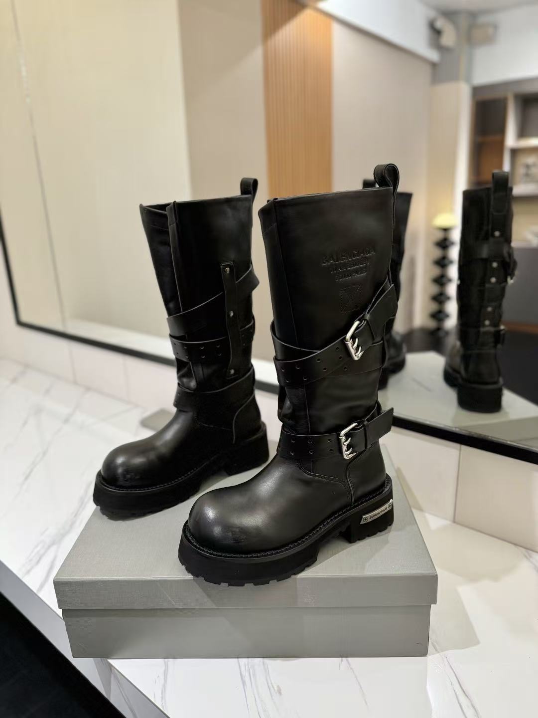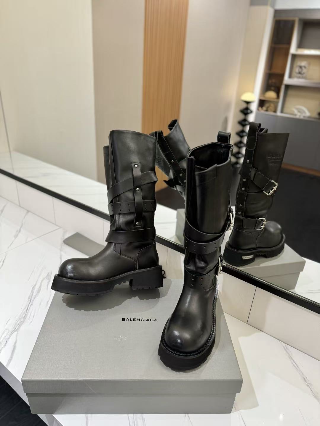 巴黎世家小牛皮 圆头搭扣 高筒靴 复古皮带+金属扣设计(DBG)