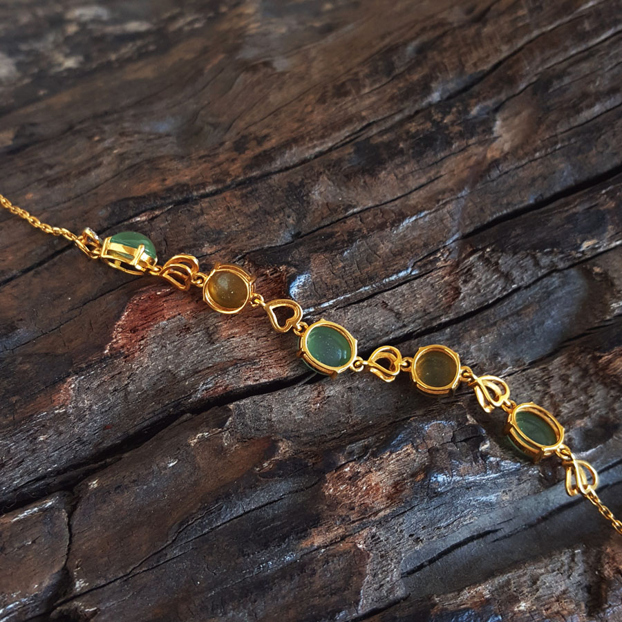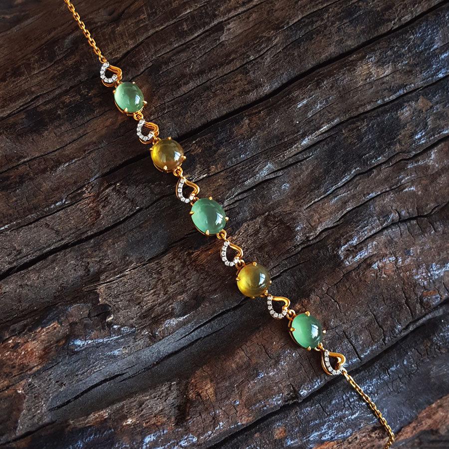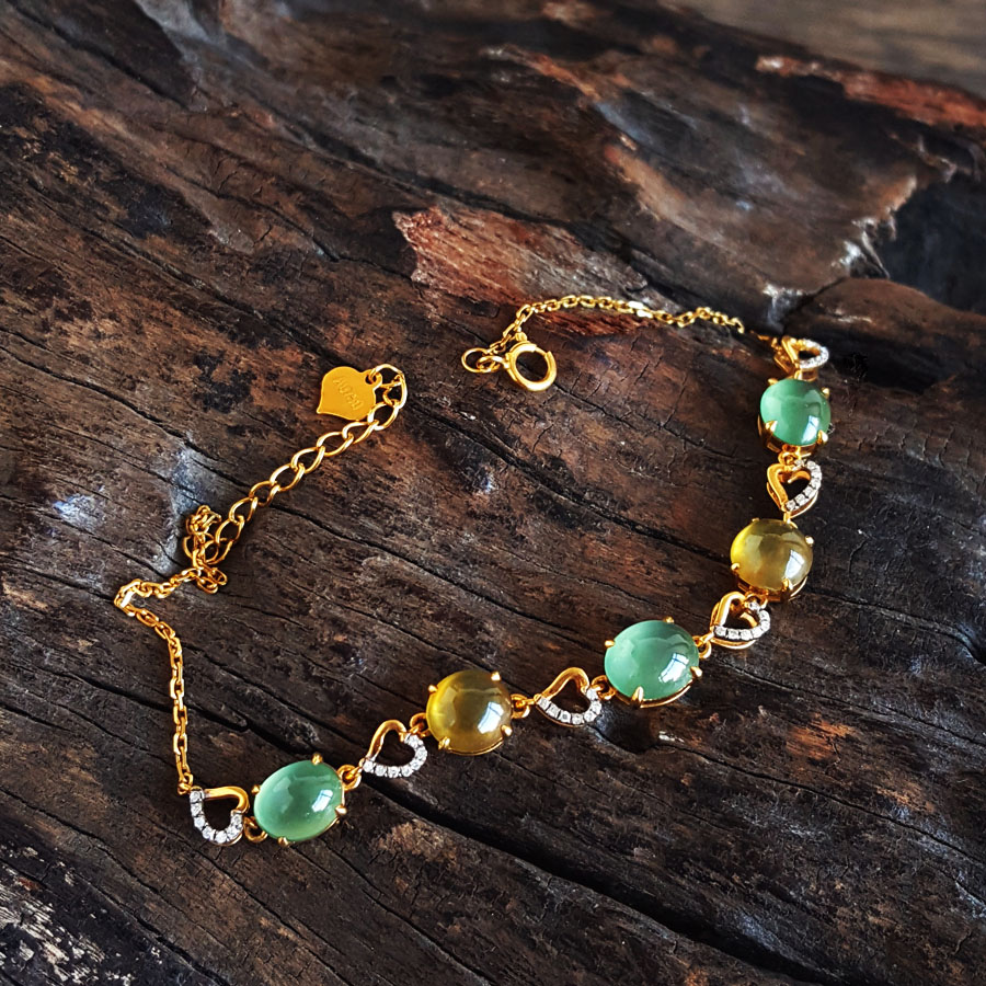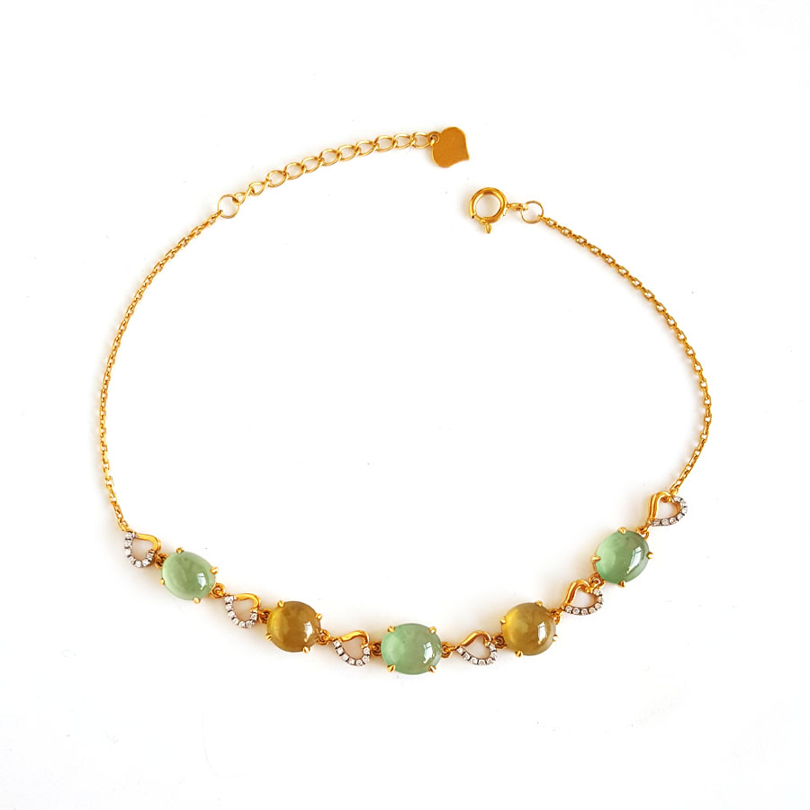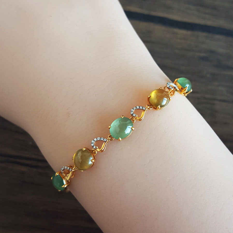 名称 | AU750黄金镶钻镶天然细腻晴水冰种蛋面翡翠配符山石手链 |