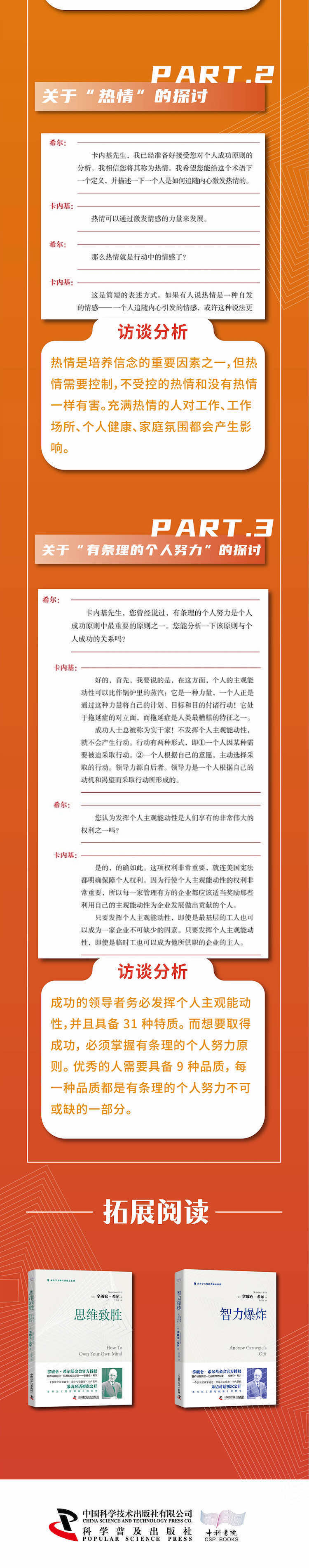 拿破仑·希尔根据1908年采访安德鲁·卡内基时第一次从他那里学到的成功原则在1941年写了17本小册子,其中每本小册子都讲解了1项成功原则。当时的希尔是一名年轻的杂志记者,被派去采访卡内基先生,卡内基先生对他印象非常深刻,于是委托他研究成功人士并撰写一本关于个人成功哲学的书籍。希尔在随后的20年里不断与成功人士会面,并把自己学到的知识写进了1928年出版的经典著作《成功法则》(The Law of Success)之中。1937年,他又写了一本经典著作,并将其命名为《思考致富》(Think and Grow Rich)。 希尔于1941年撰写的17本小册子被命名为《智力爆炸》(Mental Dynamite),智力爆炸是卡内基先生用来描述17项成功原则的一个短语。每本小册子都包含希尔对卡内基先生访谈的长篇摘录以及希尔对书中成功原则所做的独特分析。但在这些小册子出版几个月后,美国就参加了第二次世界大战,可想而知,这些小册子也因此无暇被美国人关注。现在,拿破仑·希尔基金会从档案中重新找到了它们,并将为新一代读者出版这些小册子。 拿破仑·希尔基金会在本书中汇编了希尔所写的3本小册子,这3本小册子阐述了在确定一个明确的主要目标并制订一个实现这个目标的计划之后,如何通过行动来实现目标。因此,一旦思考过程圆满结束,你就应该践行这些章节提出的原则了。正如希尔在第三章中所说,“计划你的工作,并实施你的计划”,本书的内容始于计划制订之后,并集中讨论了如何实施计划。 在第一章“践行信念”中,希尔首先阐述了他在1908年对卡内基先生的访谈中重点谈及这一原则的内容。卡内基先生告诉年轻的希尔,想要完成研究出一套个人成功哲学这一为期20年的工作,他需要践行信念。随后卡内基先生解释了盲目的信念、消极的信念和积极的信念之间的区别。卡内基先生以一种近乎诗意的方式明确了头脑的各种能力,然后向希尔解释说,一个人只有在恐惧和自我强加的限制被践行信念取代之后才能获得这些能力。培养这一信念需要的是行动、坚持和重复,一个人一旦形成这一信念,无限智慧就可以帮助他实现自己计划的目标。 在讲述了他与卡内基先生的访谈内容后,希尔又讲述了两个自己亲身经历的故事,以此来说明他是如何通过践行信念取得成功的。第一个故事发生在大萧条时期,银行倒闭使他血本无归,但他开始明白,大自然的运转和无限智慧比金钱更加重要,这一发现使他产生了坚持所需的践行信念的想法。第二个故事讲述了他的儿子拿破仑·布莱尔(Napoleon Blair)的神奇经历。布莱尔出生时就没有耳朵,多亏了希尔践行信念,使布莱尔在没有任何物理听力仪器帮助的情况下获得了听力。 接着,希尔讨论了自我在获得成功过程中的重要性,并指出应该如何控制自我。正如卡内基先生所说,必须用信念取代恐惧和怀疑,这样自我的渴望才能实现。希尔列举了一些人们控制其自我的例子,以及男人的自我由妻子所控制的例子,在所有例子中,这种对自我的控制对于他们的成功至关重要。希尔总结了践行信念的重要性,他表示,践行信念是“强大的自然规律”,因为它可以让一个人获得满足自己渴望的物质。 第二章“热情”同样以希尔1908年对卡内基先生的访谈摘录开始。卡内基先生表示,热情对于清除头脑中的消极思想是必不可少的,只有这样,信念才能取代头脑中的消极思想。这是希望的一种表现,希望是培养信念所必需的,而希望、信念和热情对于取得成功而言都是必不可少的。卡内基先生详细介绍了拥有和保持热情所面临的诸多障碍,例如,健康状况不佳、酗酒。他解释了年轻的希尔所处的贫困的成长环境如何伴随着同等优势的种子,即希尔的继母灌输给他的热情,正是这种热情促使他成为一名杂志记者。 卡内基先生谈到了热情以及缺乏热情是如何“传染”并在一个企业、机构或家庭中传播的。热情是一种积极的心态,但它必须由自律加以控制,否则就可能被误导。每一个智囊团都必须有充满热情的成员,但也至少要有一个不热情的成员,以平衡和控制热情。 归根结底,热情就像践行信念一样,是超越思维阶段,并基于明确的主要目标,通过行动实施自己的重大计划所必需的要素。 在介绍了他与卡内基先生的访谈之后,希尔详细阐述了他的心得。他表示,热情是“行动的信念”和“思想的行动因素”,热情可以把消极的态度转变为积极的态度。他解释了为什么培养热情需要均衡与和谐的心态。他列举了拥有热情所能实现的许多积极事件,重要的是将消极的情绪转化为积极的情绪,并为信念的培养做好心理准备。 希尔强调了成为一名能够打动他人的演讲者的重要性,因为话语是一个人展现热情的主要方式。随后,他讲述了自己与发明家托马斯·爱迪生的一次长时间访谈,以此展示了爱迪生先生对工作的热情如何驱使他本人发明了留声机并改进了白炽灯。希尔还提供了一份有用的清单,在其中列出了培养热情需要采取的步骤。他对世界的未来满怀憧憬,并对本章进行了总结,他的这种憧憬主要是基于他相信未来的人们会充满热情。 第三章希尔介绍了“有条理的个人努力”原则。本章同样是从希尔对卡内基先生的访谈摘录开始的。卡内基先生描述了领导力的31个特征,并强调了迅速采取行动的必要性。有条理的个人努力需要一个目标、一个计划、持续的行动和坚持不懈