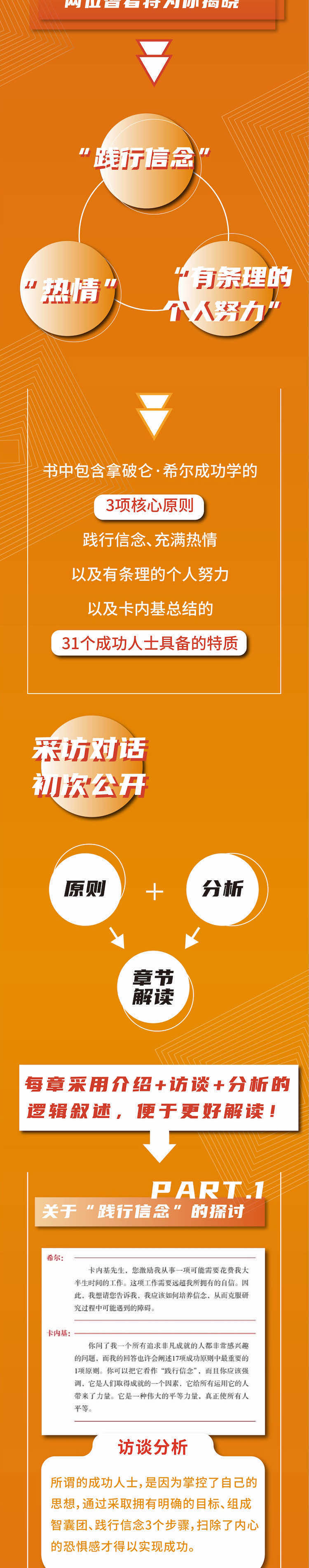第一章| 践行信念 在本章中,卡内基先生通过阐述践行信念在培养自立能力过程中的应用,开始他对践行信念的分析。所谓的成功人士,是因为掌控了自己的思想,通过采取拥有明确的目标、组成智囊团、践行信念3个步骤,扫除了内心的恐惧感才得以实现成功。 对践行信念的简要介绍 访谈摘录一:践行信念原则 对践行信念原则的分析 ——拿破仑·希尔 第二章 | 热情 热情是培养信念的重要因素之一,但热情需要控制,不受控的热情和没有热情一样有害。充满热情的人对工作、工作场所、个人健康、家庭氛围都会产生影响。文中提出 22 种阻碍热情的因素,缺乏热情的人无法成功。 访谈摘录二:热情原则 对热情原则的分析 ——拿破仑·希尔 第三章 | 有条理的个人努力 成功的领导者务必发挥个人主观能动性,并且具备 31 种特质。而想要取得成功,必须掌握有条理的个人努力原则。优秀的人需要具备 9 种品质,每一种品质都是有条理的个人努力不可或缺的一部分。 访谈摘录三:有条理的个人努力原则 对有条理的个人努力原则的分析 ——拿破仑·希尔 关于作者