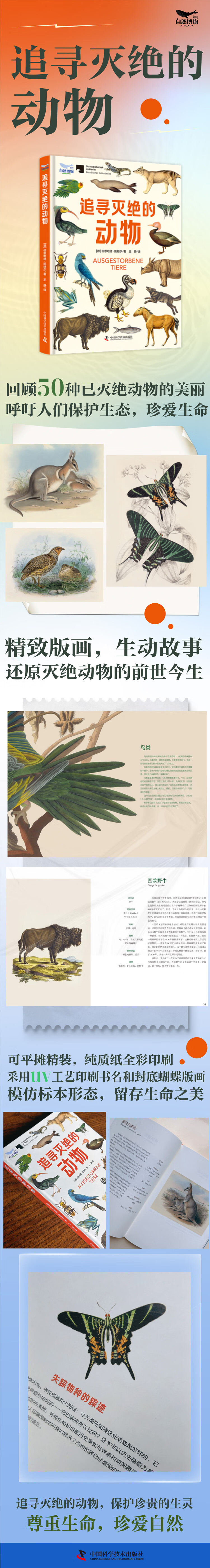 早在人类出现在地球上之前,动物就已经不断繁衍生息、演化改变,在各种地理环境下发展出不同的形态和生活习惯。而随着地理条件的变化和人类社会的发展,一些动物物种由于各种各样的原因,在时间的轨道中走向灭绝,令人惋惜。了解这些已经灭绝的动物的情况,能够帮助人类更好地进行动物保护,更能让人类在历史的经验中学习如何与动物共存、与自然相处,从而更好地为地球的生态保护做出人类的贡献。这本科普读物精选了五十幅已灭绝动物的插画图片,让现代人得以了解已灭绝动物的样貌和特点,结合简明细腻的语言和清晰准确的分类框架,讲述了这些动物生活和消失的故事。通过这些生动的资料,读者能够进一步走近已灭绝动物的世界,更全面地了解动物世界之美,从而更加珍爱生命,敬畏自然,以自己的方式呵护动物的世界。