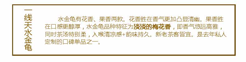 本款为花香款,胜在香气更加凸显清幽。水金龟品种特征为淡淡的梅花香,即香气悠远高雅,同时茶汤特别柔,入喉清凉感+韵味持久。新老茶客皆宜。是去年私人定制的口碑单品之一。