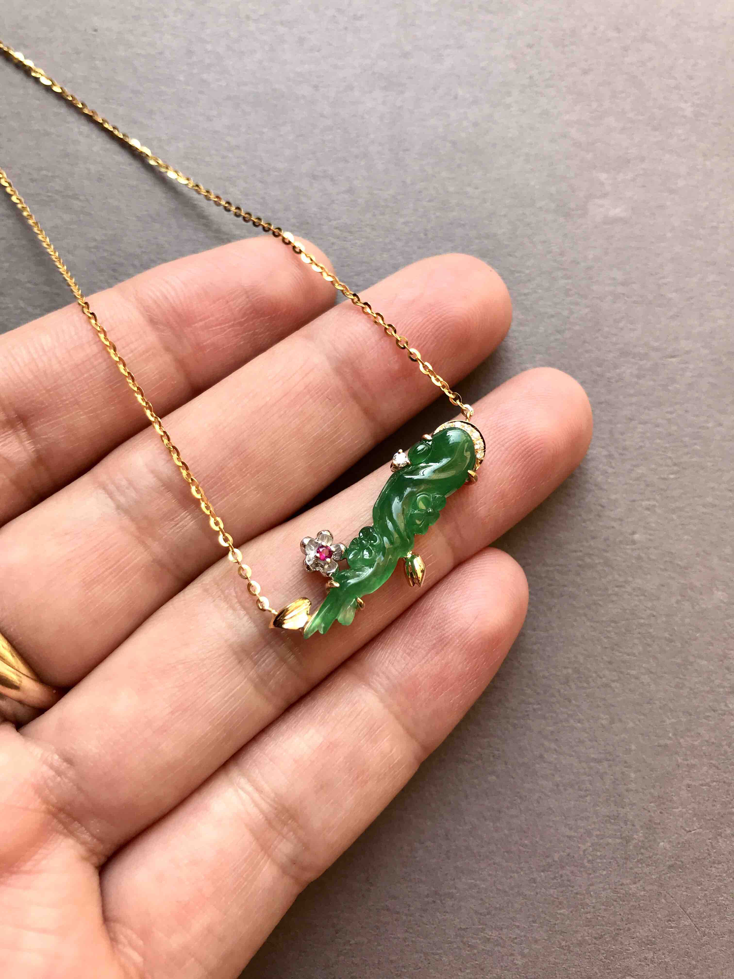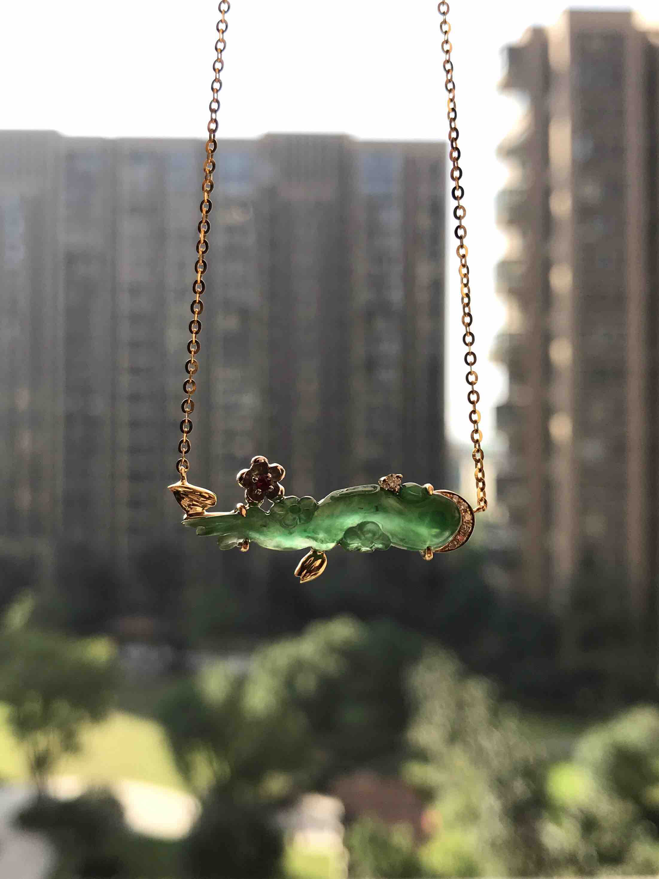 设计师款,别具一格,冰种阳绿一剪梅,裸石27.2×6.4×4.9mm,种水晶莹剔透,荧光四射,色标级的阳绿特别漂亮,翡翠精雕细刻,朵朵梅花。18k黄金钻石镶嵌,项链也是18k金,白金雕琢一朵梅花,梅心红宝石,与翡翠雕刻交相呼应,实乃点睛之笔。项链长度40cm,延长链4cm。精品推荐