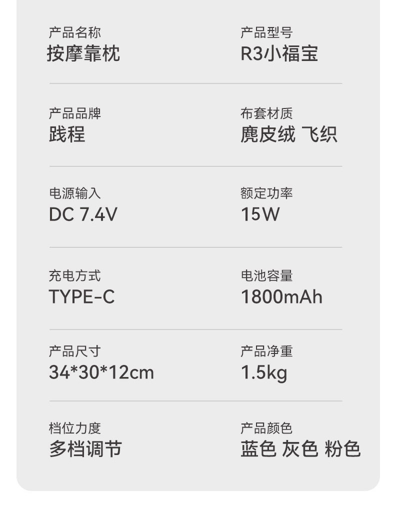 【品名】践程按摩靠枕 R3小福宝 仿人手正反揉捏 多档可调 无线便携 【规格】蓝色、灰色、粉色 额定电压:DC 7.4V 额定功率:12W 按摩时间:15分钟 控制方式:机身按键 产品净重:1.5kg 产品尺寸:34x30x12cm 彩盒尺寸:345x135x305mm 【产地】国内 【材质】 布套材质:麂皮绒 飞织 内芯材质:PU成型棉高回弹 【发货包装】独立包装 【发货地】福建 【发货快递】韵达 【补邮费地区】新疆、西藏+40元 内蒙古、宁夏、甘肃、青海+20元 【发货时效】48-72小时,周末节假日顺延 |