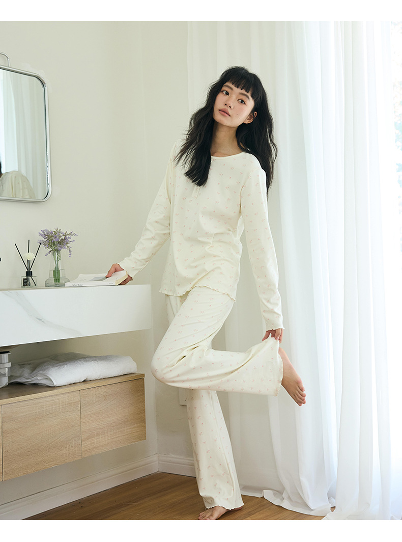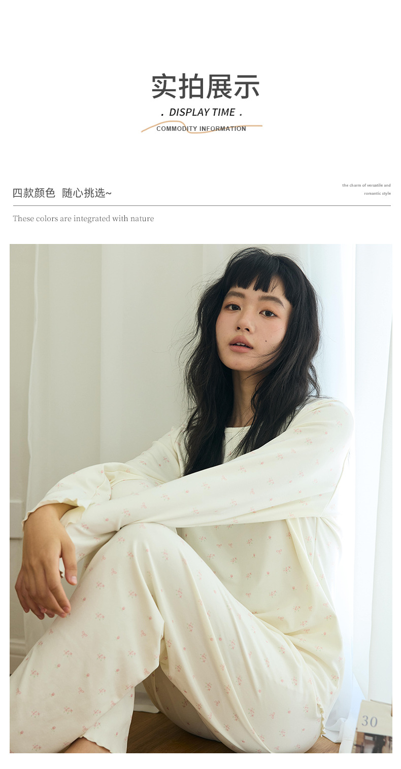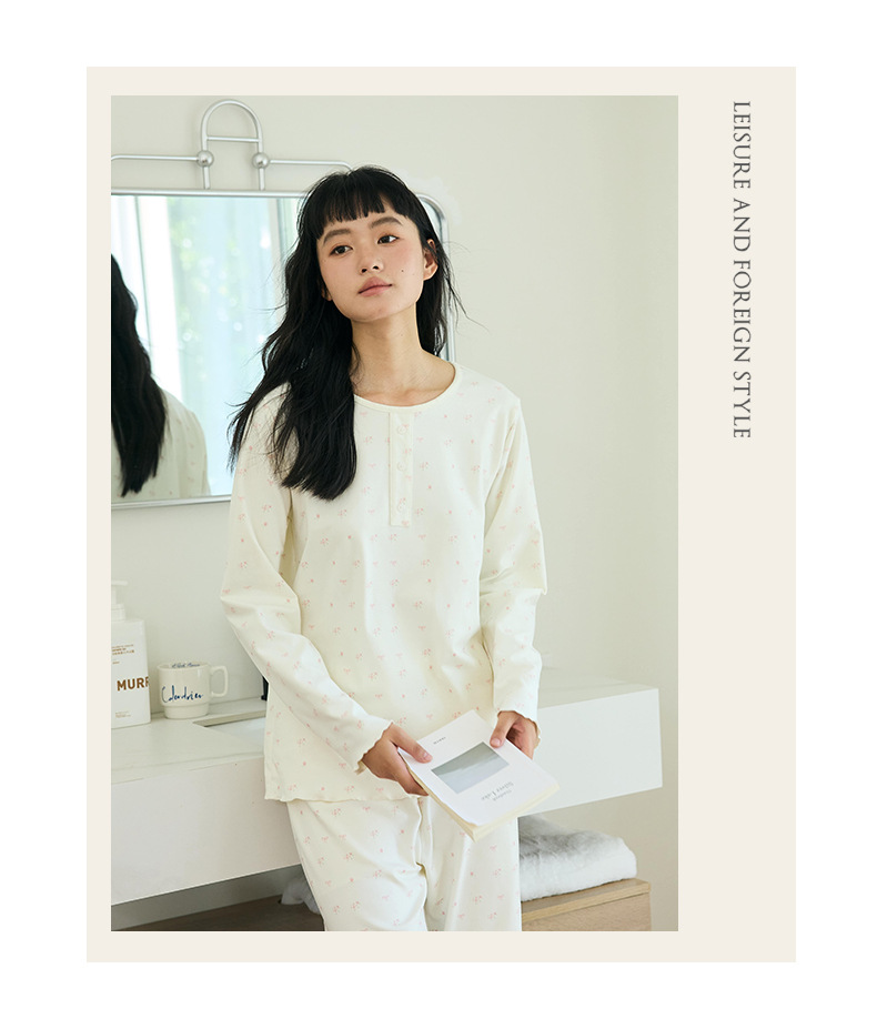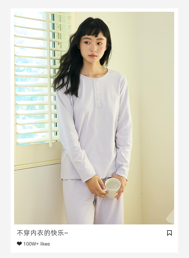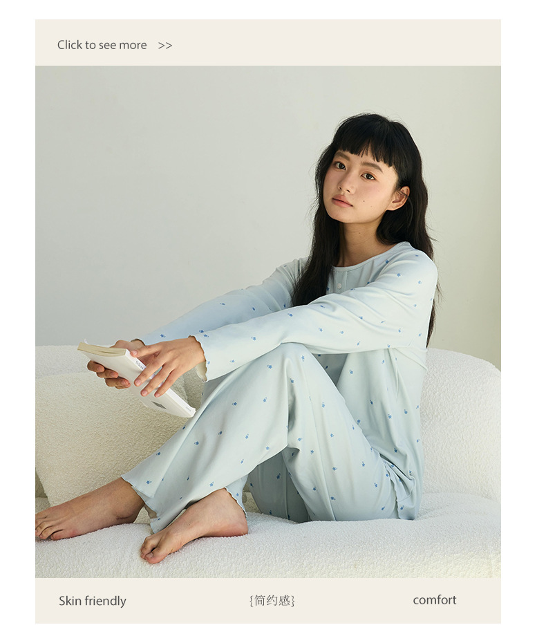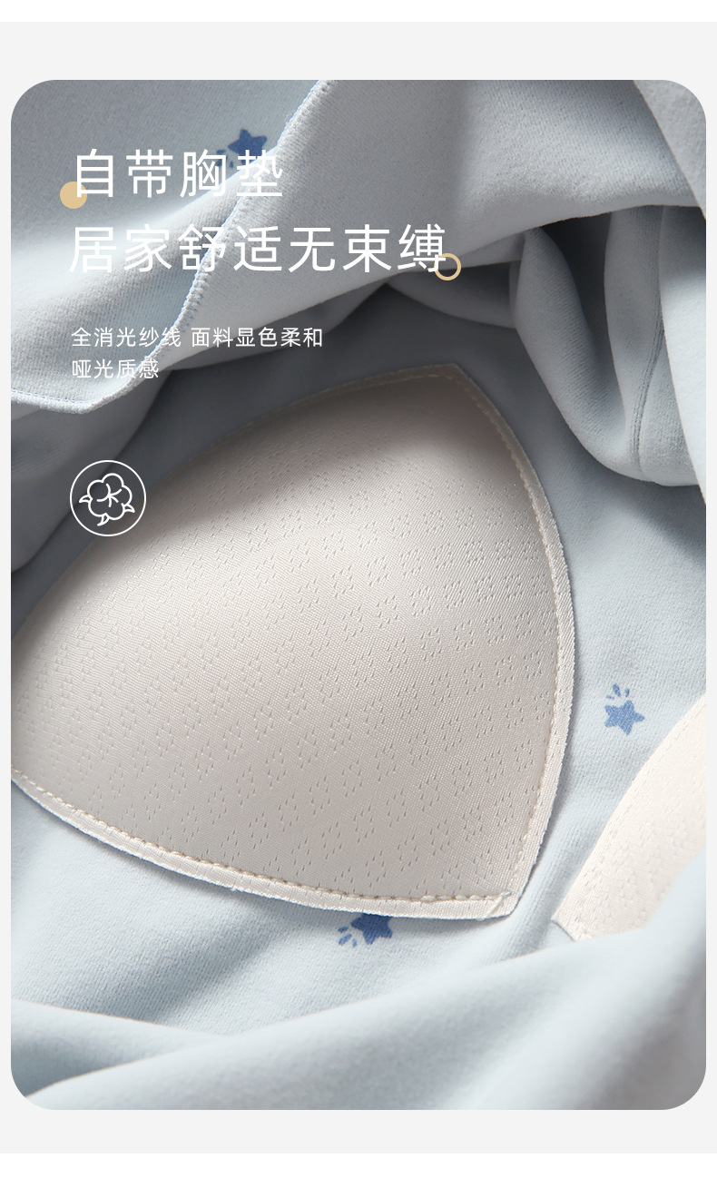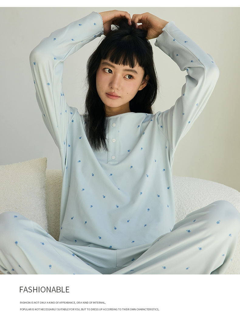 【免穿文胸】春款绵绵纽扣家居服女纯色长袖带胸垫套装舒适印花软糯微弹睡衣 居家无束缚~