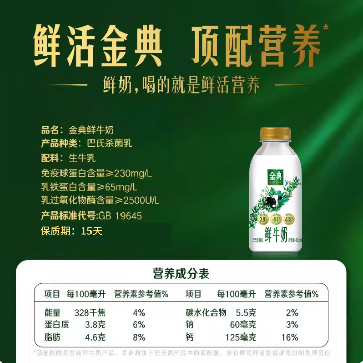 伊利金典 巴氏杀菌乳鲜牛奶 450ml/瓶