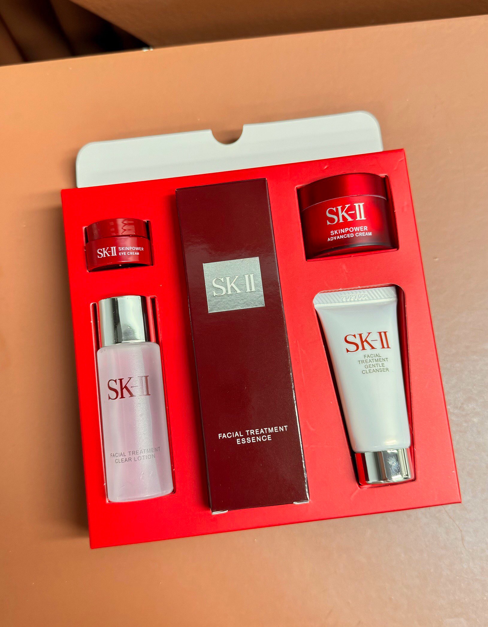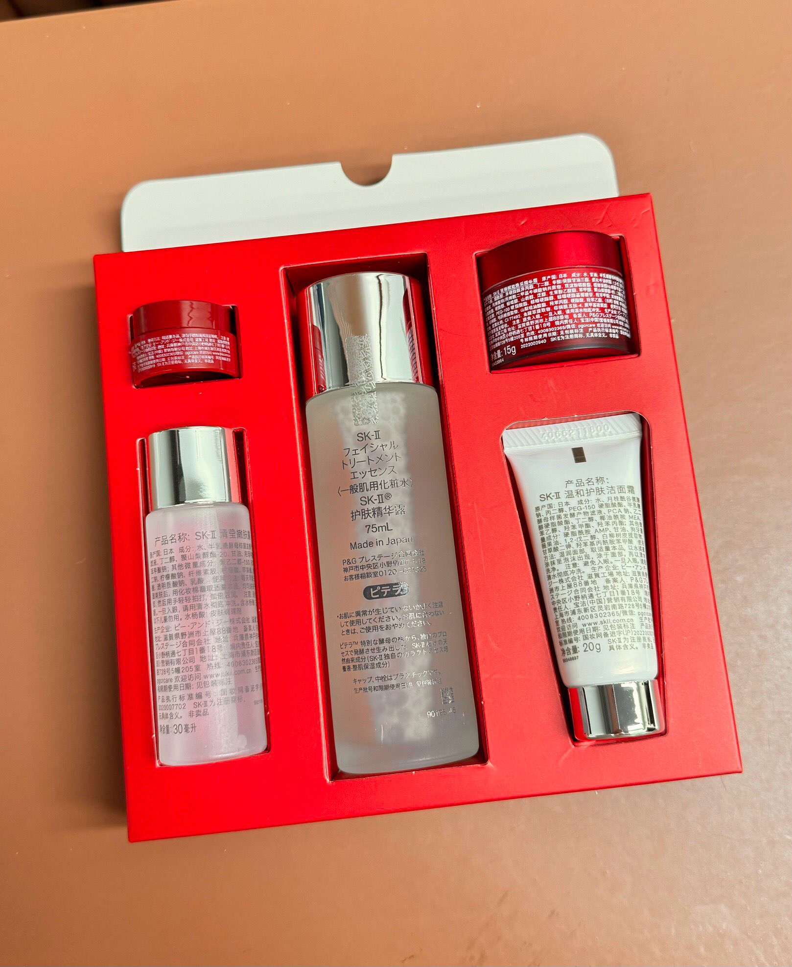 SK2全明星晶透五件套!内含:氨基酸洗面奶20g,嫩肤清莹露30ml,护肤神仙水75ml,大红瓶面霜15g,大眼眼霜2.5g。