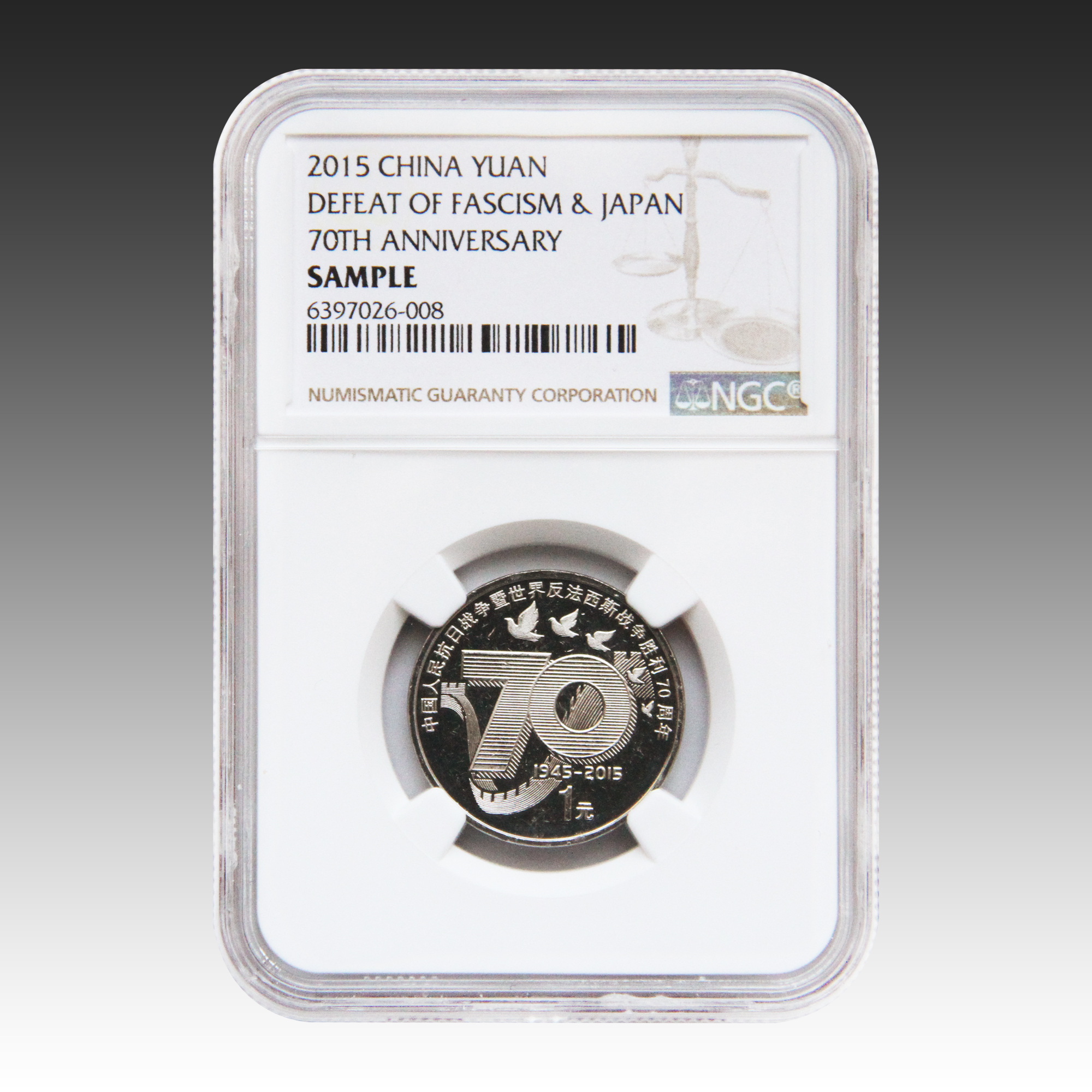 背面图案为数字“70”与时间“1945-2015”共同组成的标志性符号,其上方为五只和平鸽由远及近展翅飞翔,衬景为以长城图案展现胜利的“V”字。内缘上方刊“中国人民抗日战争暨世界反法西斯战争胜利70周年”字样,右下方刊面额“1元”。