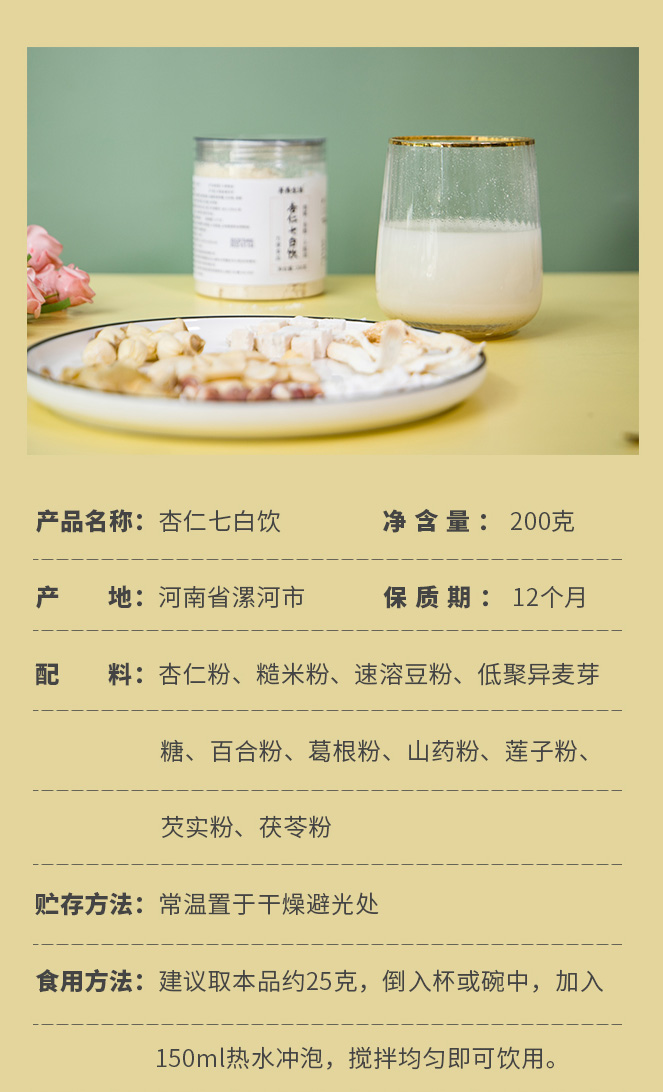杏仁七白饮,冲泡即食,重点是配料无任何添加剂,用麦芽糖醇增甜,没有什么人工香精色素、增稠剂、植脂末之类,全都没有,安全健康!也正是因为天然,所以味道比较温和,口感丝滑,有着轻微的油脂气,不喜欢的人,会觉得气味稍重,喜欢杏仁味的,比如我,却会觉得香醇厚重,有油润感。长期喝杏仁粉能滋润表皮肌肤、毛发,还能让嗯嗯更轻松。