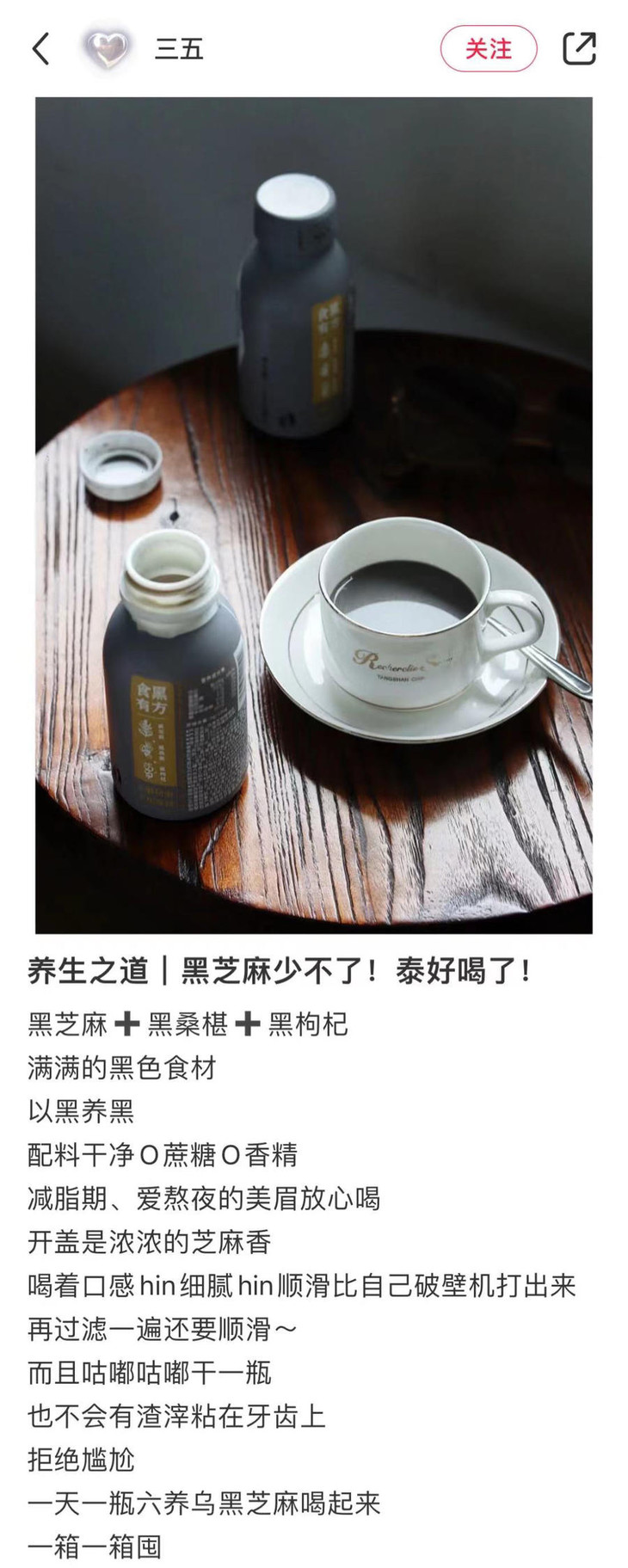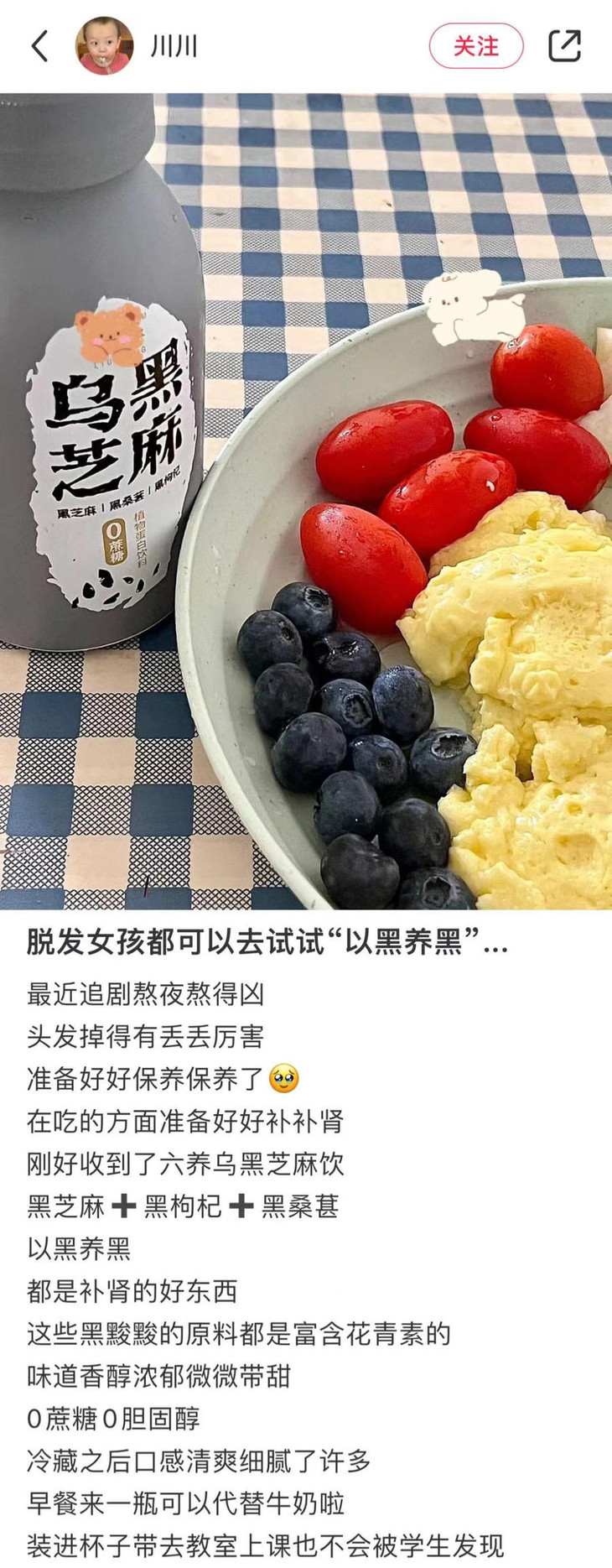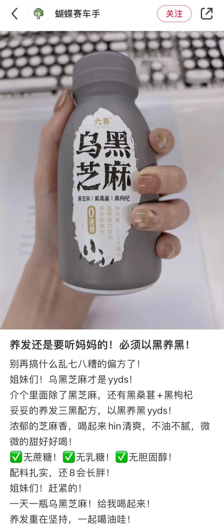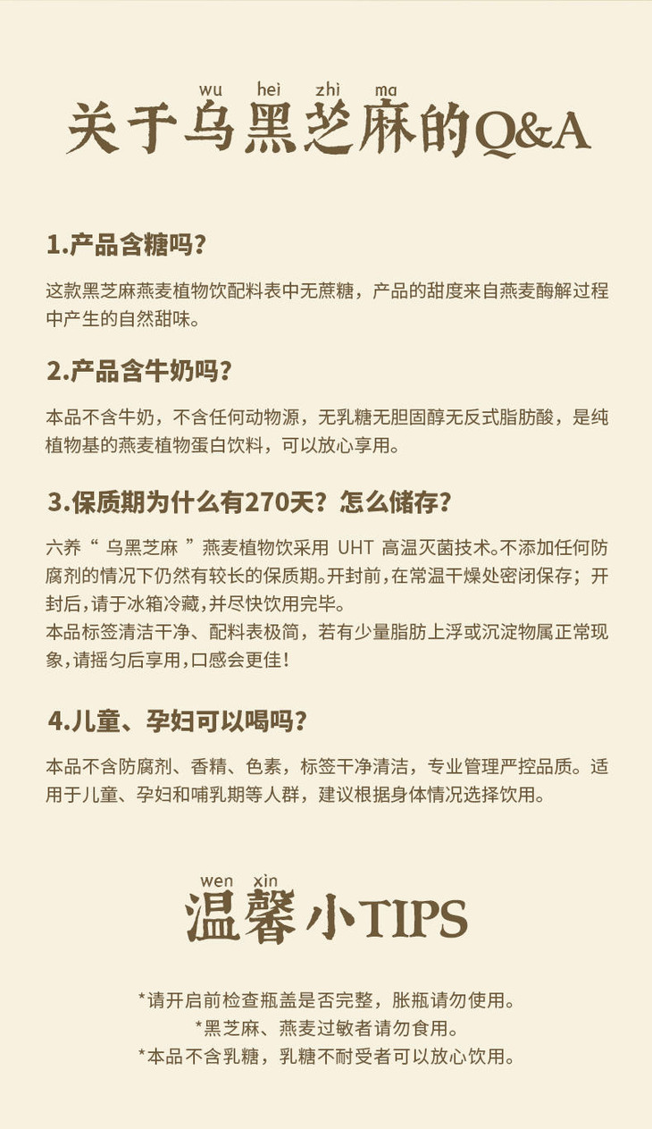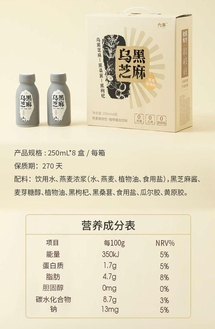 乌黑芝麻燕麦饮是六养在经典燕麦奶基础上,加入黑芝麻、桑葚、黑枸杞这“三黑”打造出的一款“可以喝的黑芝麻丸”。中医认为,食物的颜色对应着人体的五脏,“黑色属水,入肾”,常吃黑色食物能补肾。《素问六节脏象论》中又说:“肾主藏经,精生于血,其华在发”的说法。店里我也上过好几款“黑”食,包括亨博士黑芝麻核桃黑豆黑米桑葚粉、胡庆余堂的黑芝麻丸、全控谷的乌圣糕还有黑豆、黑玉米等等等等,六养的黑芝麻燕麦饮是在传统配方上改进升级,用江西黑芝麻、青海黑枸杞和四川桑葚这三大黑色食材研磨,再与燕麦浓浆科学配比,0蔗糖0胆固醇0乳糖!