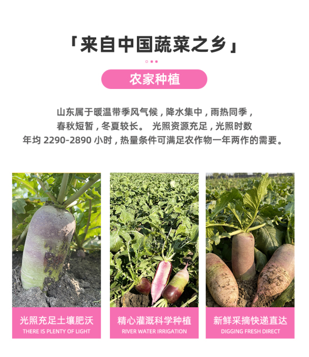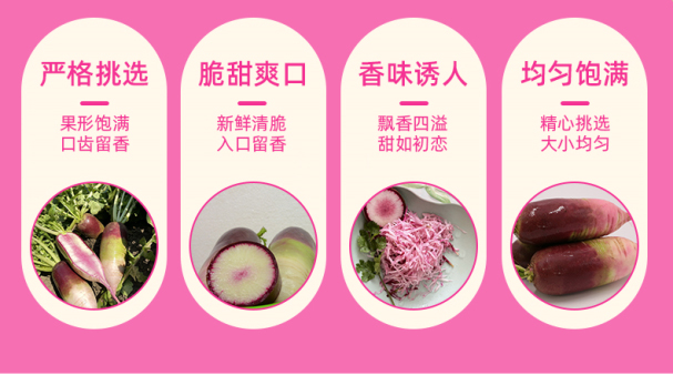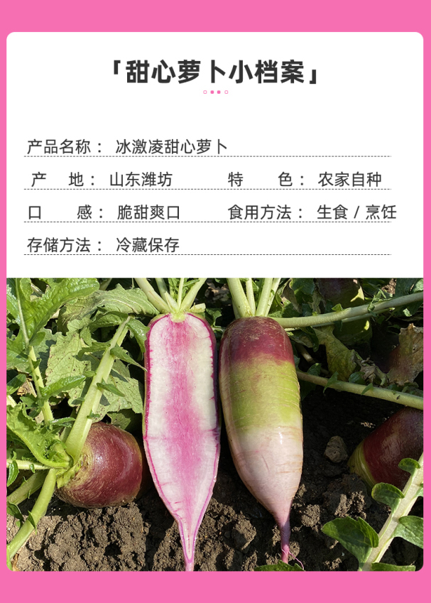 冰激凌甜心萝卜,来自“蔬菜种植业硅谷”的山东潍坊,它是一种新型萝卜品种,看上去就像一个多层冰激凌,因此得名。潍坊的萝卜栽培历史至今已有300多年,因为降水集中,雨热同期,春秋短暂,冬夏较长,所以在这里生长的萝卜进行了充足的光合作用,甜度高。而种植萝卜的农户们有着自己的一套种植经验,选用发酵的大豆蛋白肥和天然井水灌溉,坚持物理防虫,不打农药,不催熟,让每一个萝卜都自然生长。冰激凌萝卜水分充足、脆度大,都是农户们亲手采收、检验无伤再发出的。