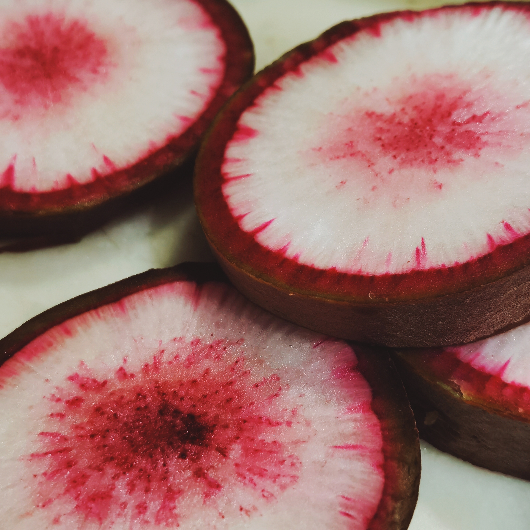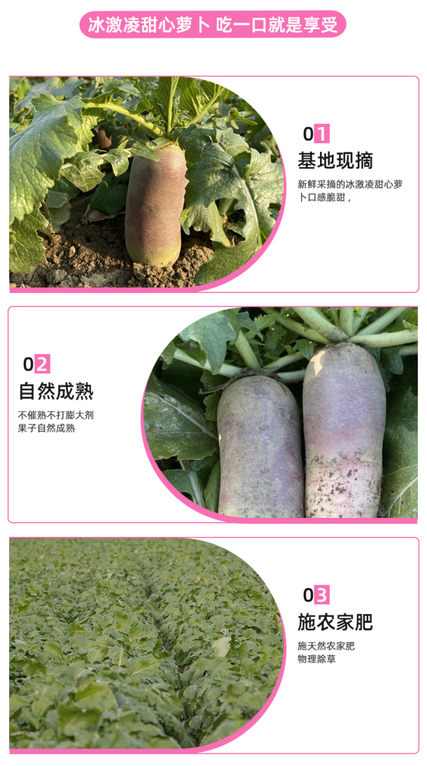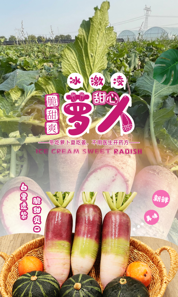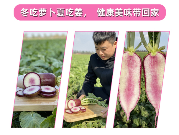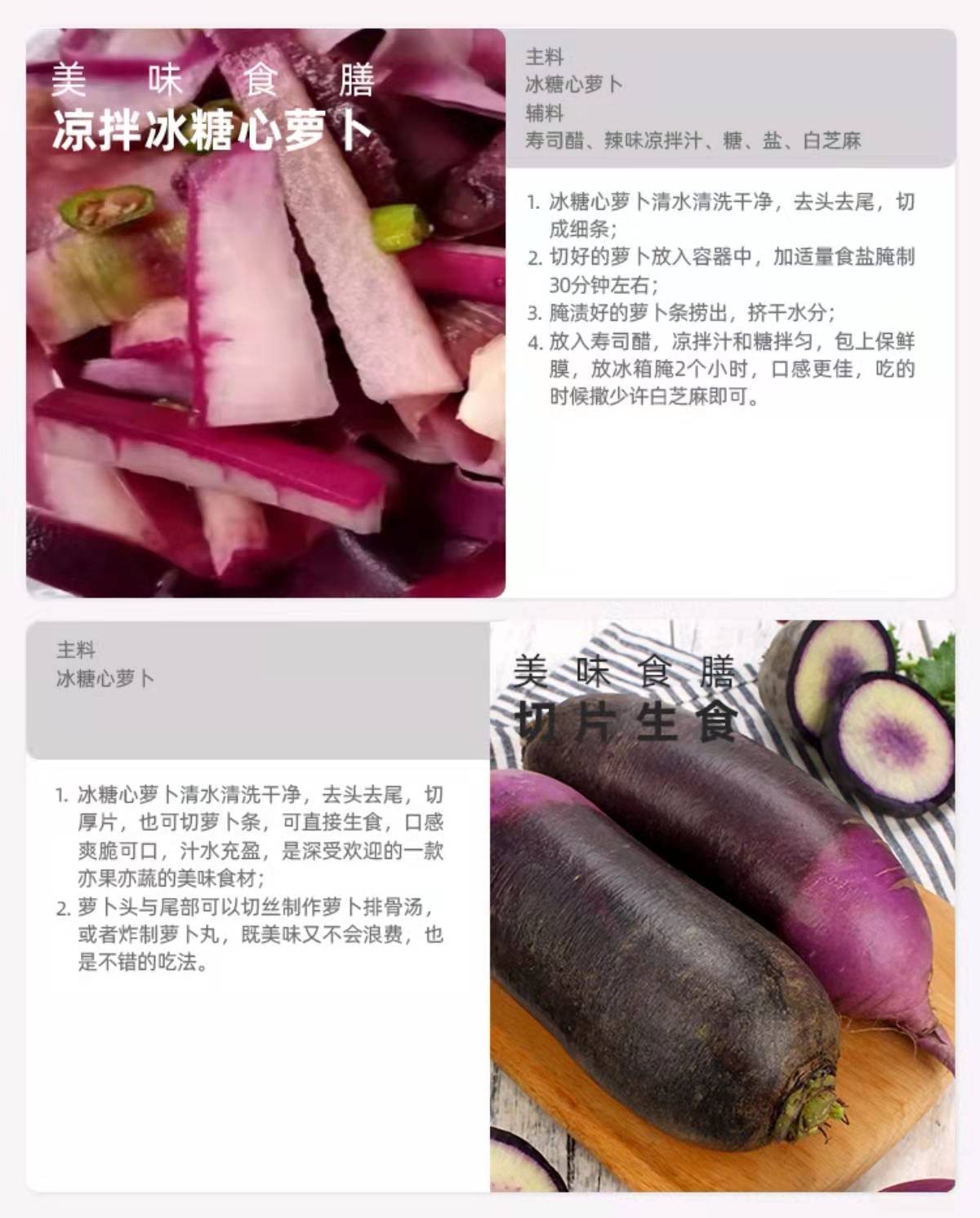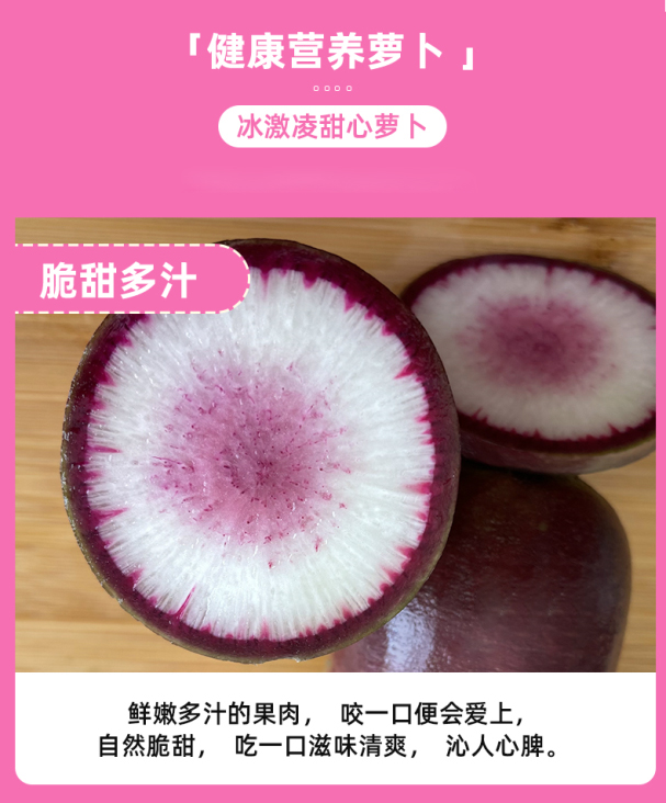 说它是萝卜界颜值的“天花板”一点都不夸张,萝卜从根部往上呈现三个颜色,先是透亮的白色,中间是青翠的绿色,再往上就是高贵的紫色,搭配起来好看!萝卜很脆,白中透紫,内心泛红,是个名副其实的“花心萝卜”。水分也真的特别多、肉质晶莹剔透,咬一口脆甜爽口,辛辣味很弱,有点像在吃水果,微微甜。基地的人告诉我说,冰淇淋胡萝卜正常糖度都在8度以上,在冰箱冷藏里放上三到五天,甚至一周的时间,糖度能达到10度,口感自然也就更好!