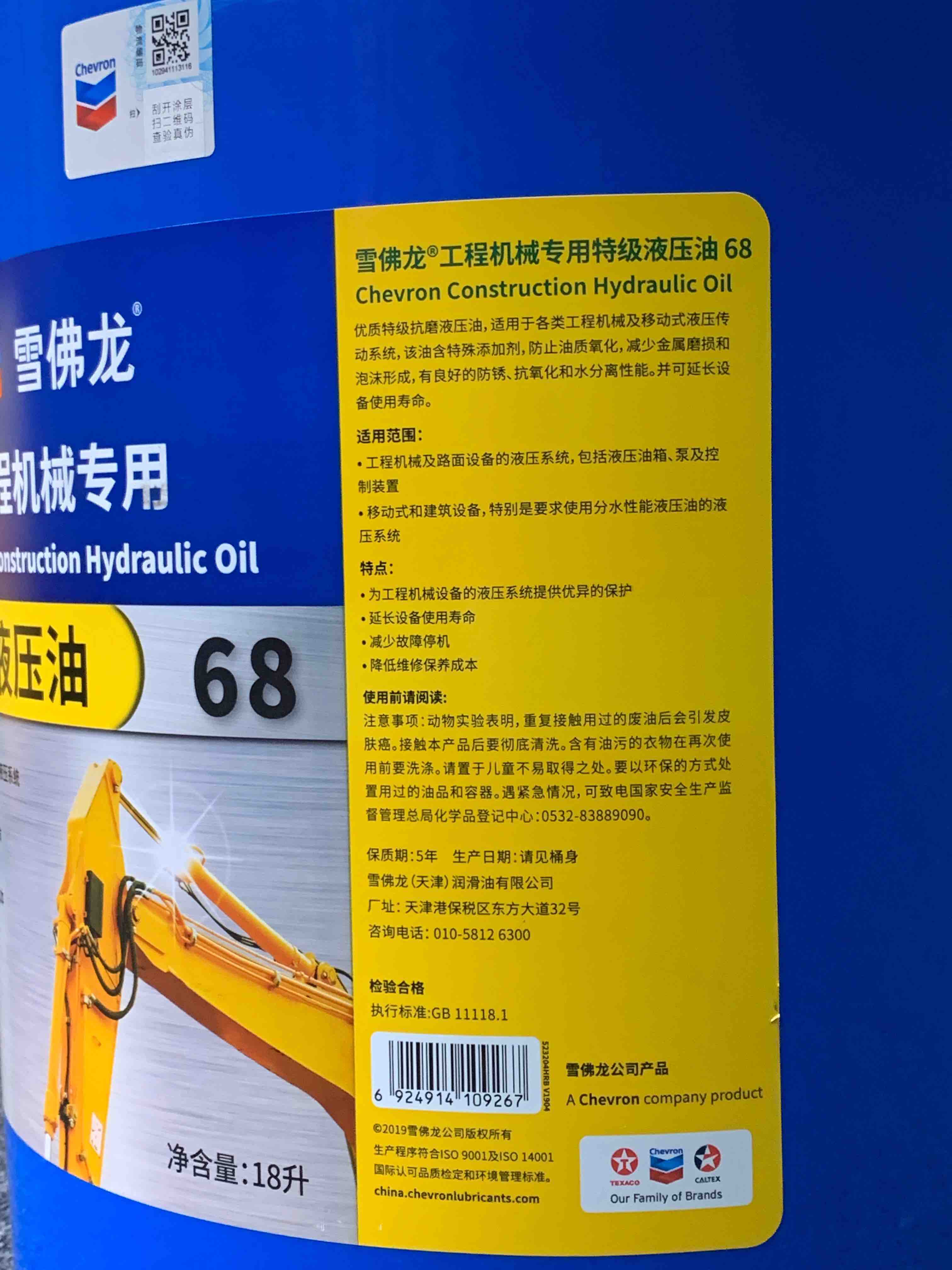 加德士“雪佛龙”工程机械专用 特级液压油68