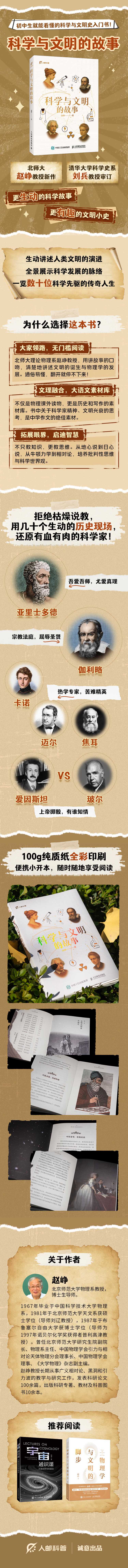 北京师范大学物理系教授,博士生导师。1967 年毕业于中国科学技术大学物理系,1981 年于北京师范大学天文系获硕士学位(导师刘辽教授),1987 年于布鲁塞尔自由大学获博士学位(导师普利高津教授)。曾任北京师范大学研究生院副院长、物理系主任、中国物理学会引力与相对论天体物理分会理事长、中国物理学会理事、《大学物理》杂志副主编。赵峥教授长期从事广义相对论、黑洞和引力波的教学与研究工作,发表科研论文 100 余篇,出版科研专著、教材及科普图书 10 余本;曾两次获得国家教委(现)科技进步二等奖,两次获得中国图书奖。北京师范大学物理系教授,博士生导师。1967 年毕业于中国科学技术大学物理系,1981 年于北京师范大学天文系获硕士学位(导师刘辽教授),1987 年于布鲁塞尔自由大学获博士学位(导师普利高津教授)。曾任北京师范大学研究生院副院长、物理系主任、中国物理学会引力与相对论天体物理分会理事长、中国物理学会理事、《大学物理》杂志副主编。赵峥教授长期从事广义相对论、黑洞和引力波的教学与研究工作,发表科研论文 100 余篇,出版科研专著、教材及科普图书 10 余本;曾两次获得国家教委科技进步二等奖,两次获得中国图书奖。第一章 文明从野蛮中诞生电闪雷鸣,龙亡人生 002纸草泥板,书写文明 007荷马史诗,确有实根 011龟甲牛骨,重现强殷 017百花齐放,东西辉映 022第二章 黑夜里出现过明灯辽阔宇宙,火居中心 028学院萌蘖,阿卡德米 031吾爱吾师,尤爱真理 034科学中心,藏书万卷 036欧几里得,首创几何 040阿基米德,初建物理 042凯撒纵火,书城坍塌 048焚书沐浴,文明东移 051第三章 朝霞在悲壮中点燃地心宇宙,上帝推动 056文艺复兴,马丁挑战 059战战兢兢,“蠢材”翻天 063土星光环,密码隐瞒 070宗教法庭,屈辱圣贤 075第谷无鼻,慧眼观天 078上帝莫非,精通几何 083多难不屈,为天立法 088第四章 物理学使社会飞腾一六四二,伽逝牛生 098勤思苦想,终成伟人 100晚年牛顿,不受欢迎 103学者断头,明君促兴 107热学专家,苦难精英 113受辱离校,学徒勇进 120勤奋忍让,风范感人 123麦克斯韦,傻是聪明 127第五章 辉煌自乌云中降临居里家族,三获诺奖 134黑体辐射,量子降生 142旷世奇才,校不欢迎 145以太困难,权威迷津 151爱因斯坦,独辟蹊径 156剑桥科苑,英豪辈生 162哥本哈根,闪耀群星 166真空不空,妙趣横生 171上帝掷骰,有谁知情 175核弹起爆,战争和平 177第六章 宇宙从虚无里产生银河一系,太阳千亿 186时空变弯,有限无边 191宇宙爆炸,余热可见 198膨胀宇宙,是否有限 202物质能量,不都看见 204时空泡沫,虫洞可穿 208飞出地球,登月探天 212中国航天,飞跃向前 220- 新华一城书集 (微信公众号认证)