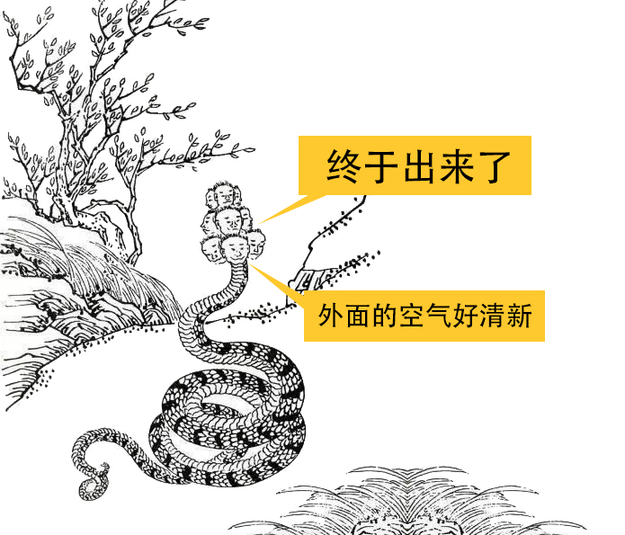 逃难至此的九婴怕被众多大神发现自己的身份,所以更名改姓为“相柳”。他把吃过的人的面皮附在蛇头之上以达到掩人耳目的目的,但终因恶习难改食人无数,并且制造了大水灾,惹怒众神,被大舜联合其他几位大帝将其镇压于昆仑,封印4000年。