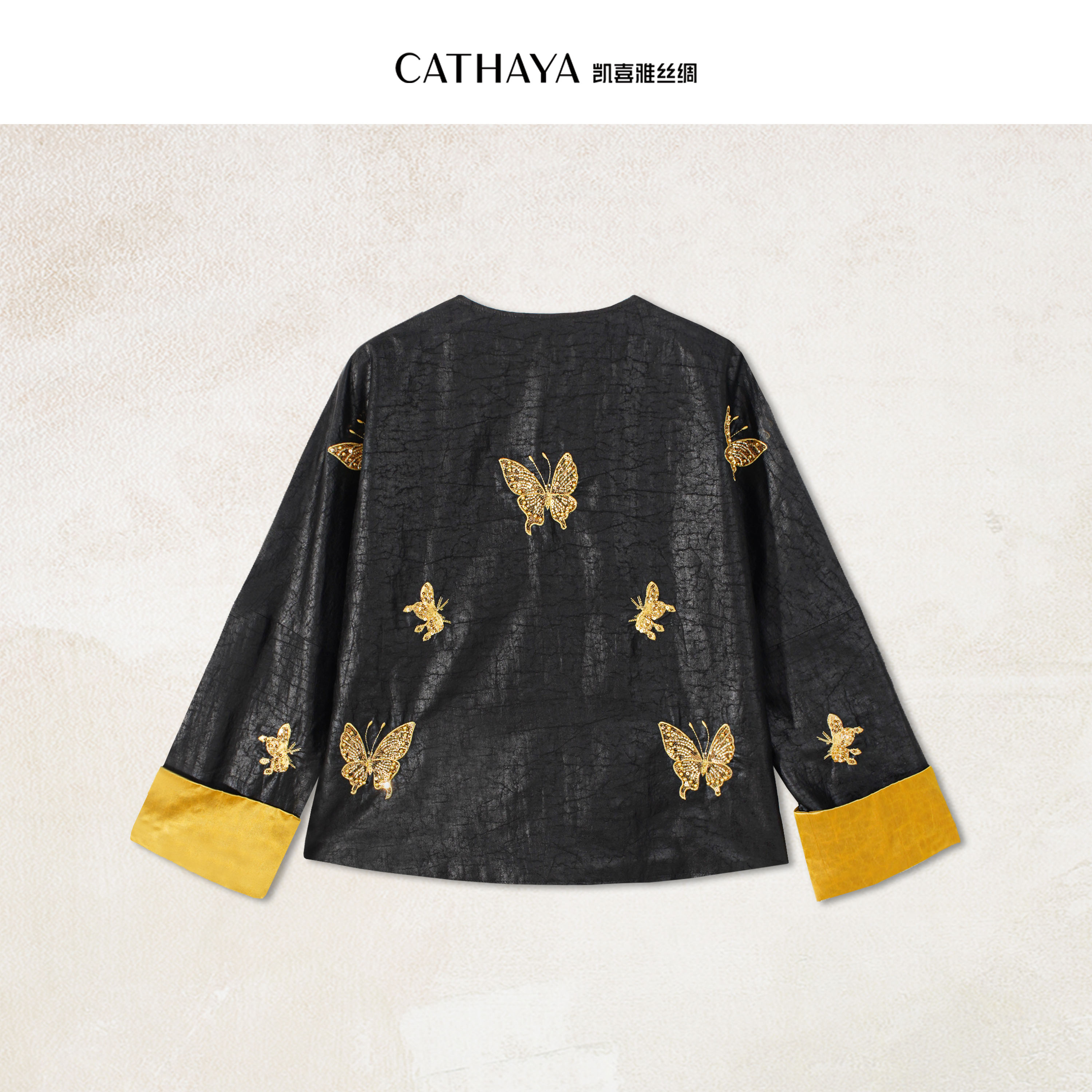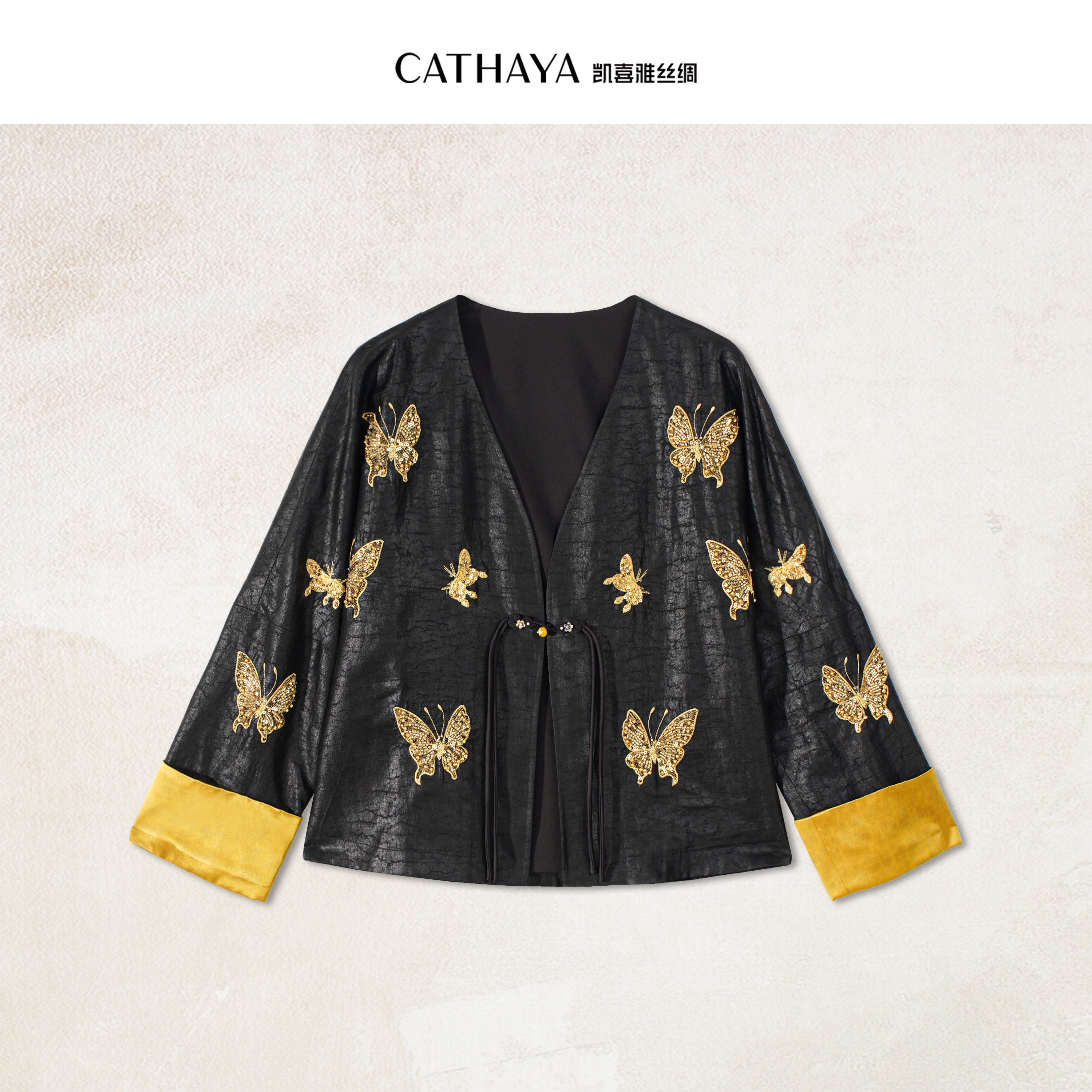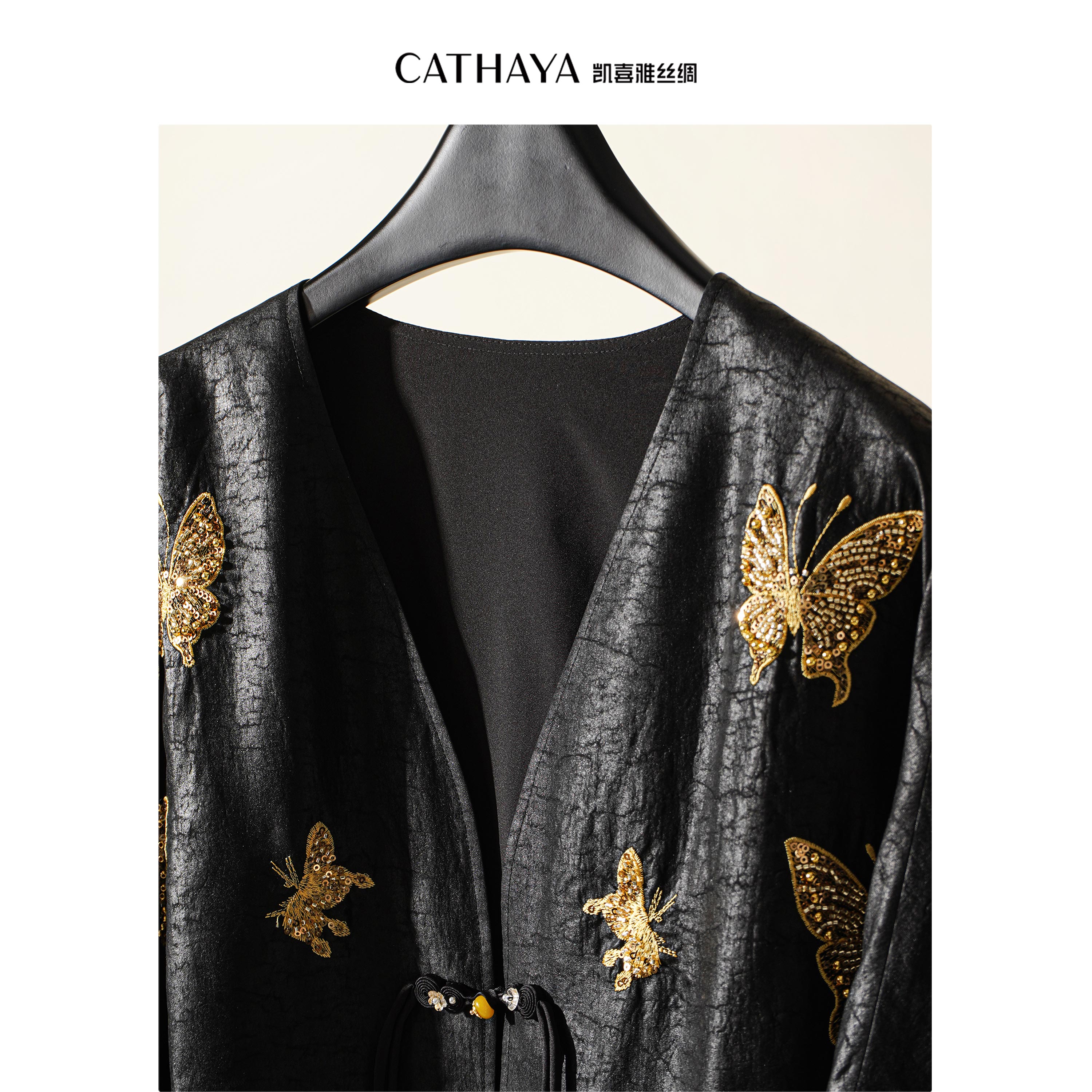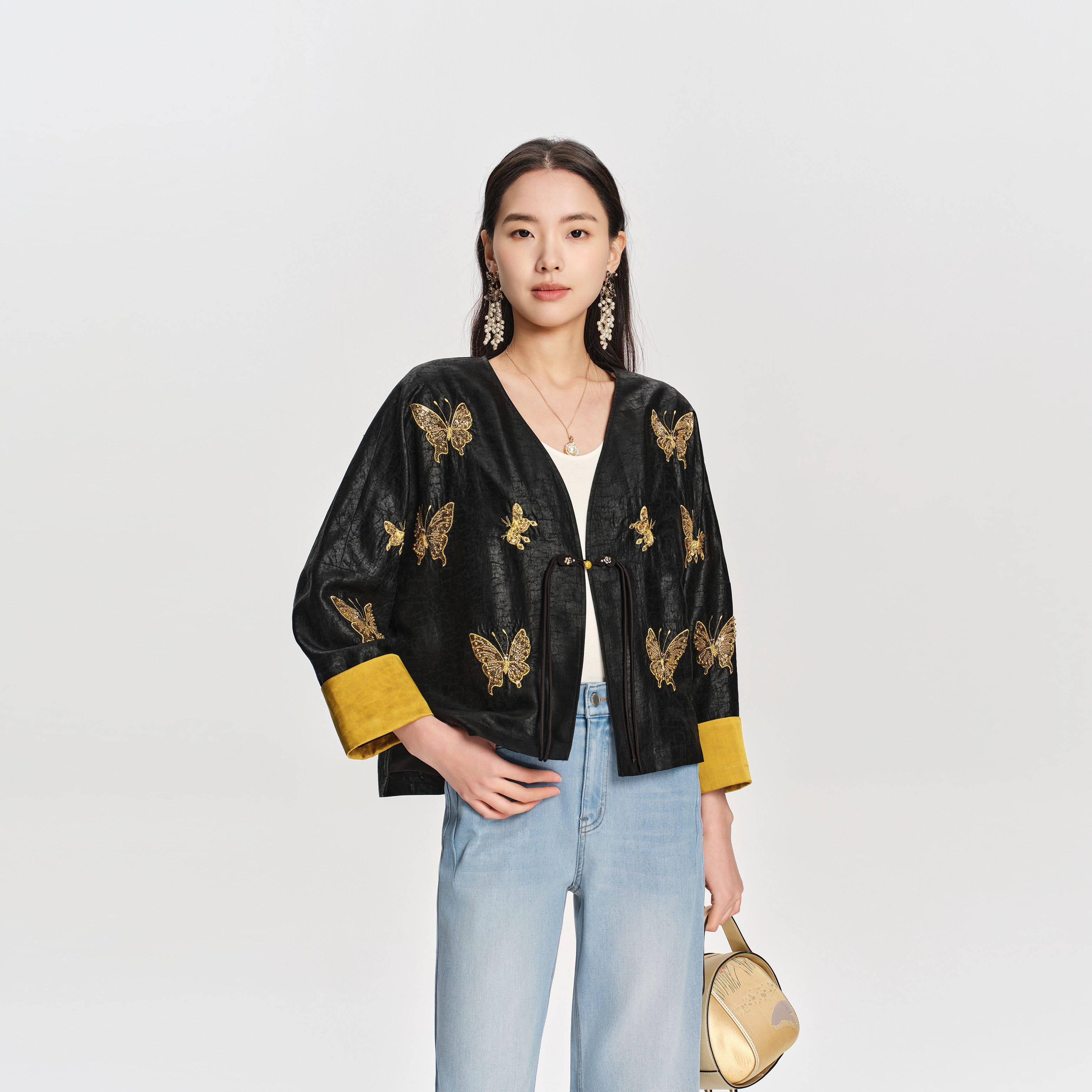 3.【东方韵味】V领搭配系带一字扣开合,单手穿脱都便捷。衣身蝴蝶与袖口撞色点缀,层次丰富,宽松廓形对身形包容度高!