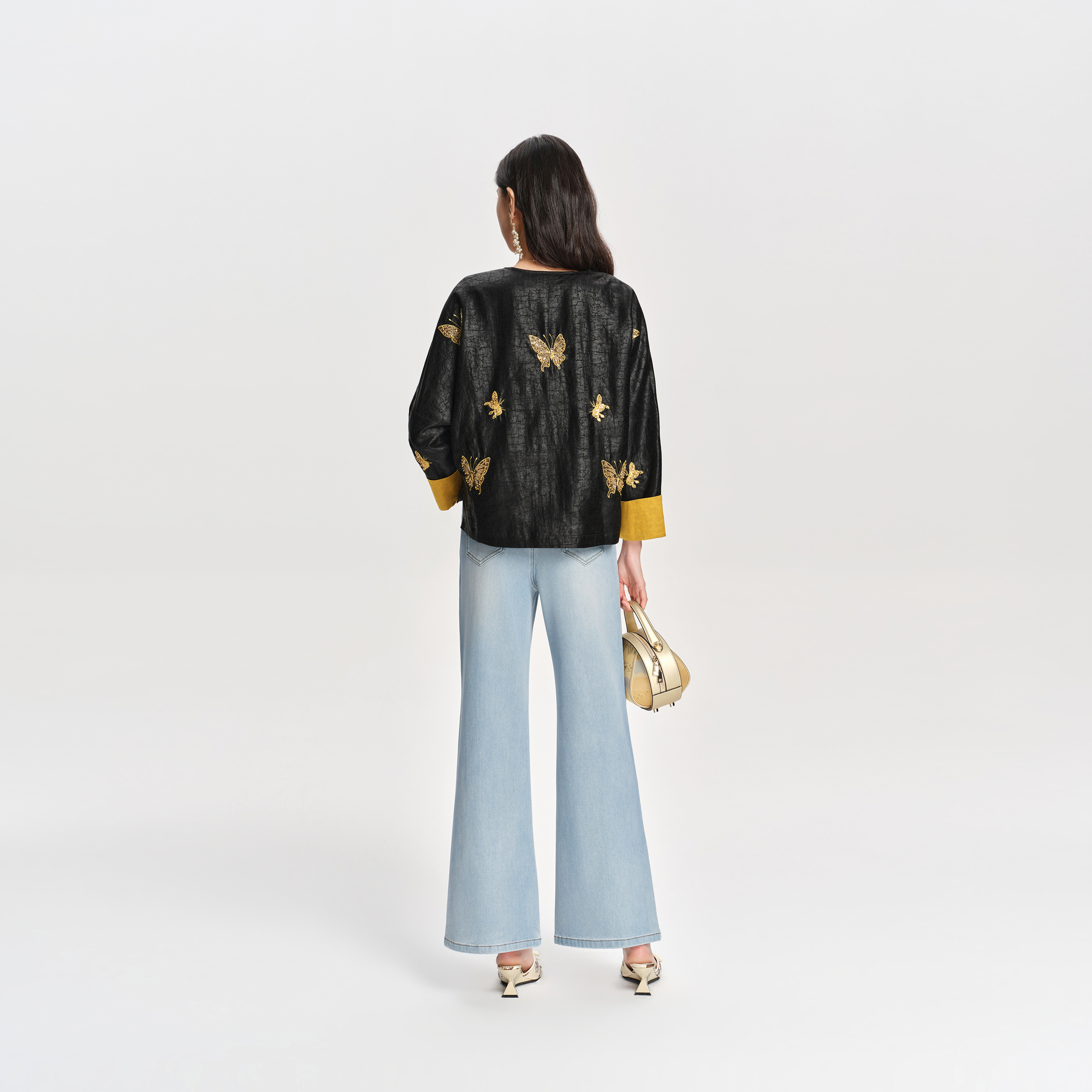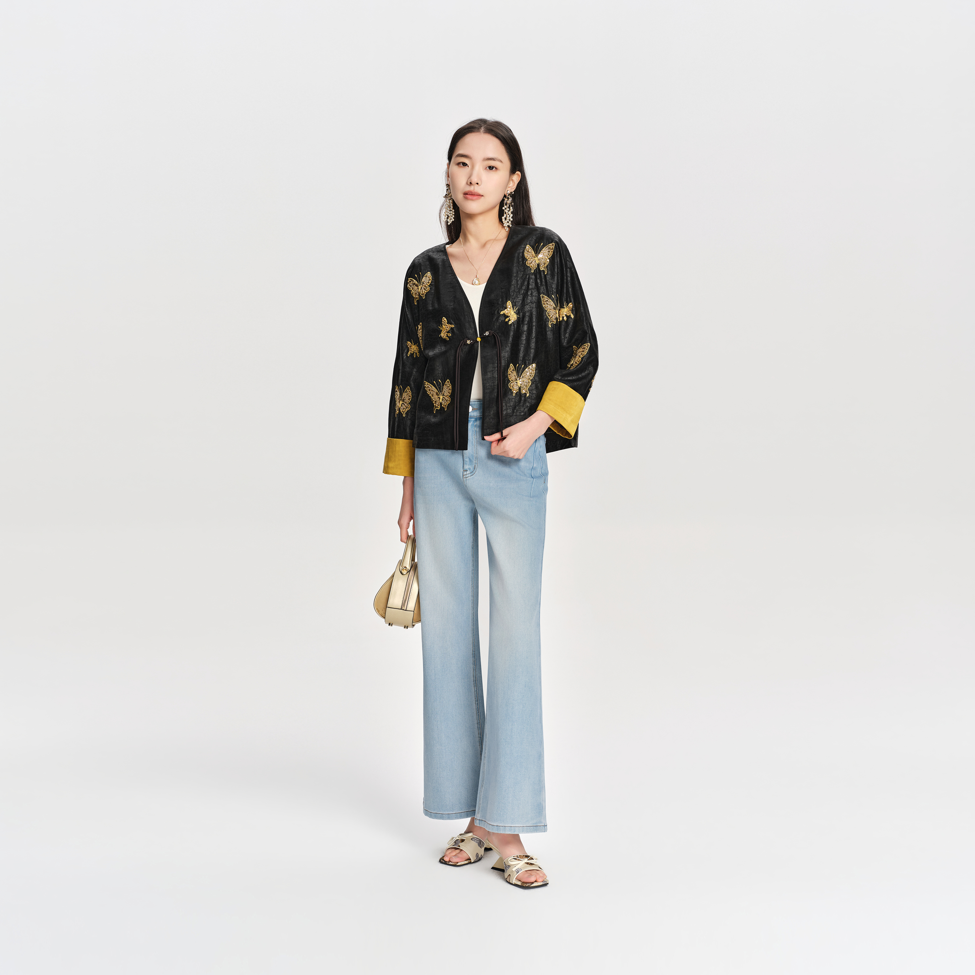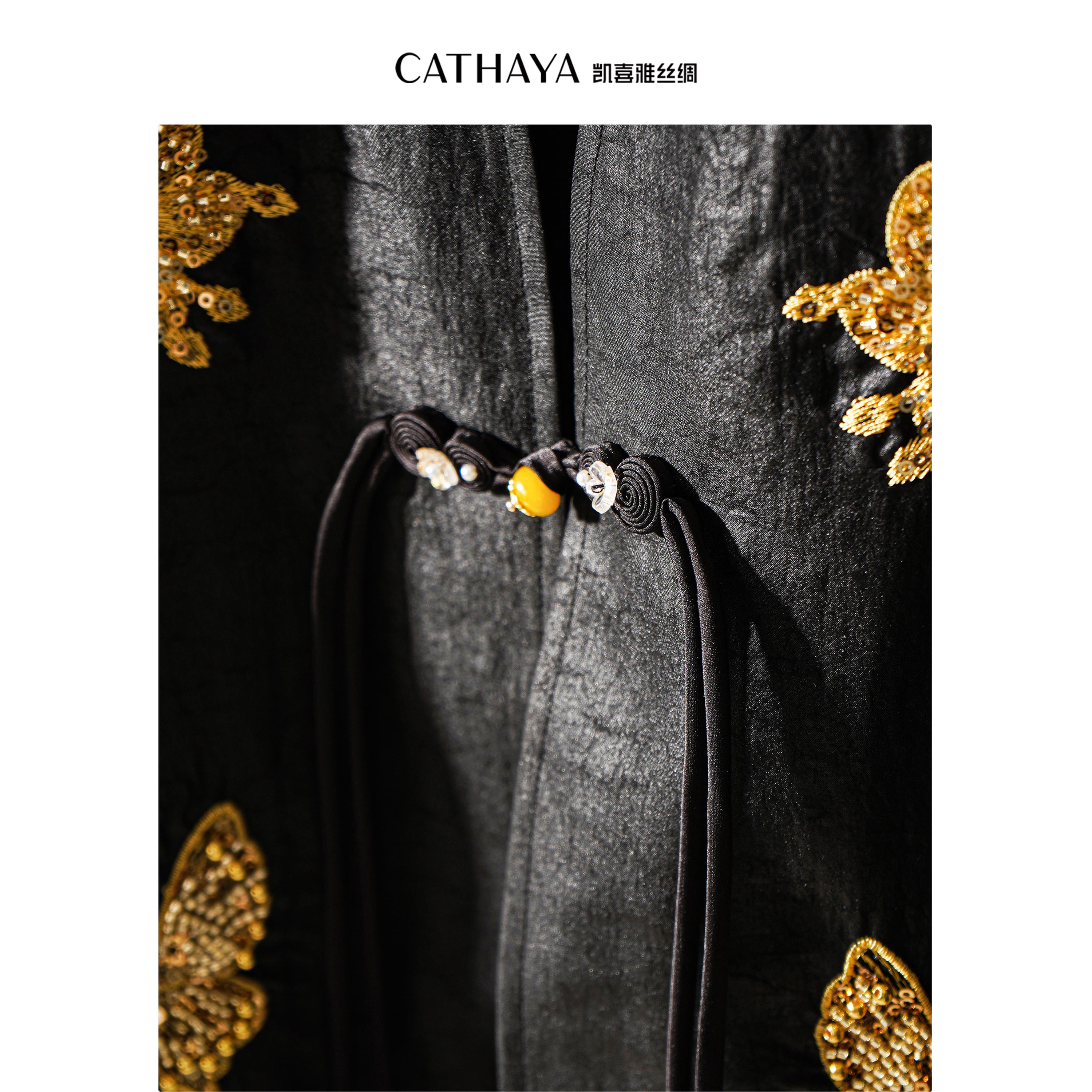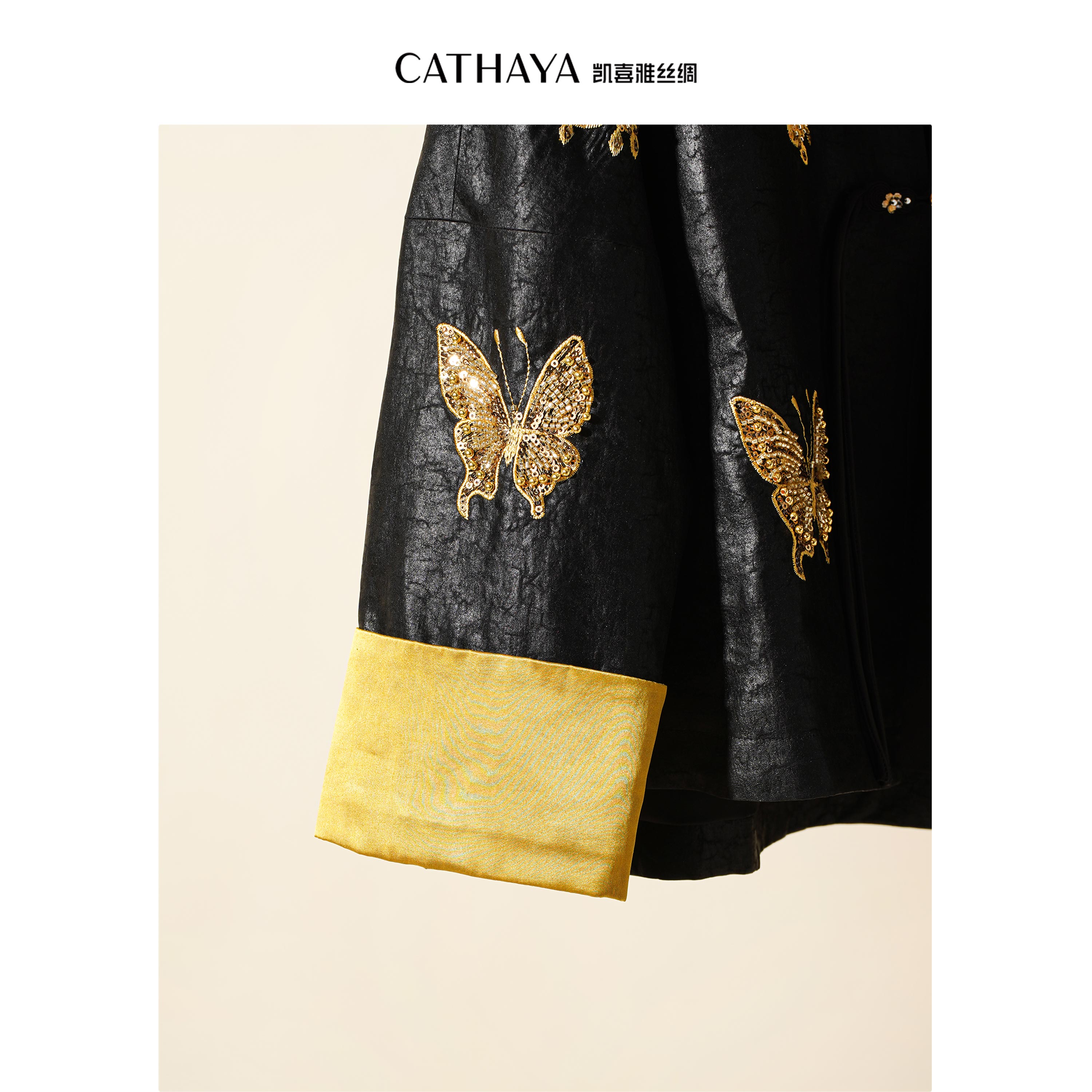 3.【东方韵味】V领搭配系带一字扣开合,单手穿脱都便捷。衣身蝴蝶与袖口撞色点缀,层次丰富,宽松廓形对身形包容度高!