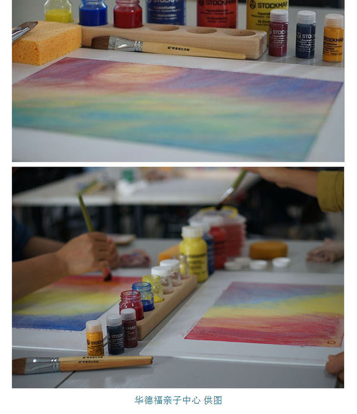华德福教育中很重要的湿水彩,即是以此水彩,经过稀释后使用。使用时,图画纸也须先浸泡过,即以湿+湿的方式,让孩子在纸上自由的玩颜色游戏可以红黄蓝三原色,自由的调配出各种其他的颜色