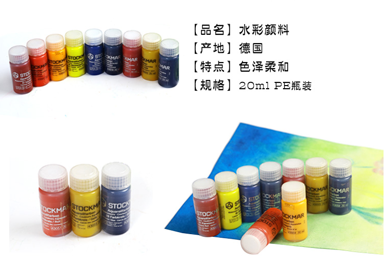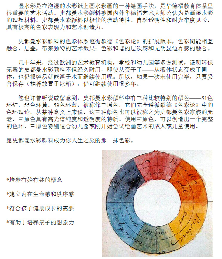 特色: 1.品质、效果、经济,具高价值性 2.100%产品保证 3.非常好的色浓度 4.色阶完全符合Goethes(哥德)色彩原理 5.保证安全商标的品质,适用各种技术 6.最适合学龄前、幼儿园、学校 史都曼水彩是透明绘画的理想材料,它们由阿拉伯树胶和细腻的抗光颜料制成,具有极高的表现力而且干透时完全保持了水溶状态。颜色色调被选择以便它们能被混合产生出所有中间色且不失光泽度和亮度。混入白色,水彩颜色能用于干湿水彩画。 色环涂料是基于色环本身的水彩。它们包括了三原色,红、蓝、黄并拥有高光谱的纯度和透明度。通过将三个色环的颜色混合,能创造出完整的色环来。 |