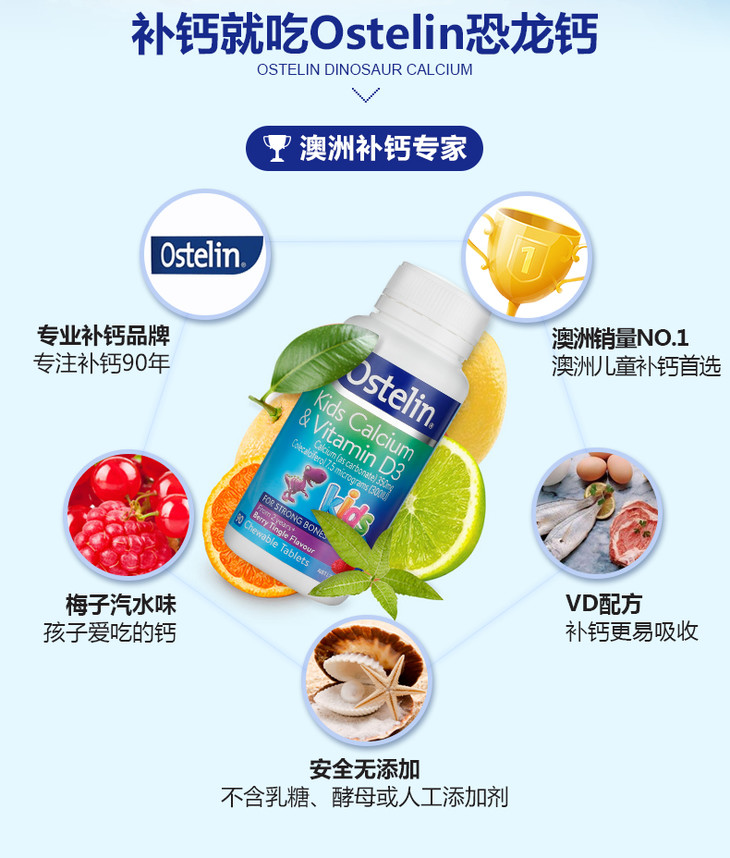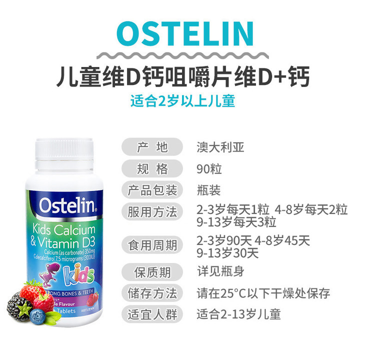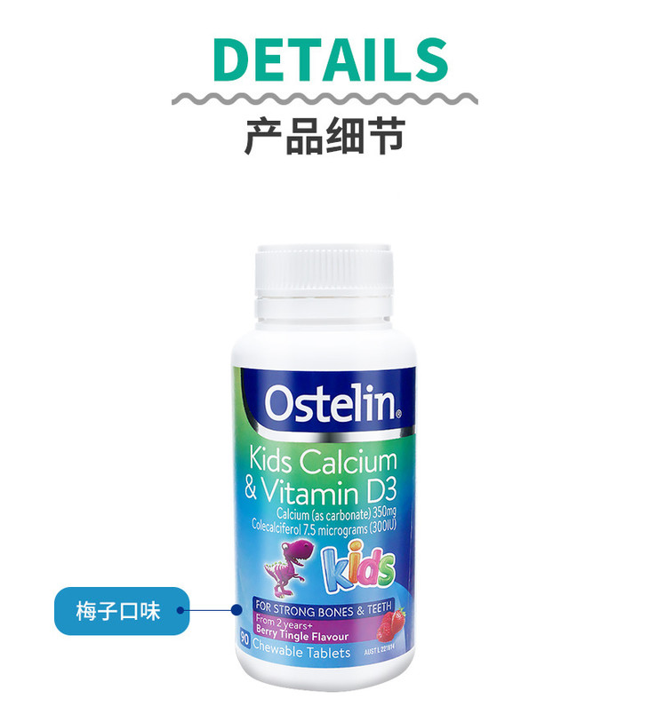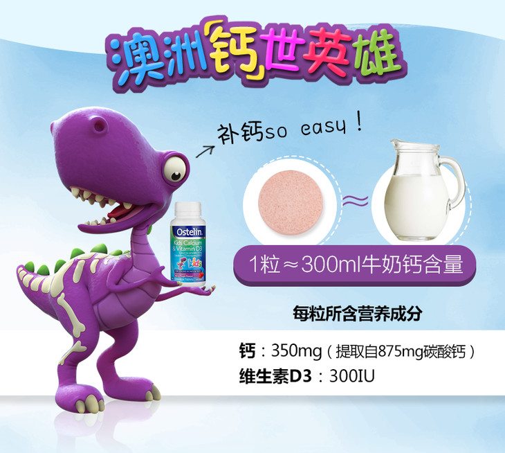【保税区包邮直发】澳洲 Ostelin 儿童钙维生素D咀嚼钙片 VD恐龙钙90粒