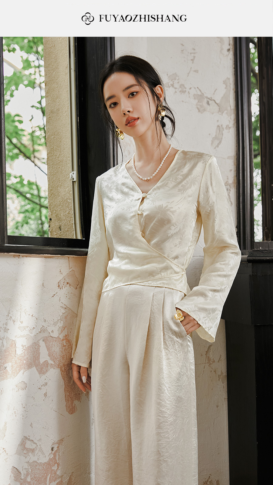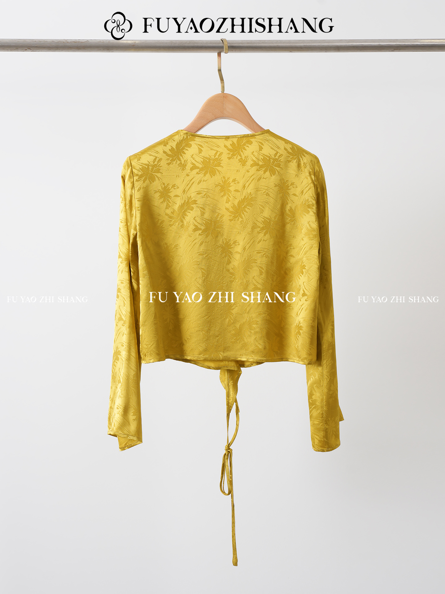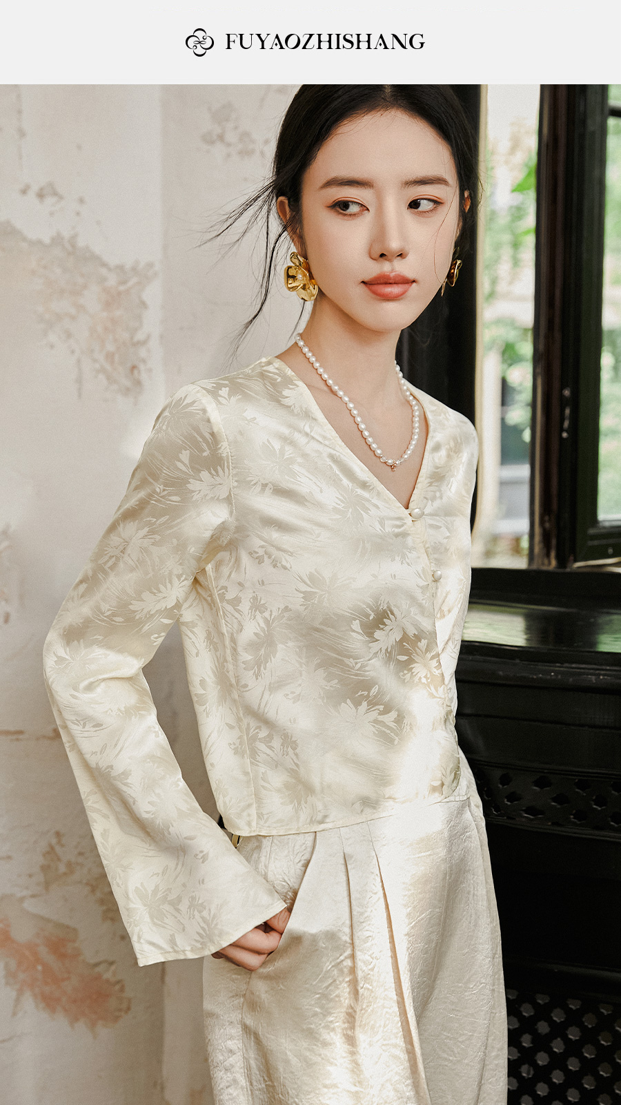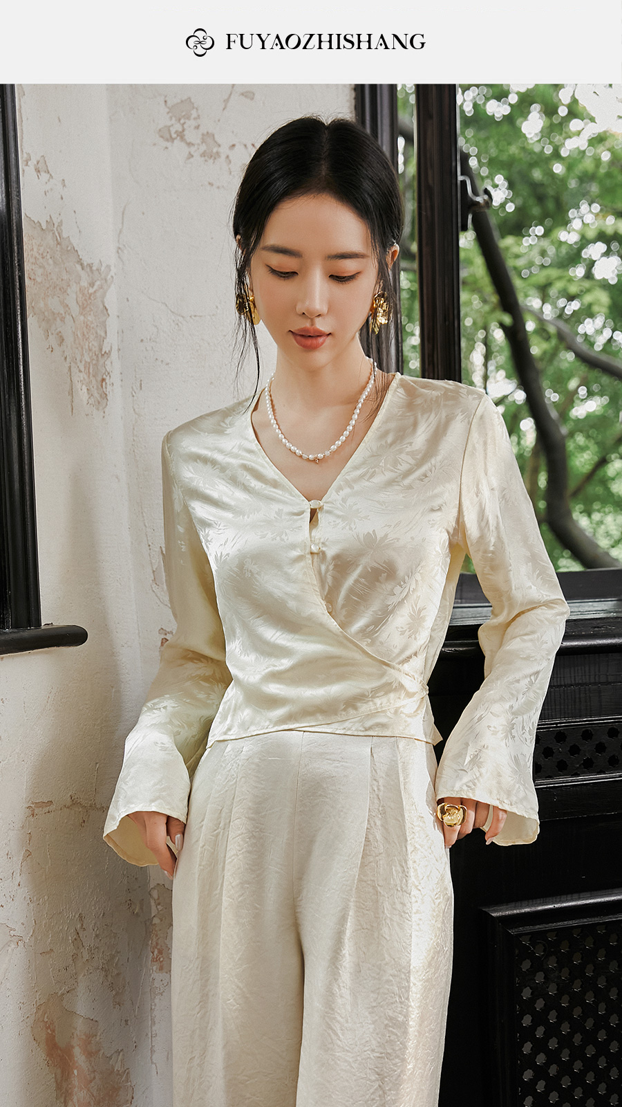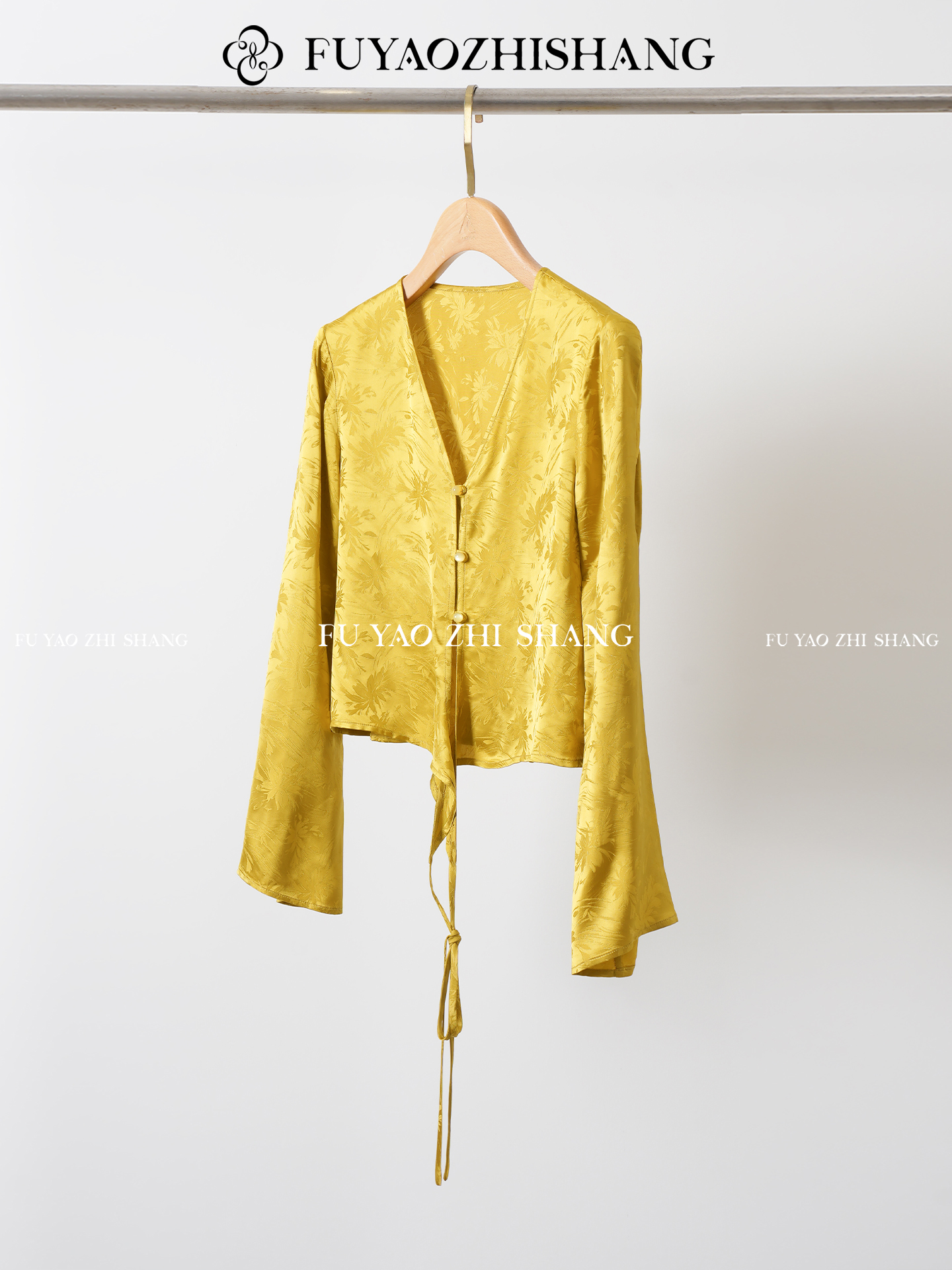 FUYAO扶摇 提花衬衫女秋季新款喇叭袖光泽感缎面上衣国风珠扣衬衣