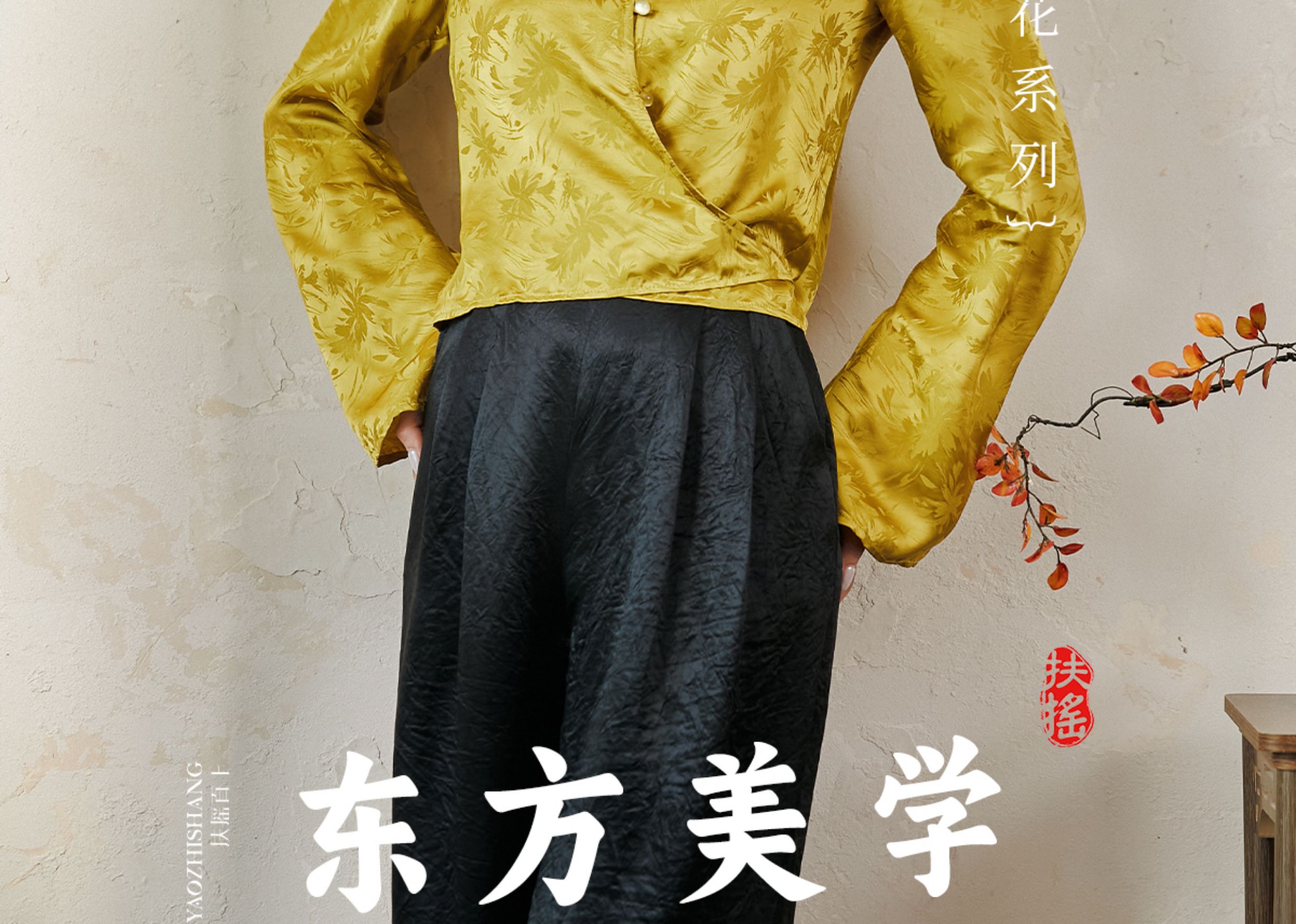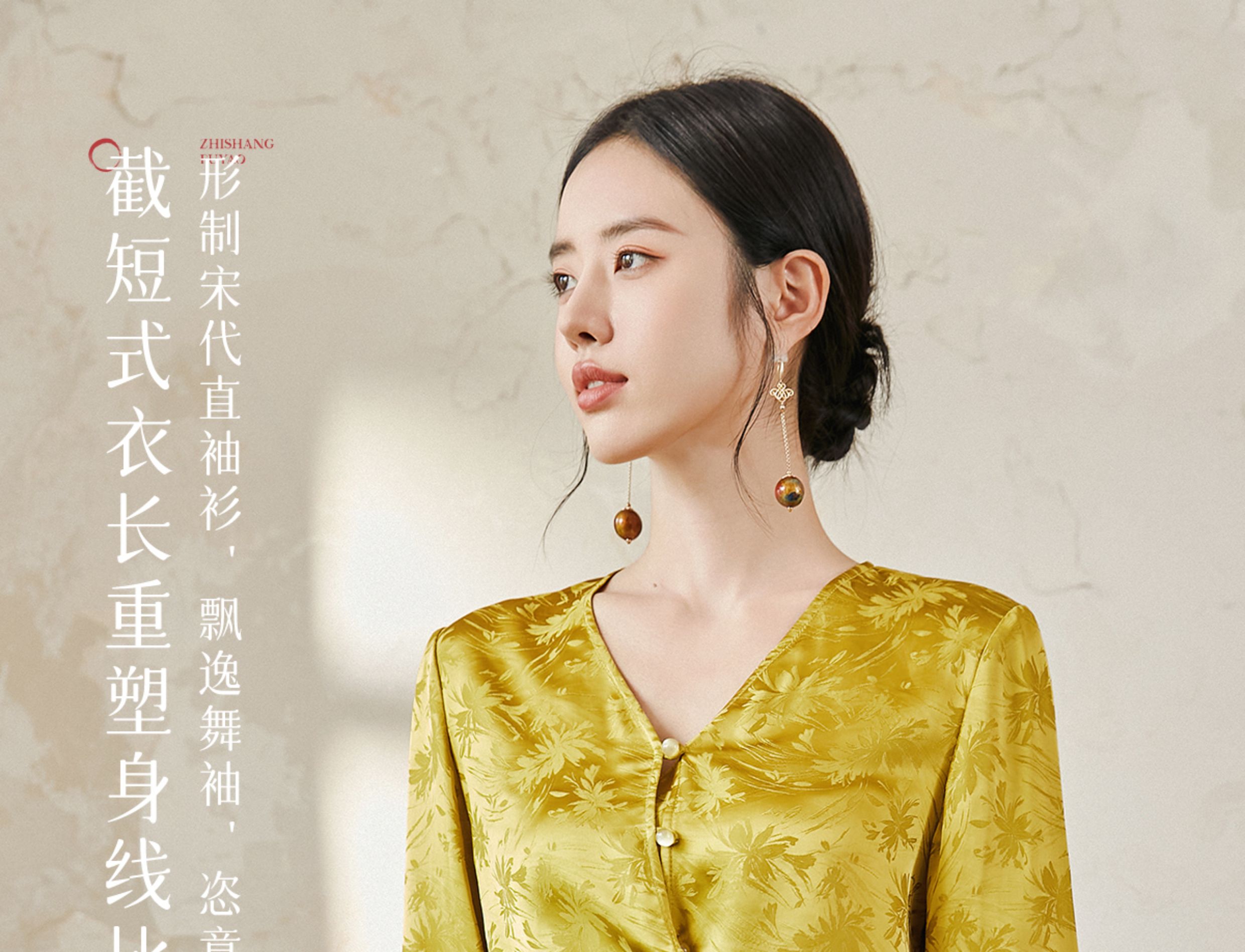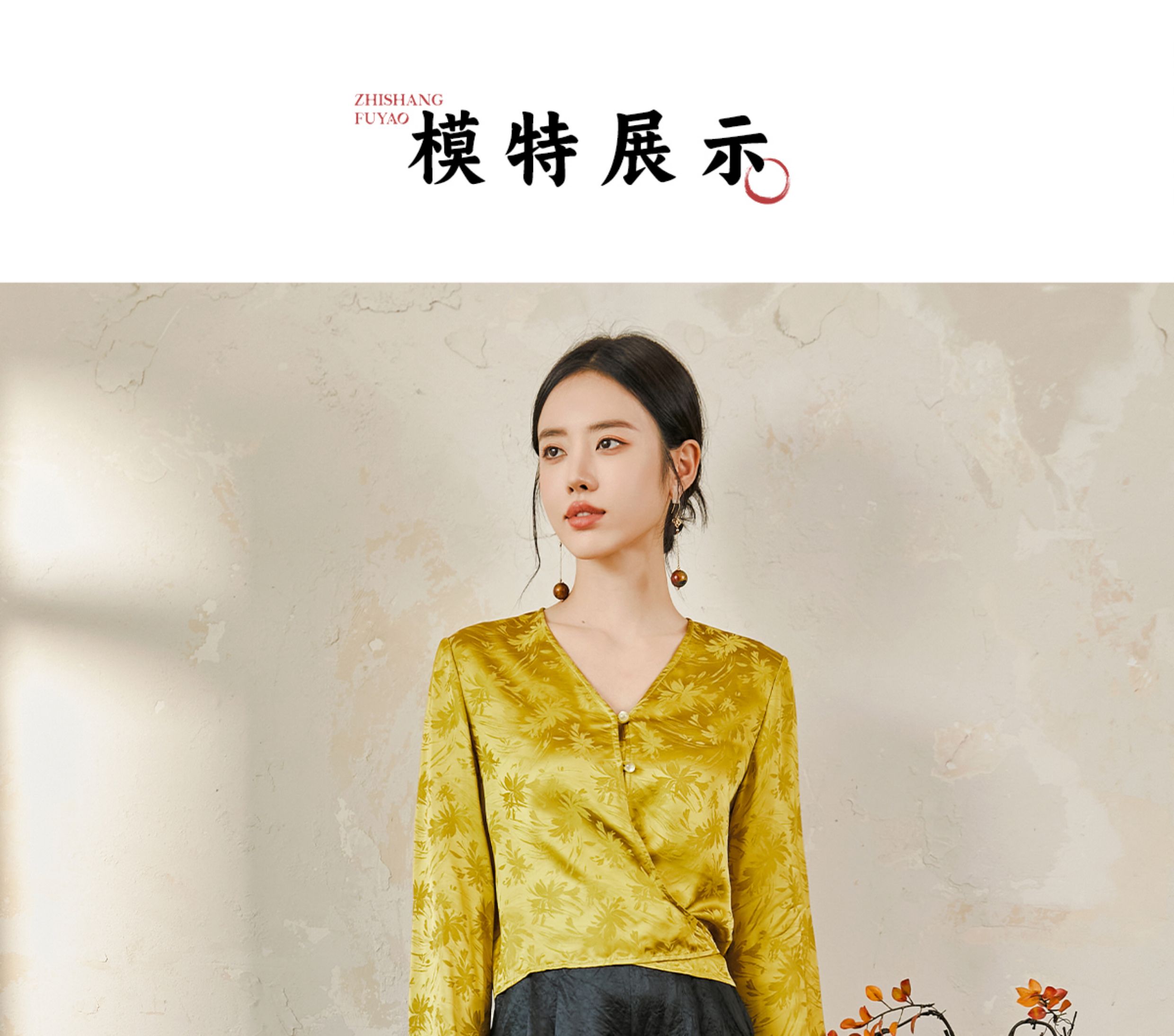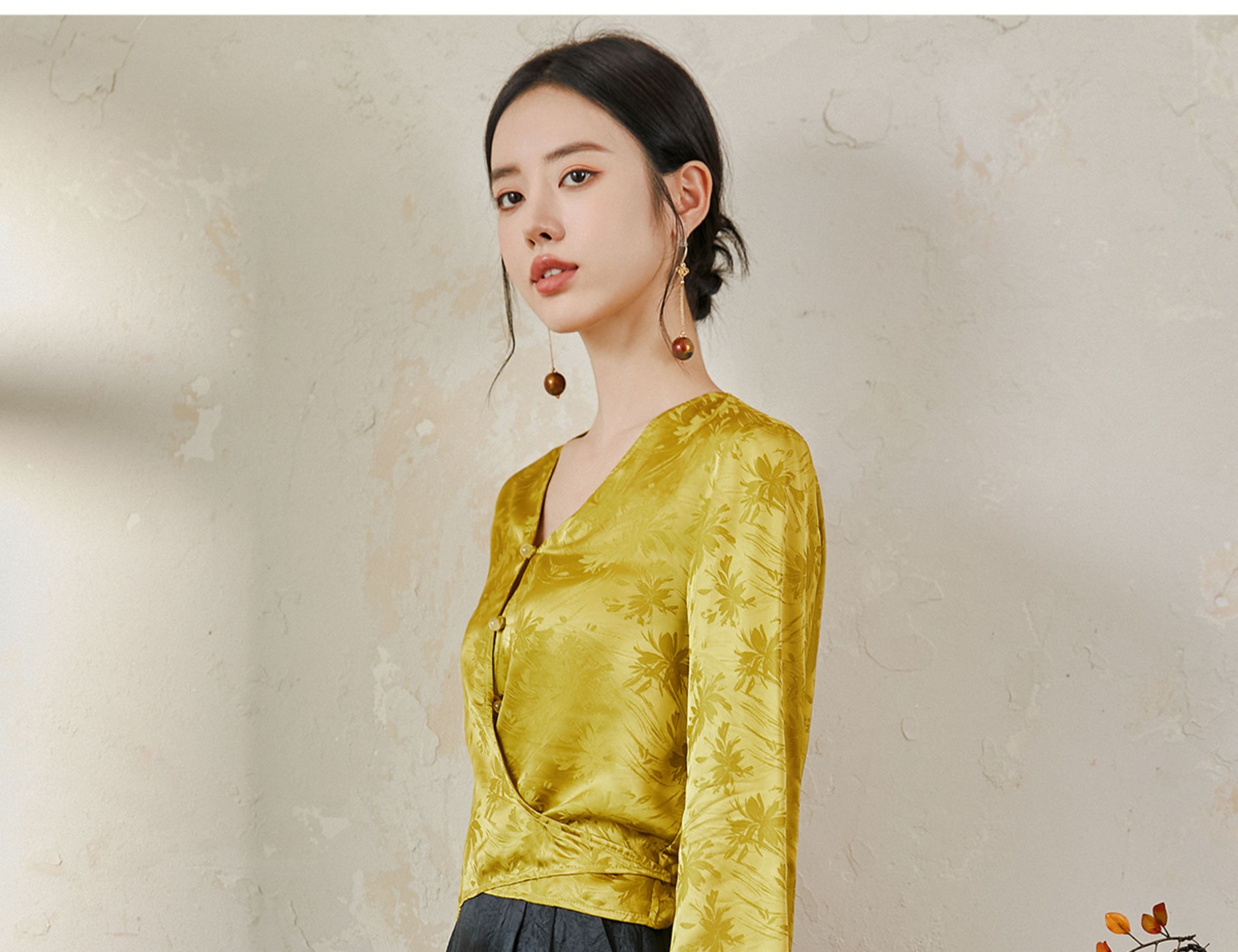 FUYAO扶摇 提花衬衫女秋季新款喇叭袖光泽感缎面上衣国风珠扣衬衣