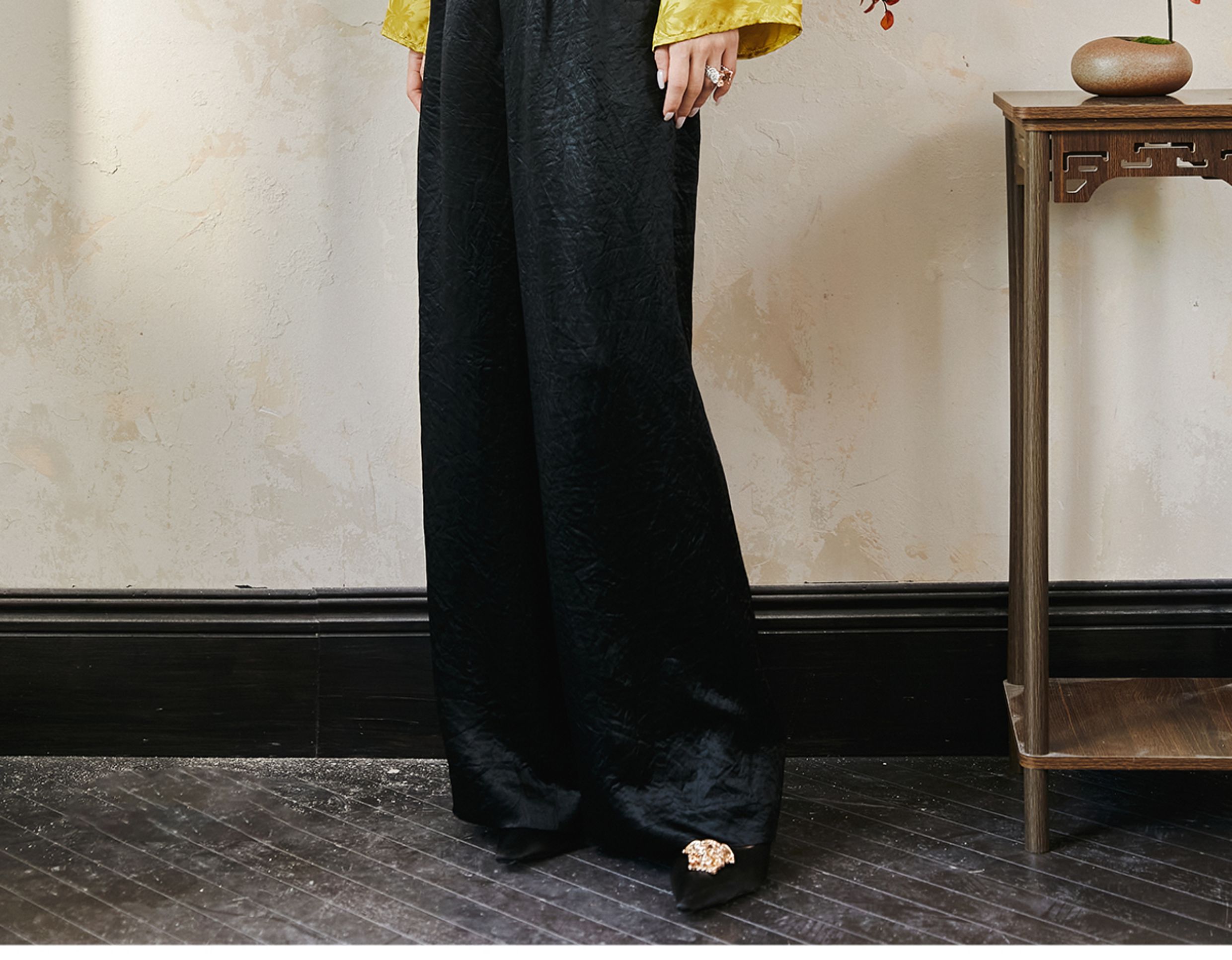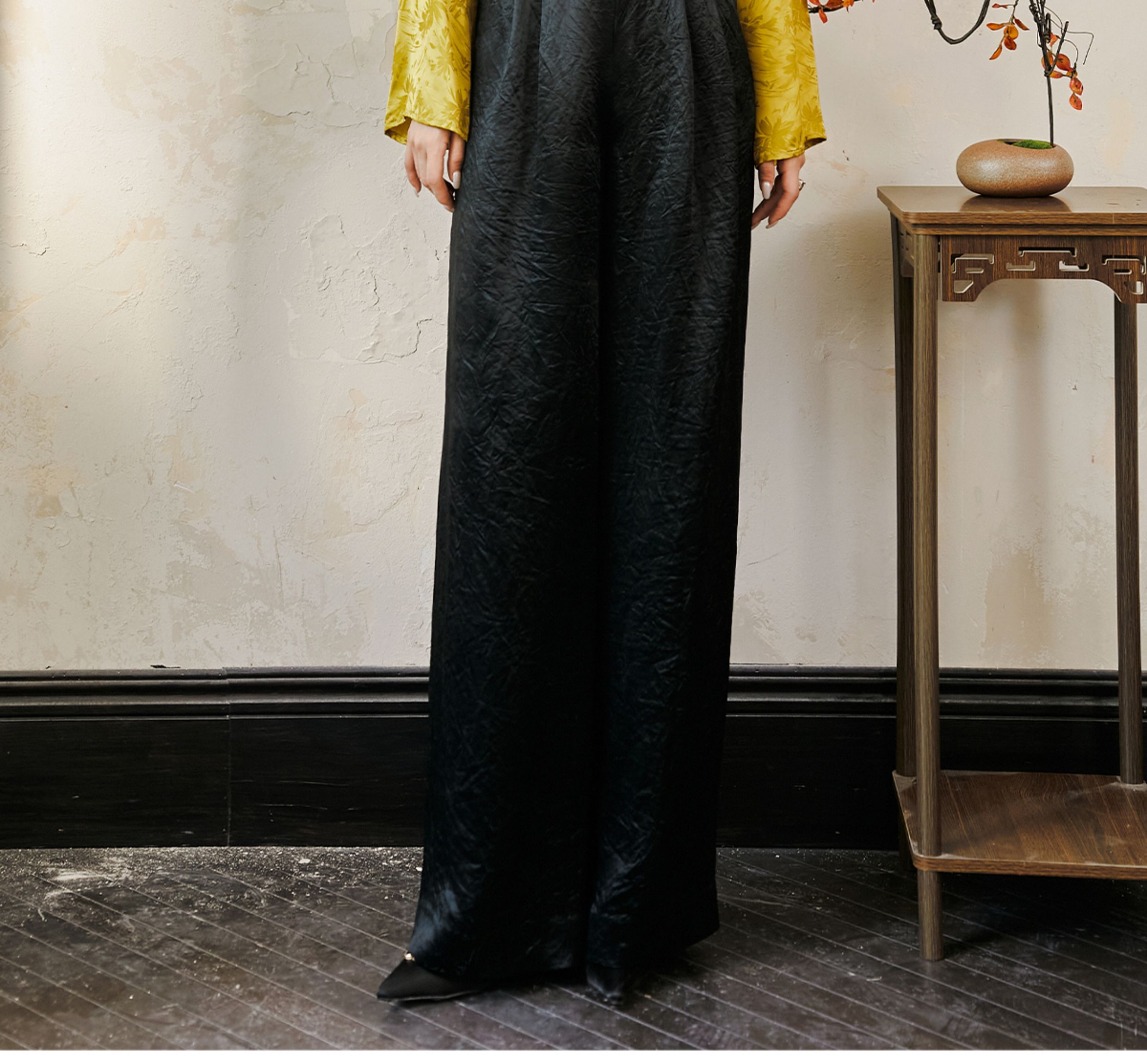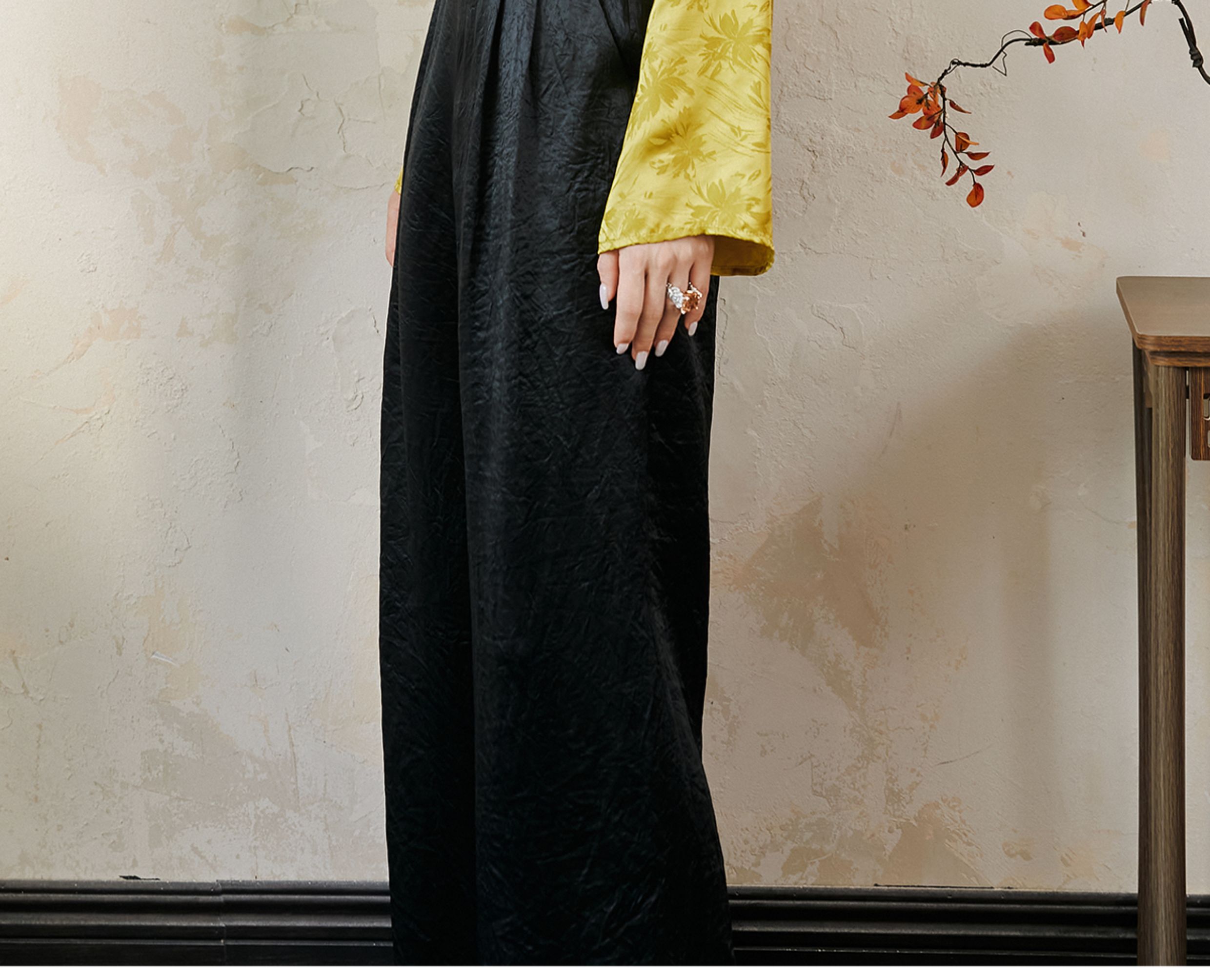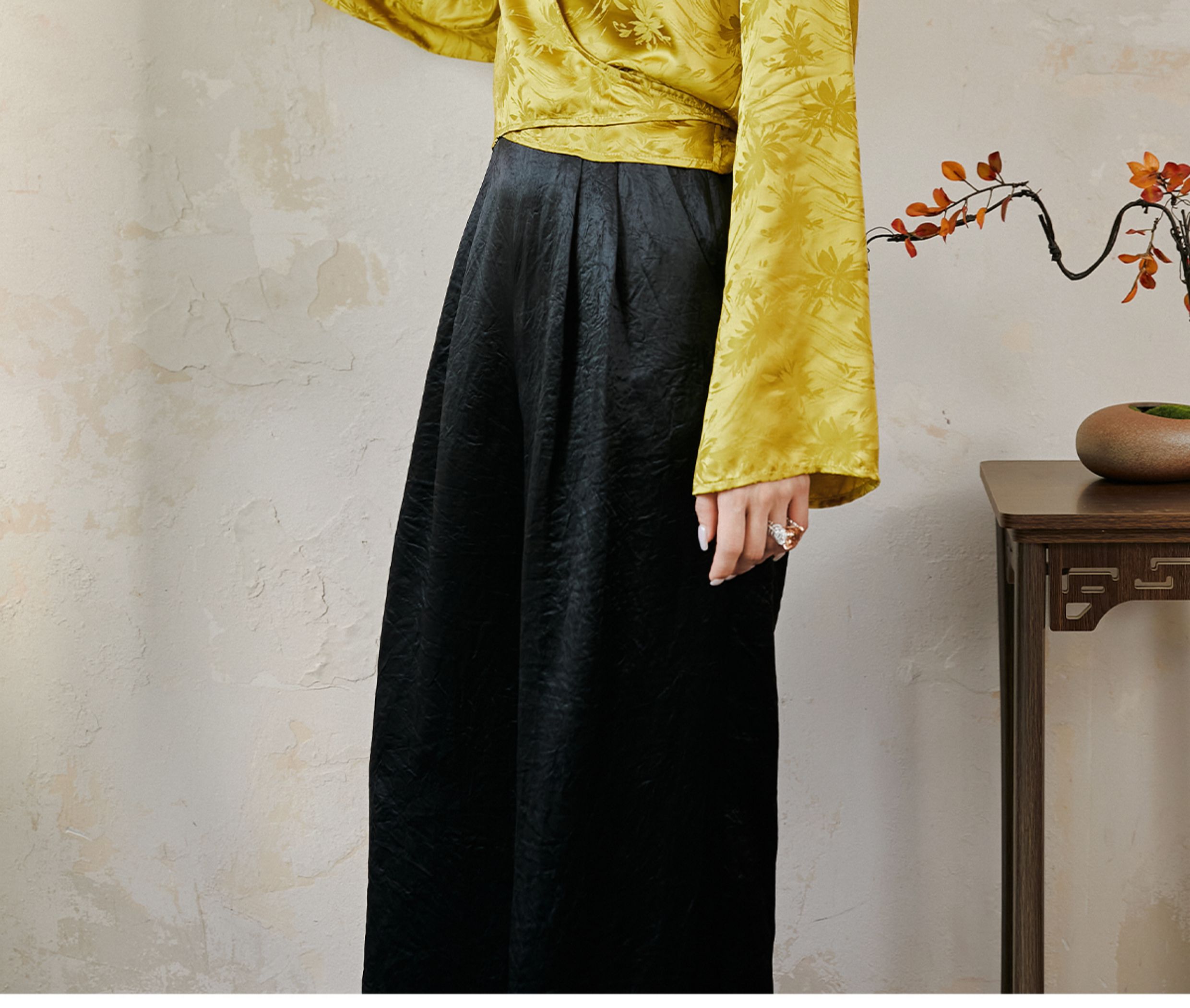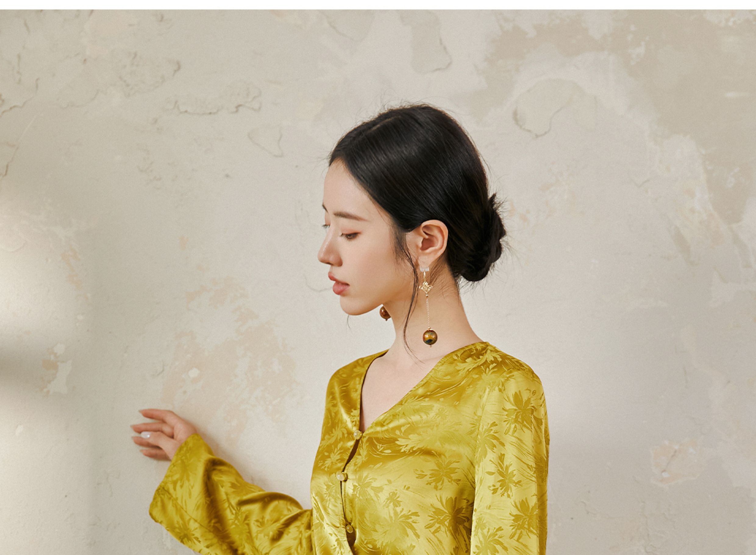 FUYAO扶摇 提花衬衫女秋季新款喇叭袖光泽感缎面上衣国风珠扣衬衣