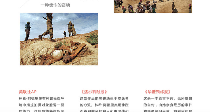 她以第一视角向你展示从未见过的真实战争:战争并非非黑即白,战争它既不是你想象的样子,也不是电影电视里面的样子。一次次的恐惧和震惊让她变得更加成熟和坚韧——她从巴基斯坦、伊拉克、阿富汗、利比亚的战火中幸存;她亲身探访海盗的“故乡”索马里;她在非洲的苏丹、刚果、乍得等人道主义灾难之地带回来出色的报道,震撼和唤醒了沉溺于安逸生活的都市人群。