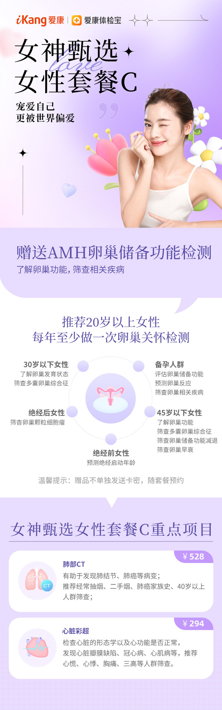 【升级心脏彩超+胸部CT】爱康 女神甄选体检套餐C(含AMH卵巢功能检测-适用于20岁以上女性)
