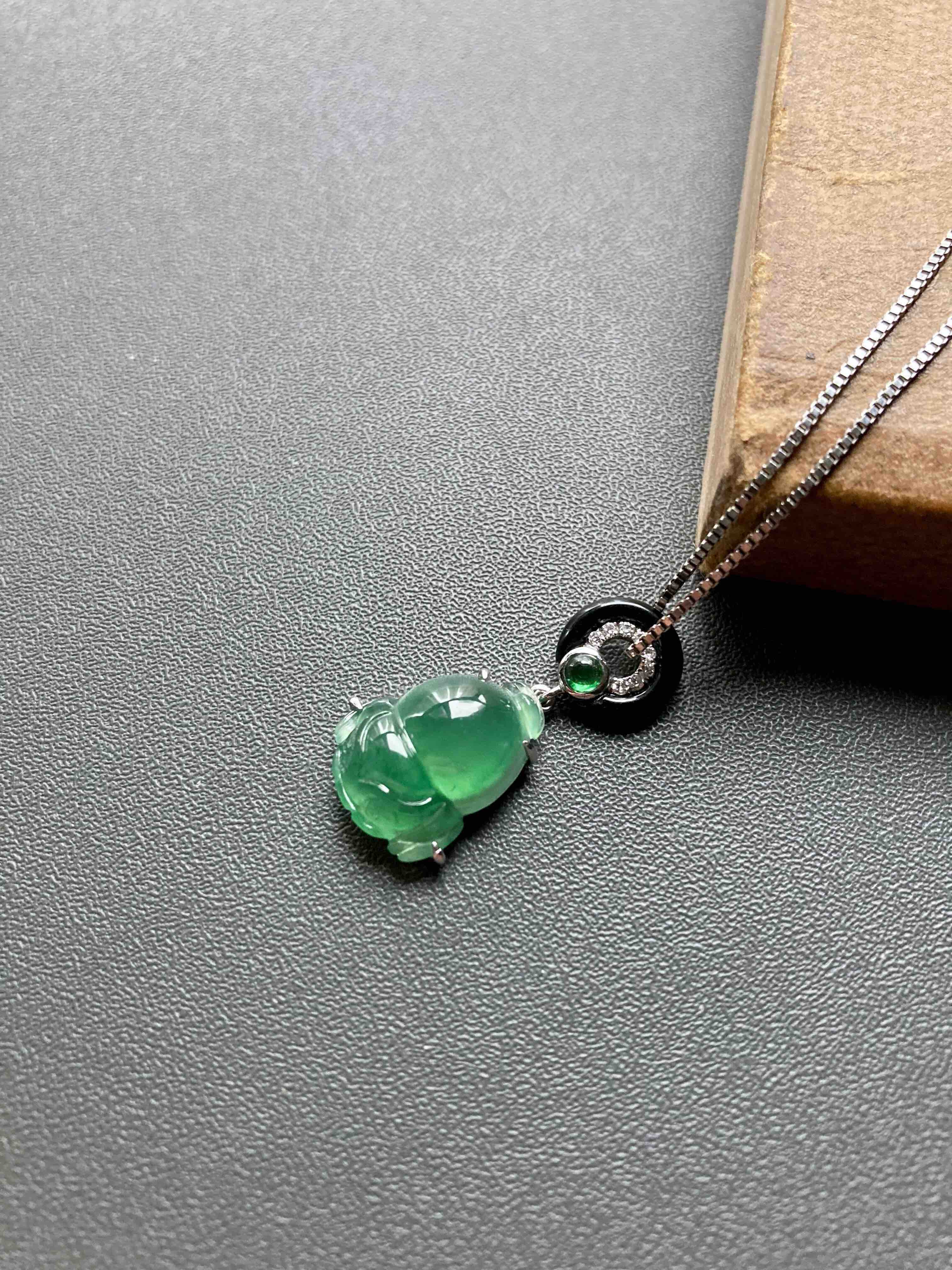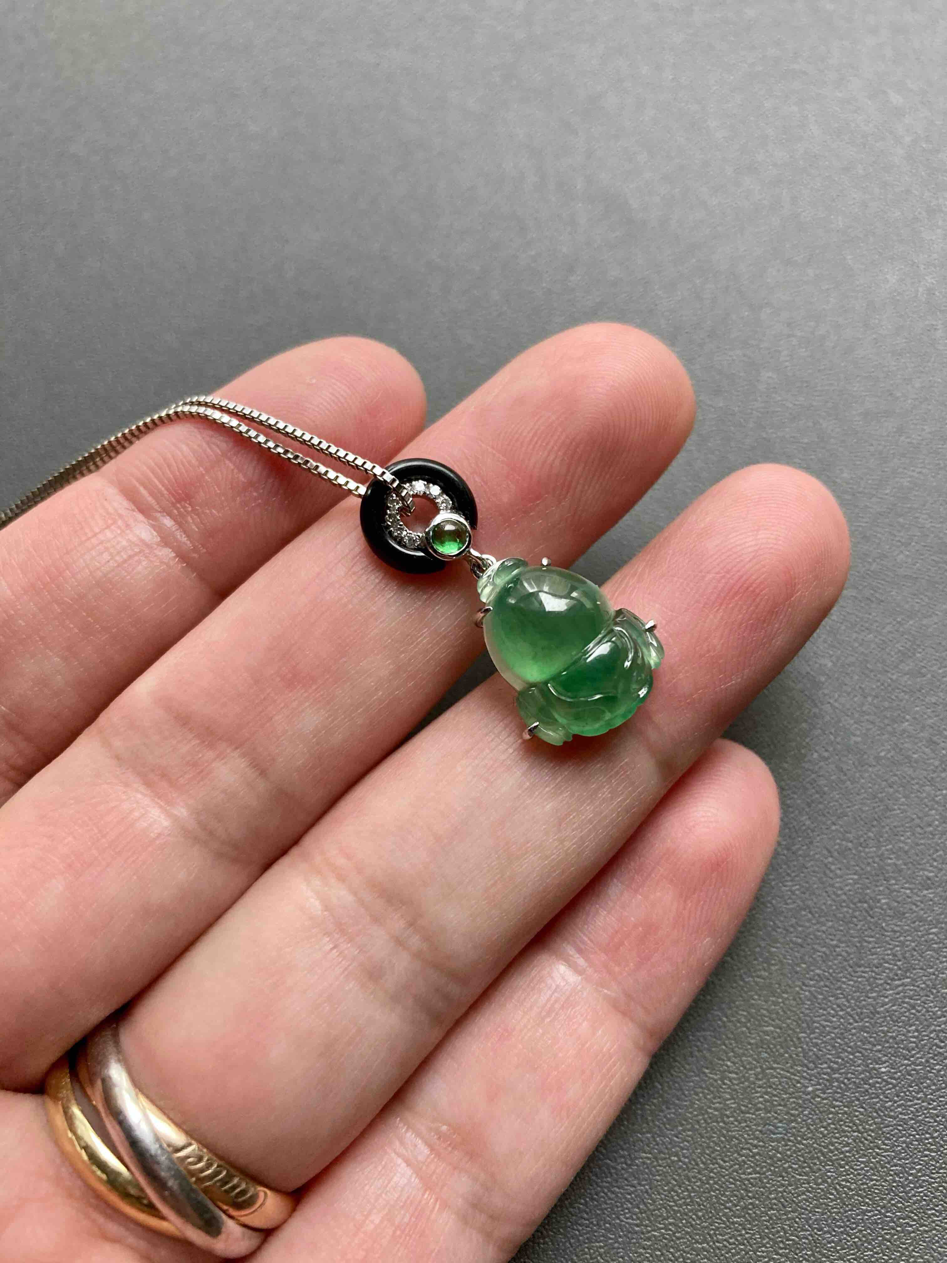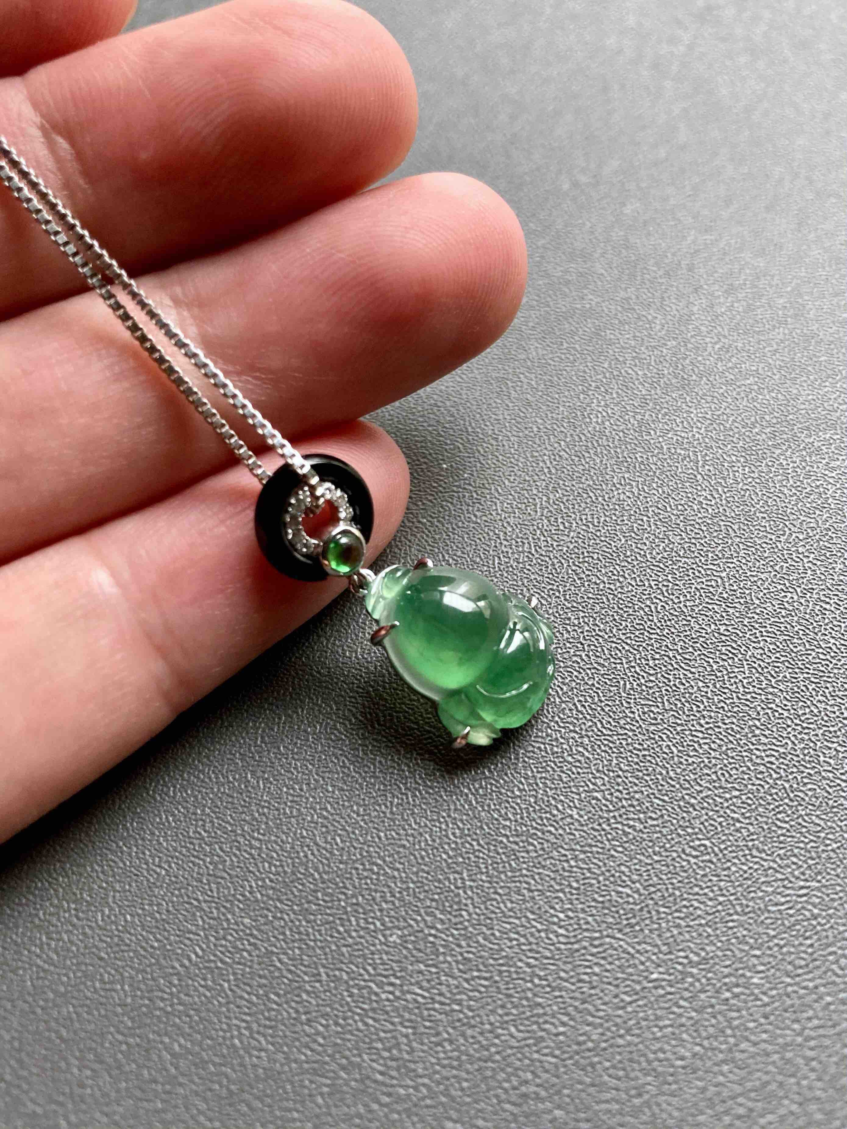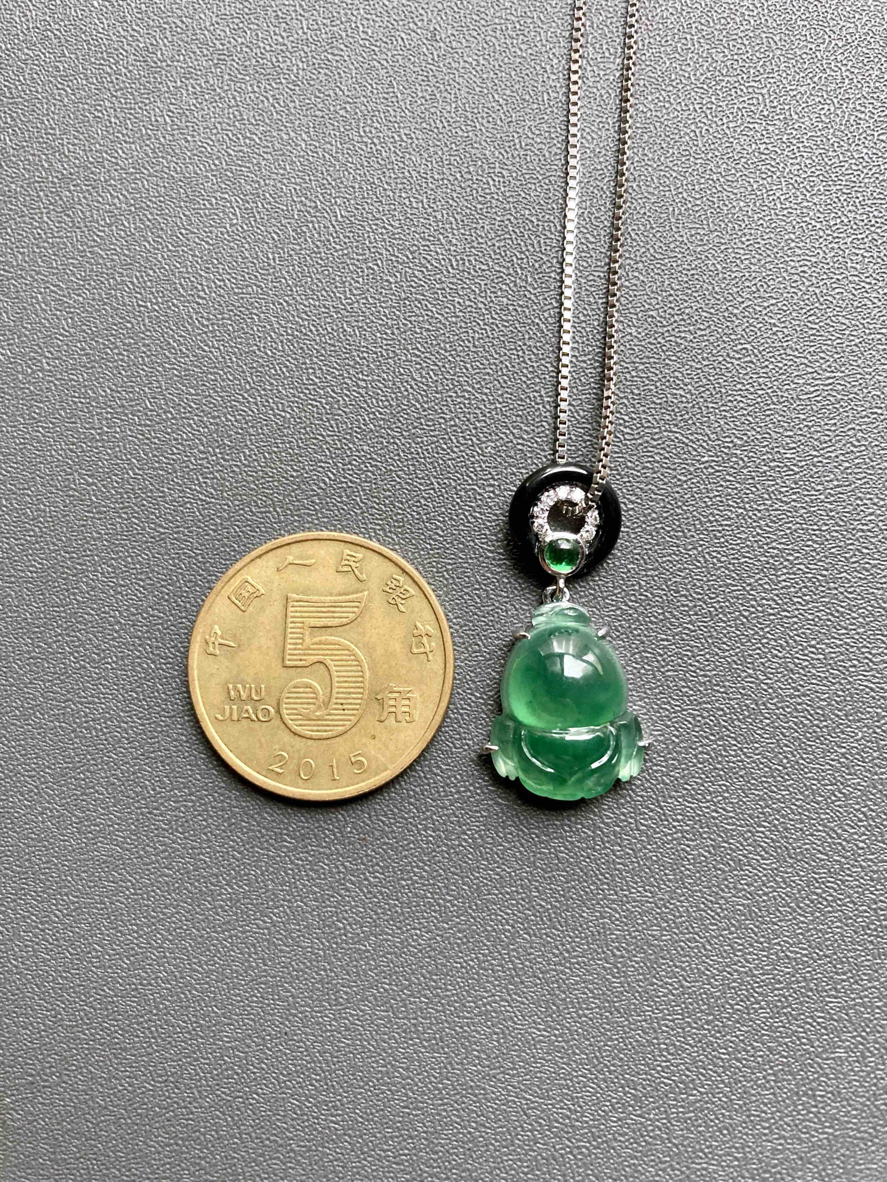 稀有品,市面上非常少见的厚庄高冰种湖水绿,深邃的颜色近乎蓝水,荧光四射,简直是一个光球,雕刻的是三足金蟾,金蟾14.1×11.2×5.8mm,镶嵌后25.3×12.8×6.2mm,镶嵌设计也是超特别,18k白金钻石黑玛瑙镶嵌,别具一格,实在太好看啦,值得收藏的标本级精品
